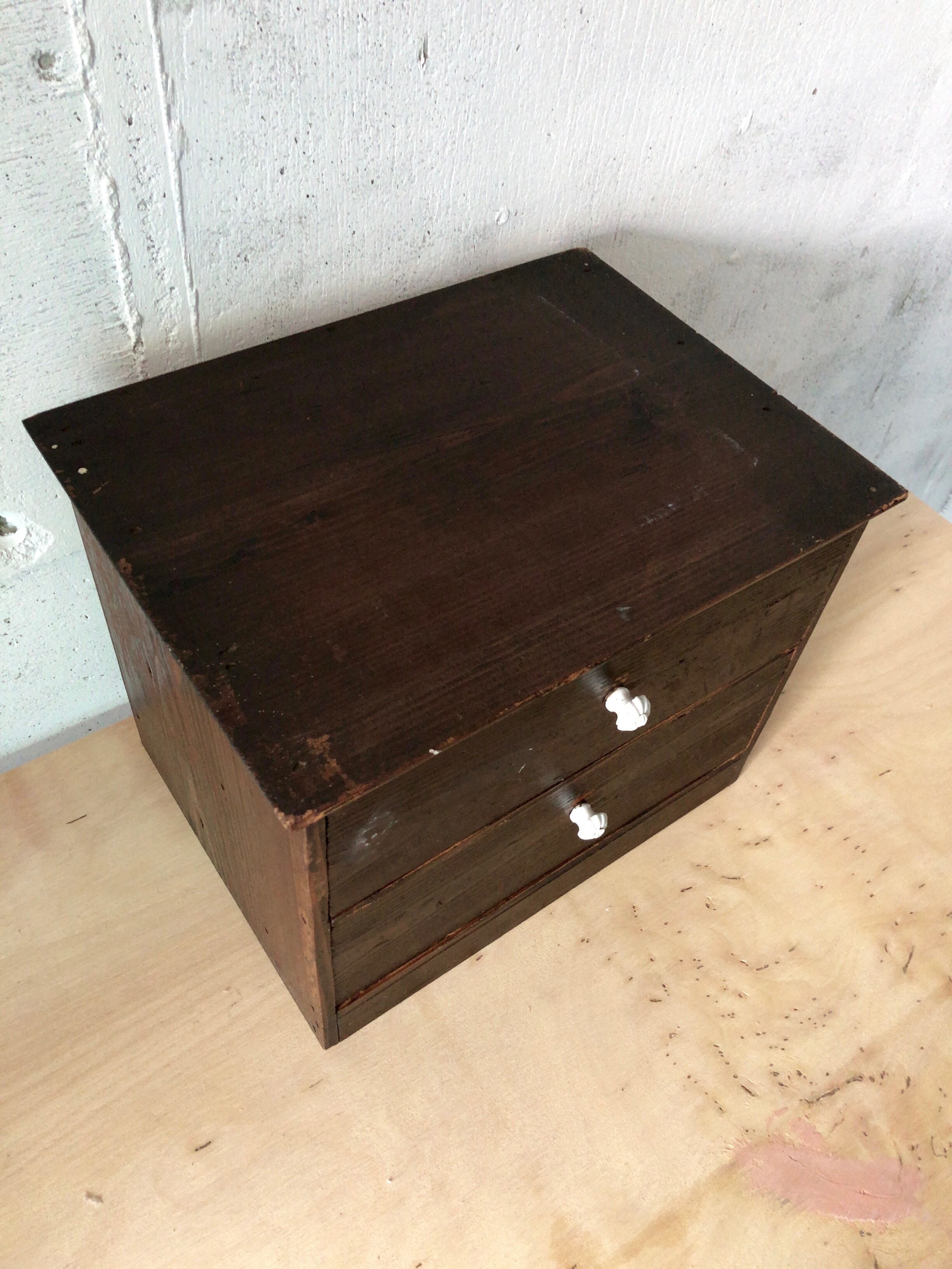 古い小引出しになります。スレや当たりキズ、欠け、割れ、落としきれない汚れなどがあります。引出し中は少し汚れがありますが、開閉は比較的スムーズに行え日常気軽にお使いいただけます。全体的に状態も良く、まだまだ実用的にお使いいただけます。