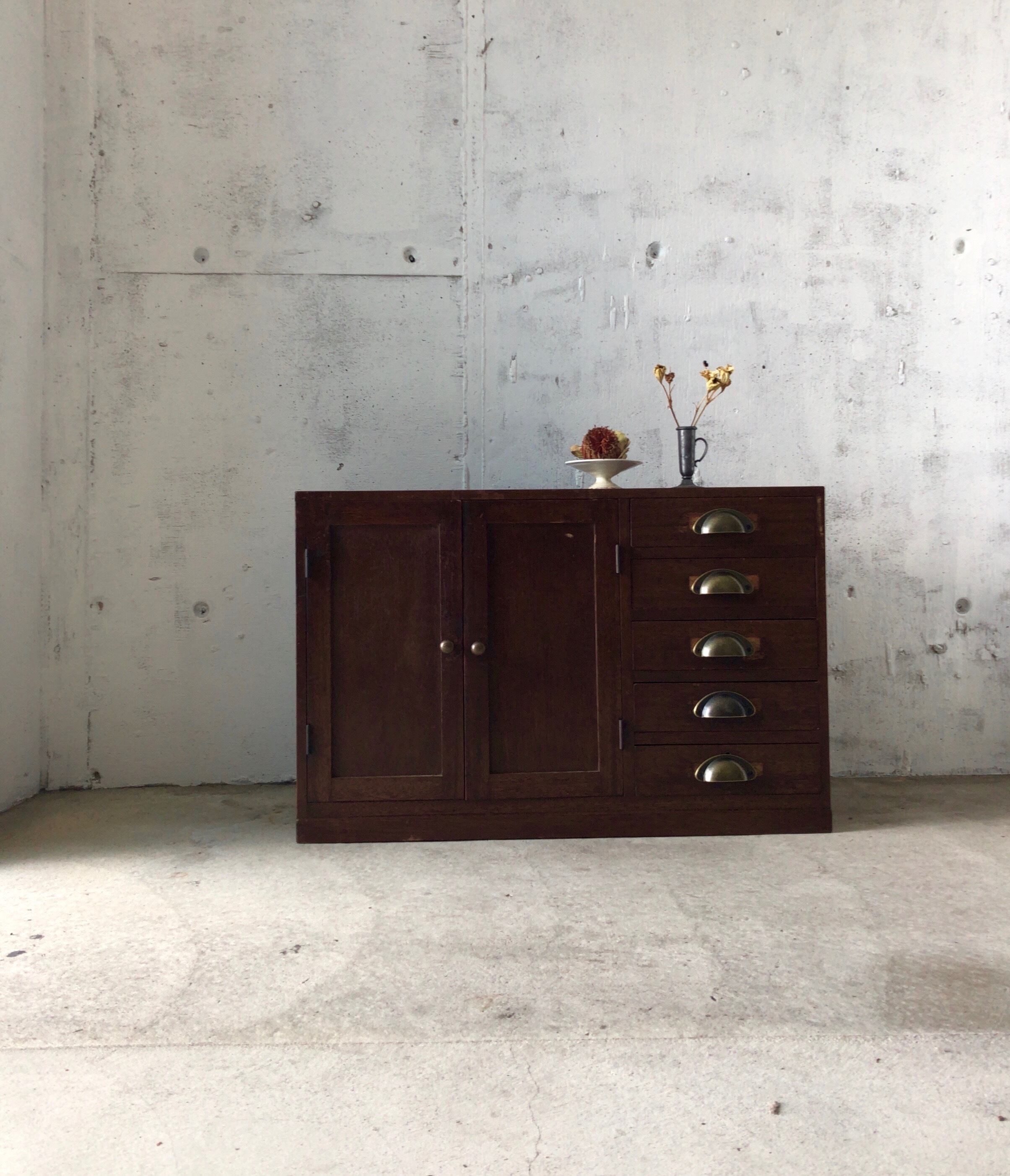 経年変化の使い込まれた木の風合いと味のある真鍮取手が魅力的な収納棚。収納力もたっぷりで使い勝手も良いです。扉、引出しの開閉も比較的スムーズに行え、日常気軽にお使いいただけます。キッチンで小皿などの食器のストック棚に使ってみたり、リビングで本や小物、紙物などの整理に使ってみても素敵です。お部屋に合った使い方でいろいろとお楽しみください。