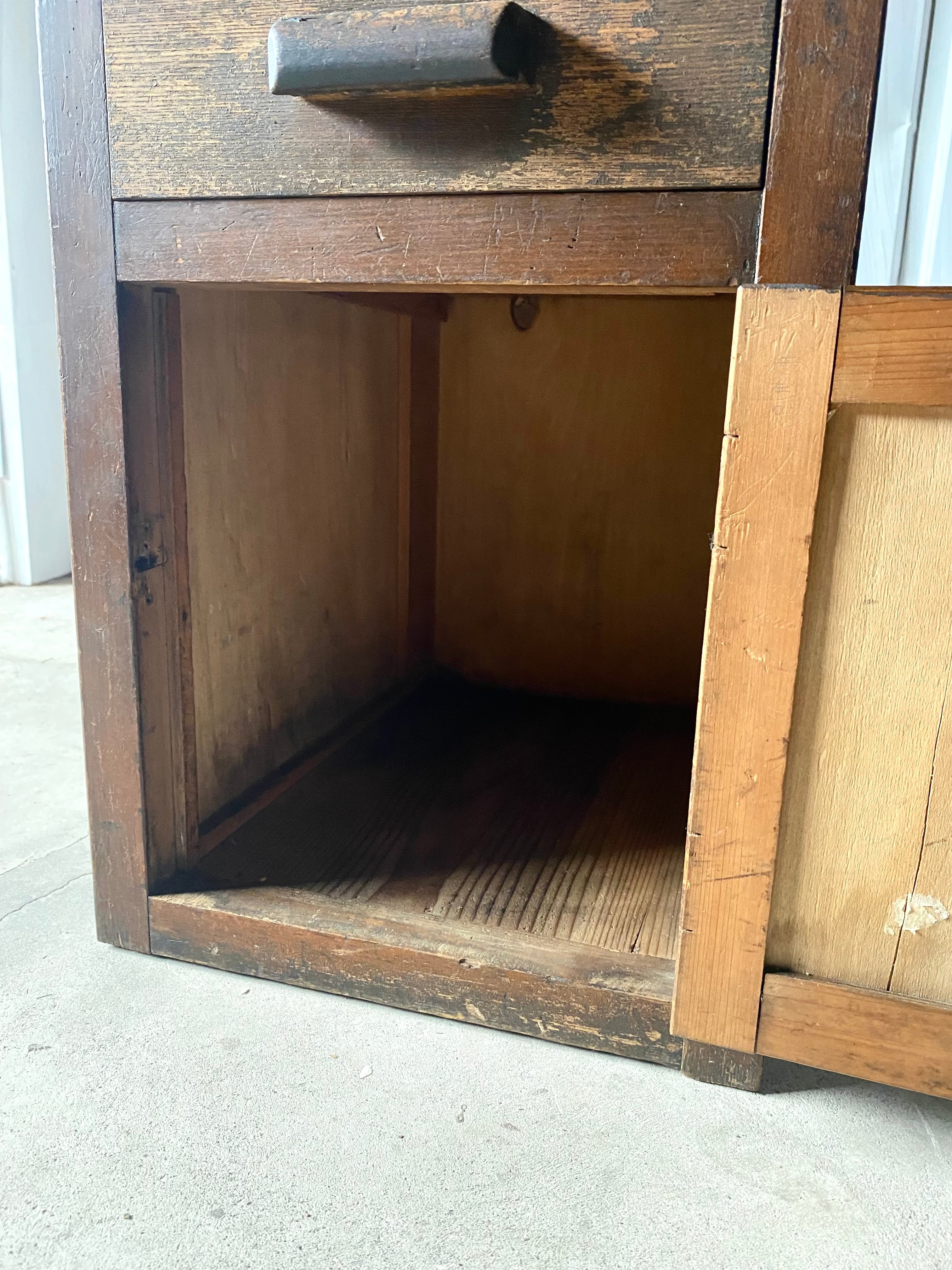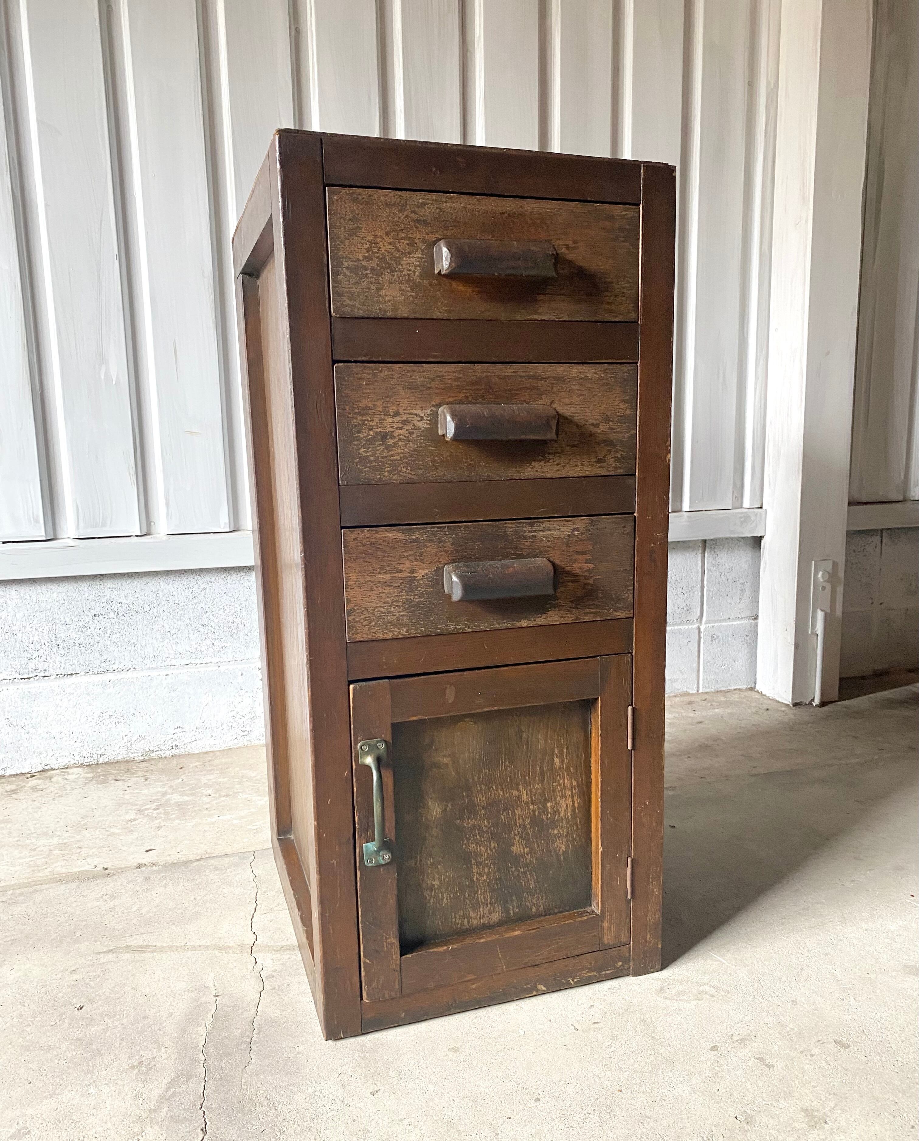 古い収納棚になります。スレや剥げ、反り、欠け、割れ、当たりキズ、サビ、落としきれない汚れなどがあります。引出し、扉の開閉はスムーズに行えます。全体的に状態も良いのでまだまだ実用的に活躍してくれます。