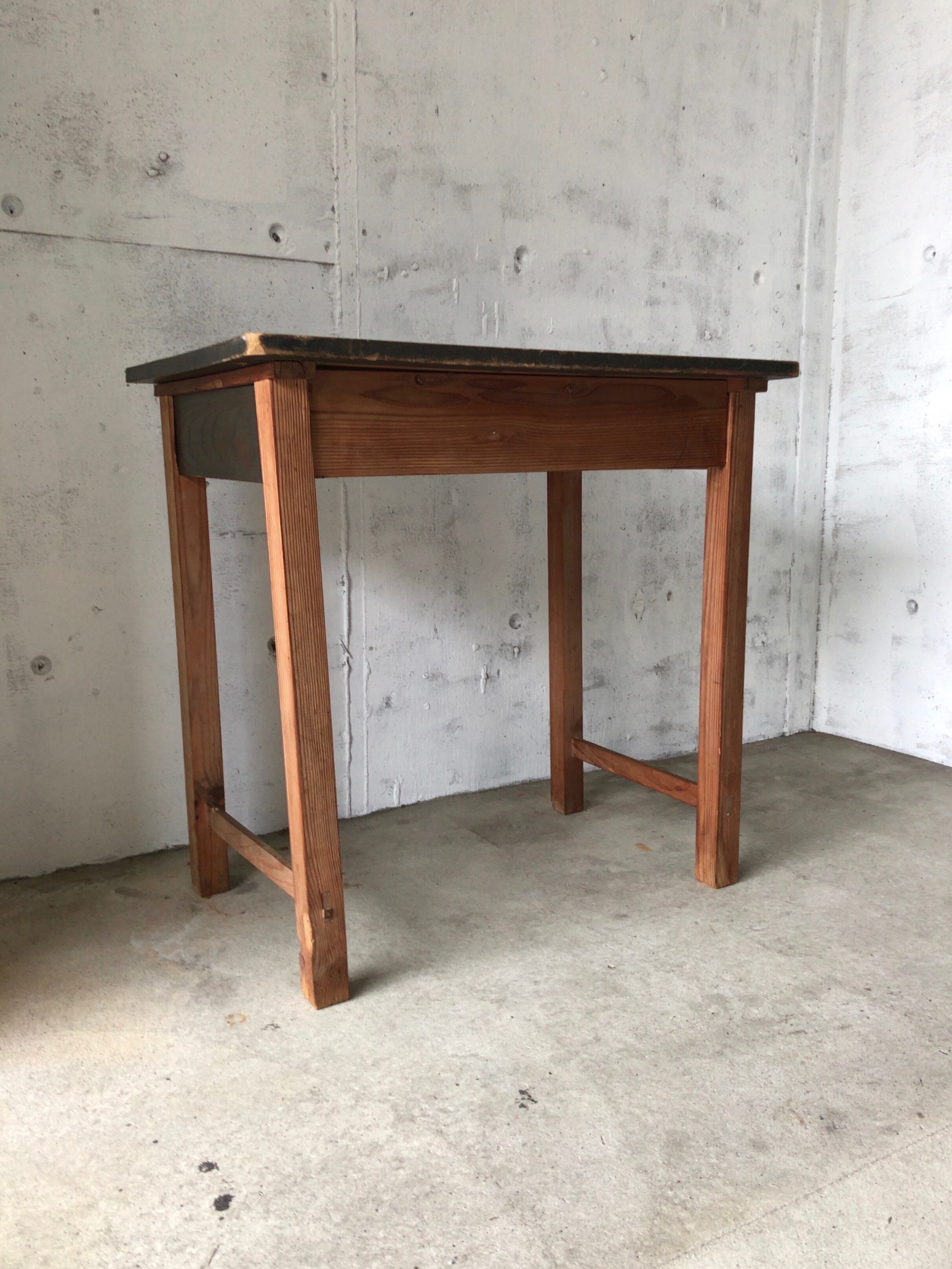 経年変化の良い木肌、雰囲気のある取手が感じ良い木製テーブル。少しぐらつきはありますが、状態は良好です。実用使いで作業テーブルとしてや、お子さんの勉強机としても素敵です。お部屋で小物や植物を飾る台としても素敵にお使いいただけそうです。