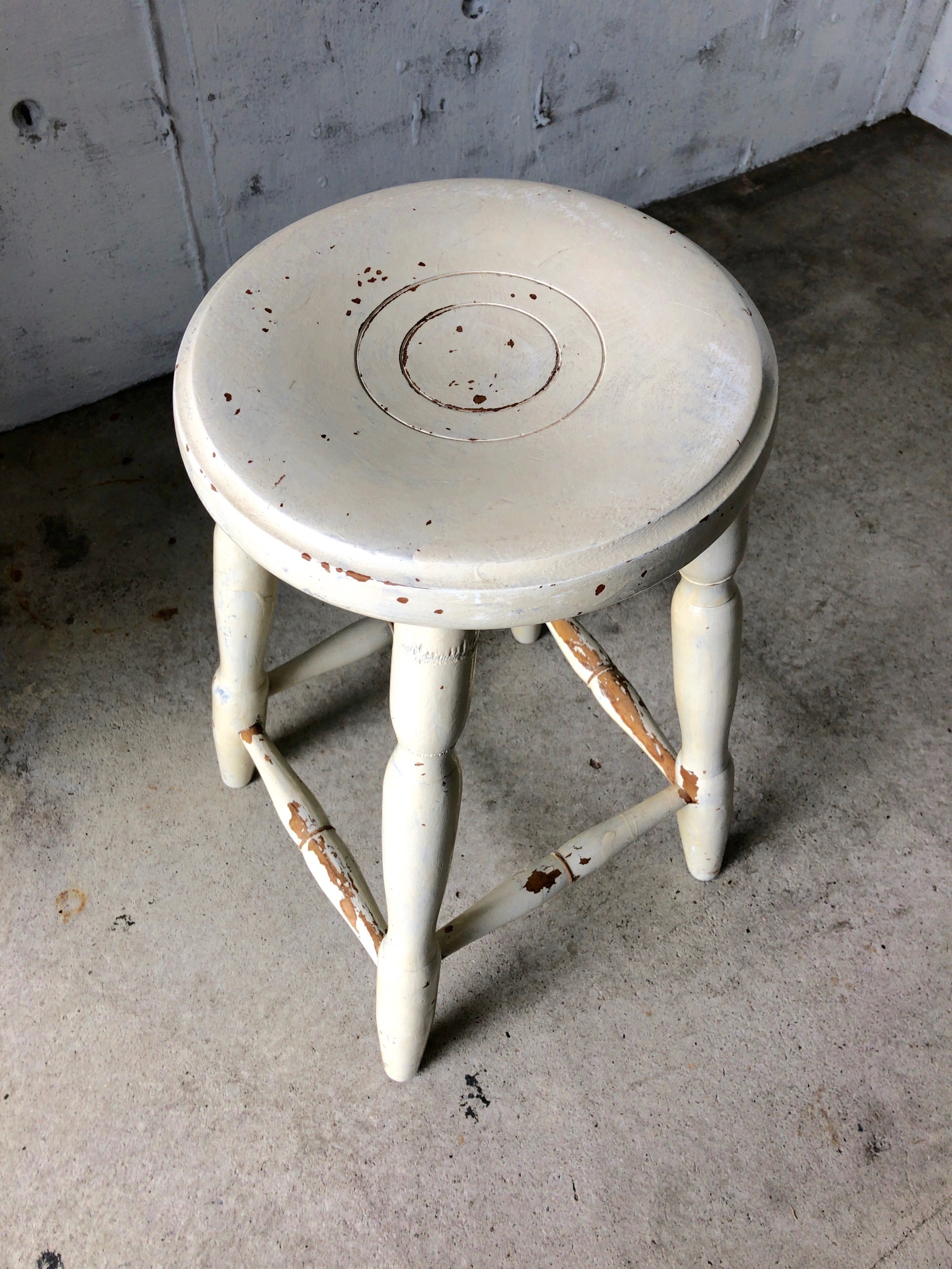 程よく禿げた白ペイントが感じ良いシャビーな木製のスツール。シンプルなデザインでお部屋にもすっと馴染んでくれそうです。少しがたつきはありますが、状態は良いです。実用使いでアトリエや食卓用の椅子、お子さん用の椅子、キッチンや玄関先で腰掛け椅子、ディスプレイ台として植物を飾ってみても感じ良さそうです。