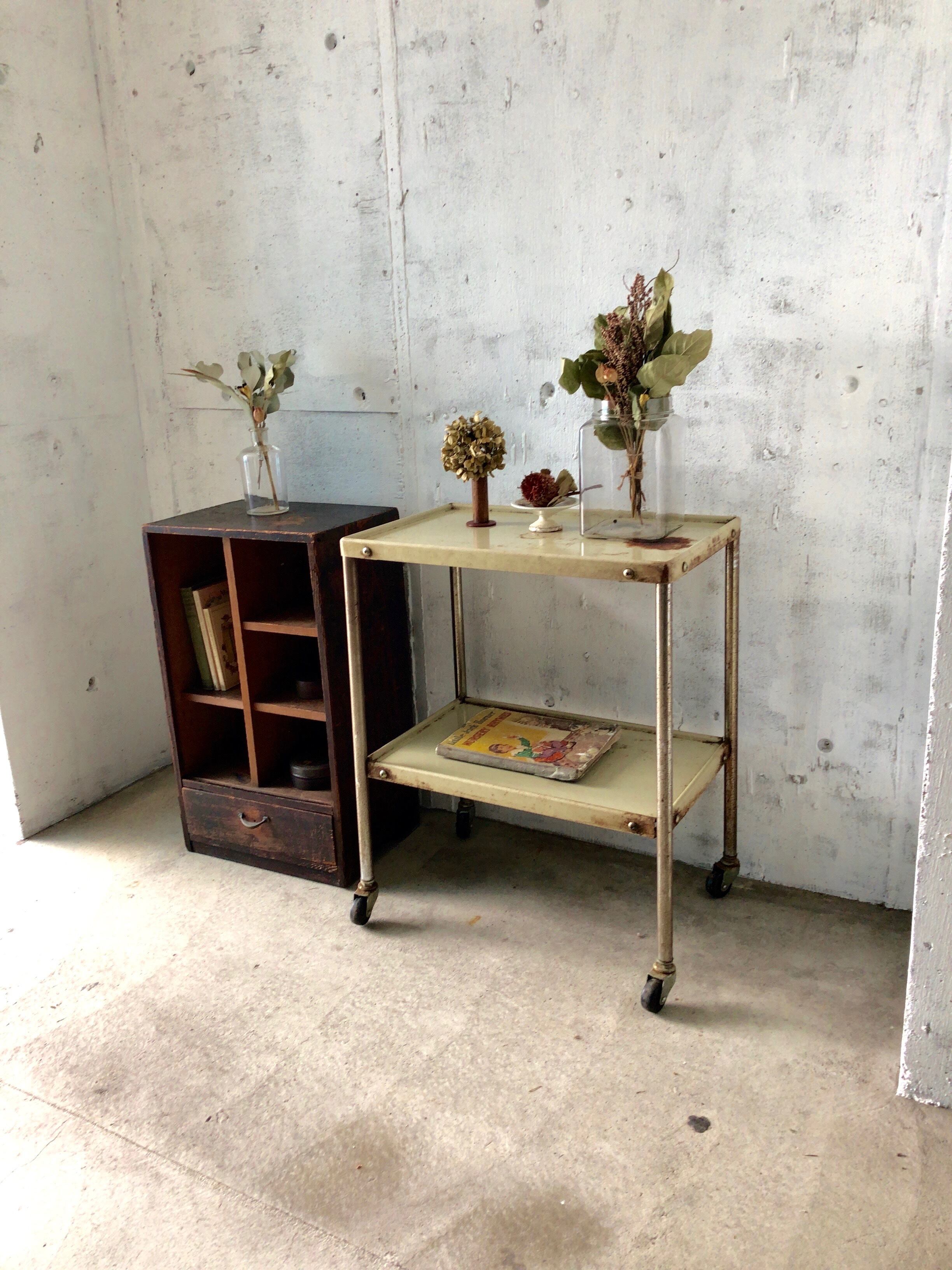 経年変化の程よいサビ感、無骨でインダストリアルな雰囲気が格好良いラック。特に目立つがたつきはなく、状態は良いです。お部屋でお気に入りの小物や植物を飾る台としてや、サイドテーブルとして使ってみても素敵です。ショップさんの店舗什器としてもオススメです。