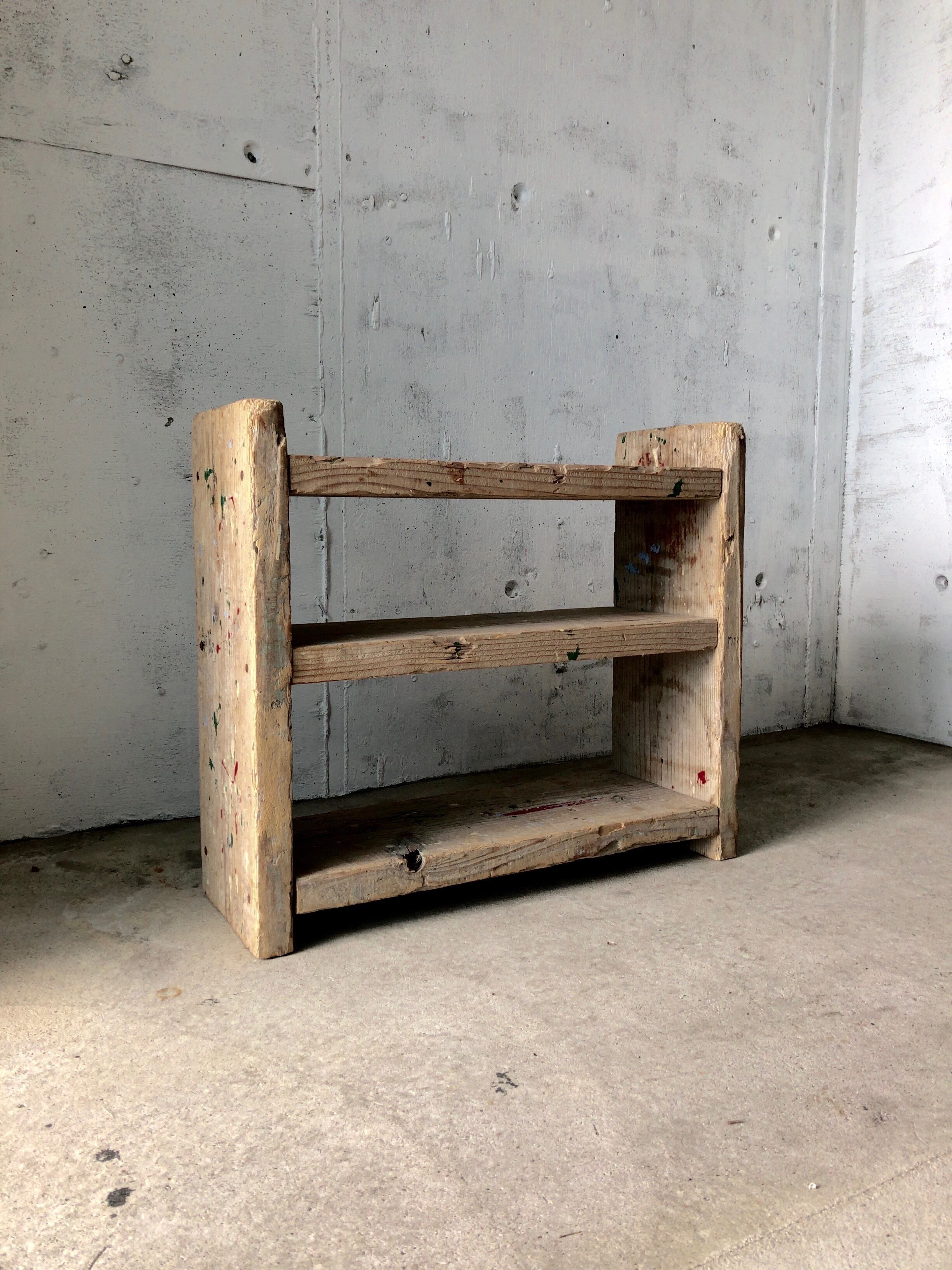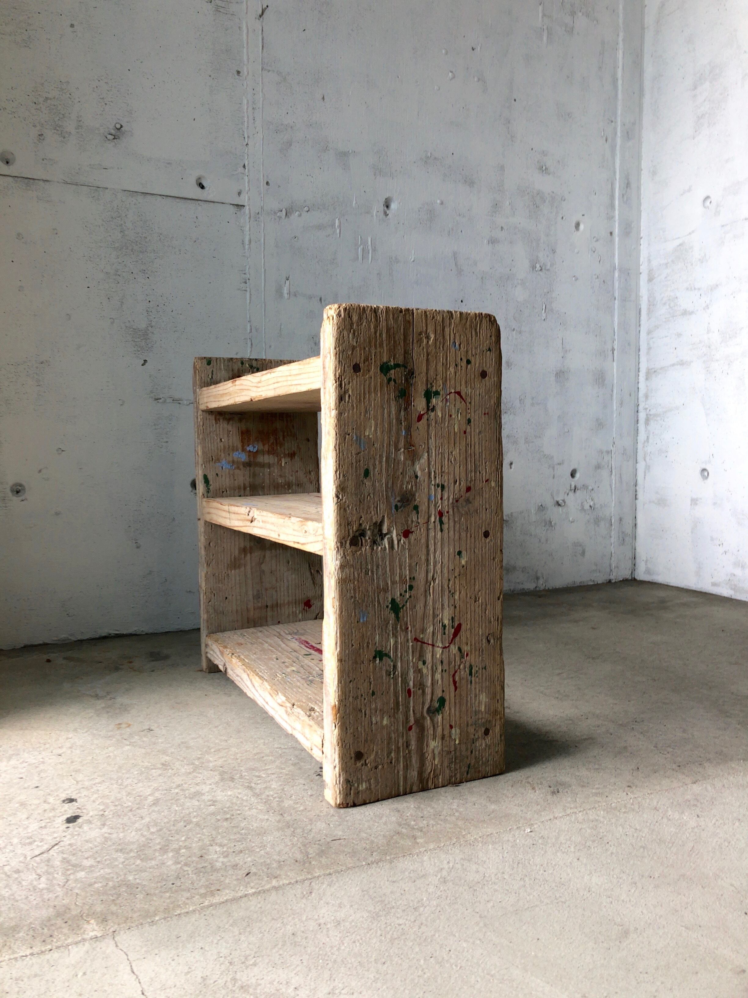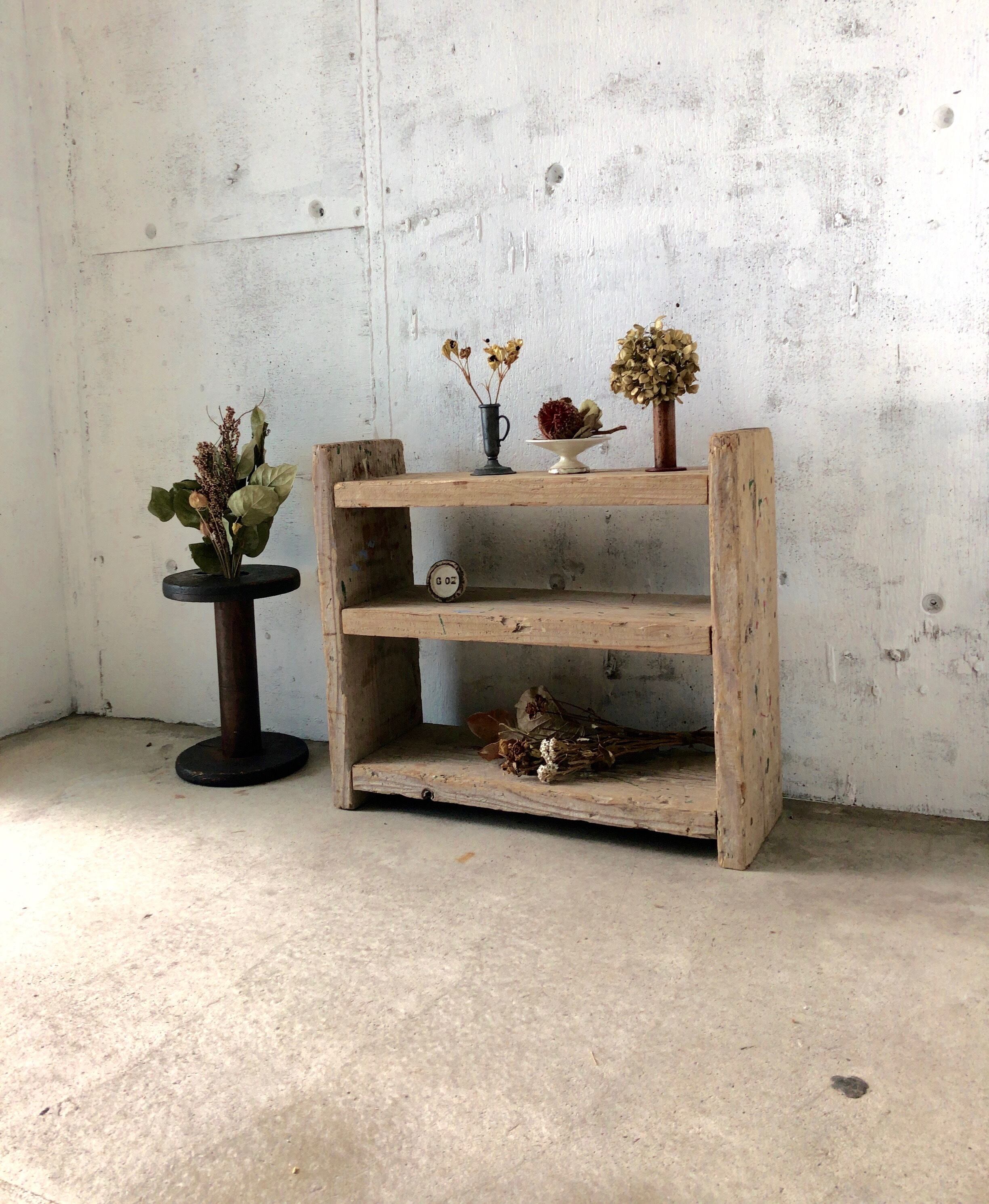 雰囲気の良い古材板とシャビーなペイント跡が感じ良い飾り台。少しのがたつきはありますが、しっかりとした厚みのある板で造られています。お部屋で小物や植物などを感じ良くディスプレイしたら、素敵な空間が演出できそうです。