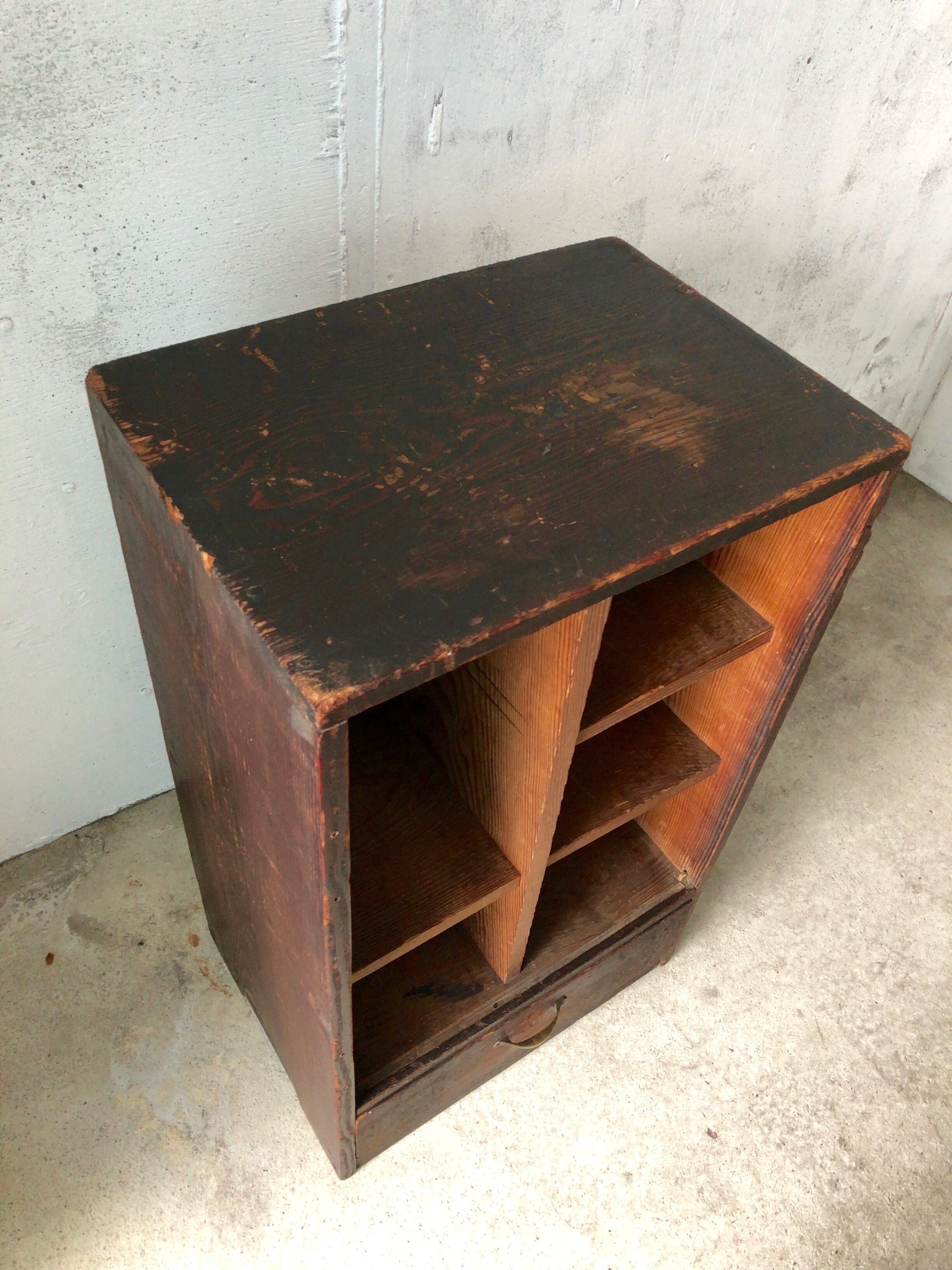 古い収納棚になります。スレや剥げ、当たりキズ、欠け、割れ、落としきれない汚れなどがあります。引出し中はB5サイズが余裕を持って入る大きさです。少し汚れがありますが開閉はスムーズに行え、日常気軽にお使いいただけます。全体的に状態も良いのでまだまだ実用的に活躍してくれます。