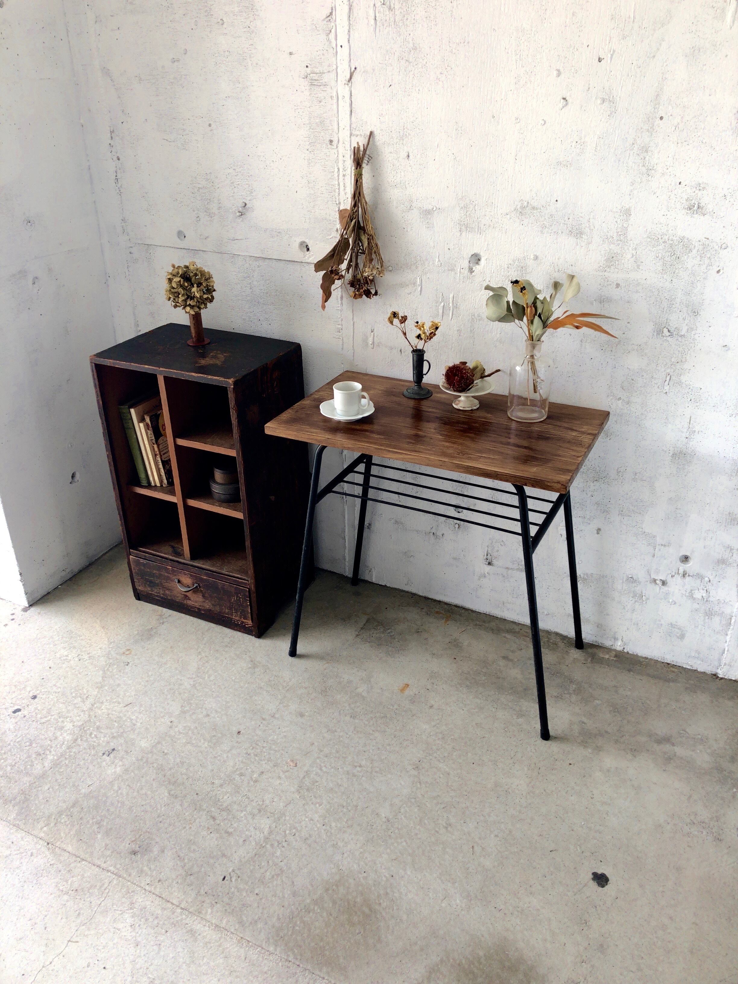 古い鉄脚と新材のサイドテーブルになります。スレや剥げ、当たりキズ、サビ、落としきれない汚れなどがあります。古い鉄脚ですので、少しのがたつきなどはありますが、使用上問題なくお使いいただけます。全体的に状態も良く、まだまだ実用的に活躍してくれます。