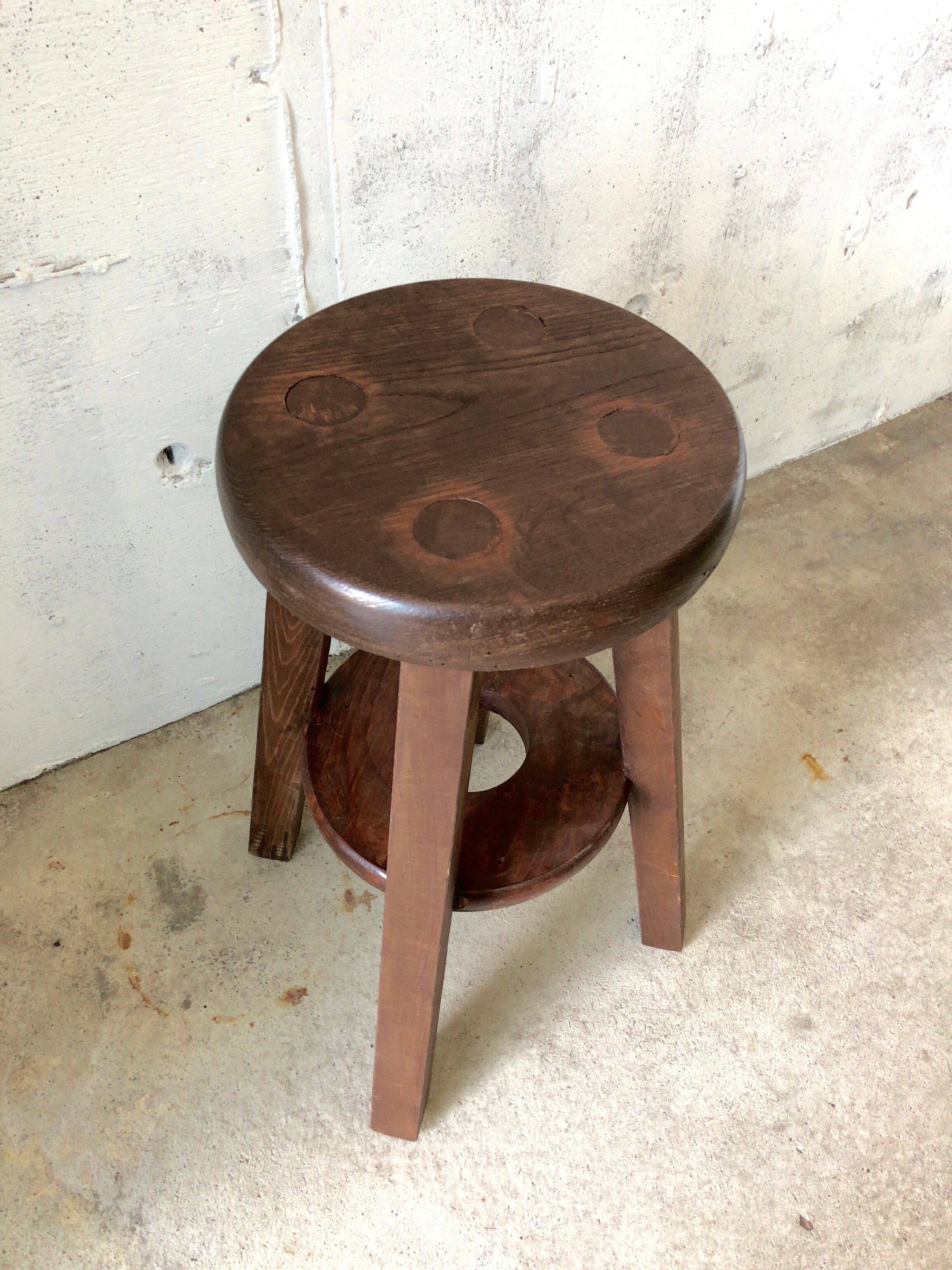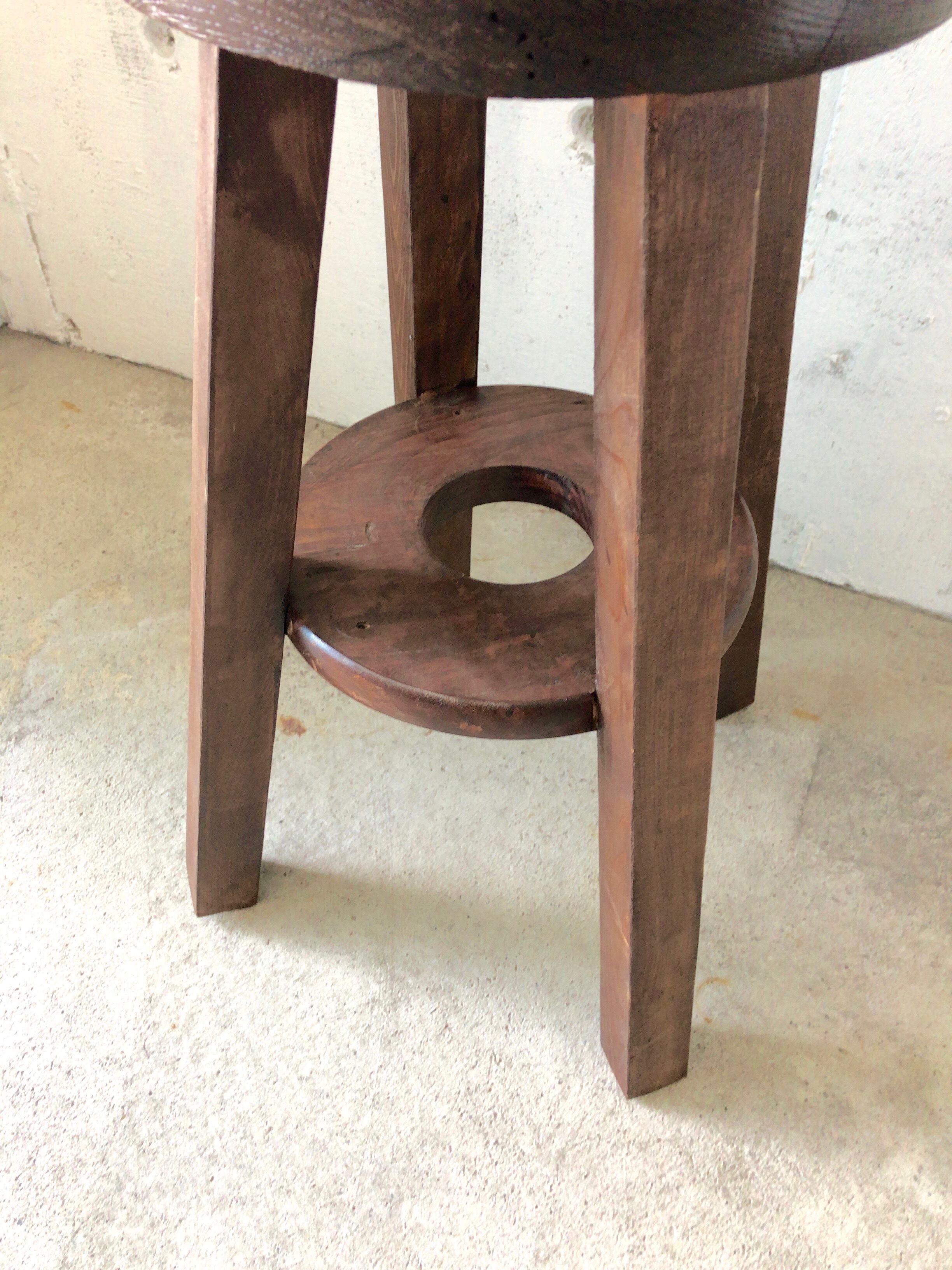 古いスツールになります。スレや剥げ、割れ、欠け、当たりキズ、落としきれない汚れなどがあります。少しのがたつきはありますが、しっかりとした造りで全体的に状態も良いので、まだまだ実用的に活躍してくれます。