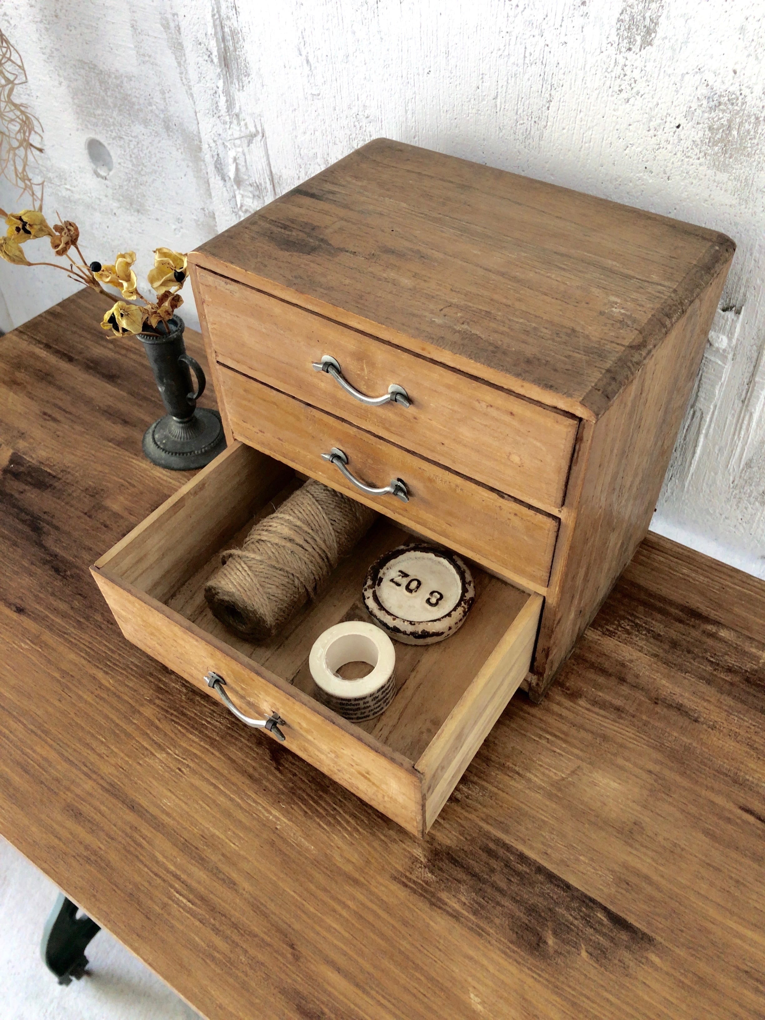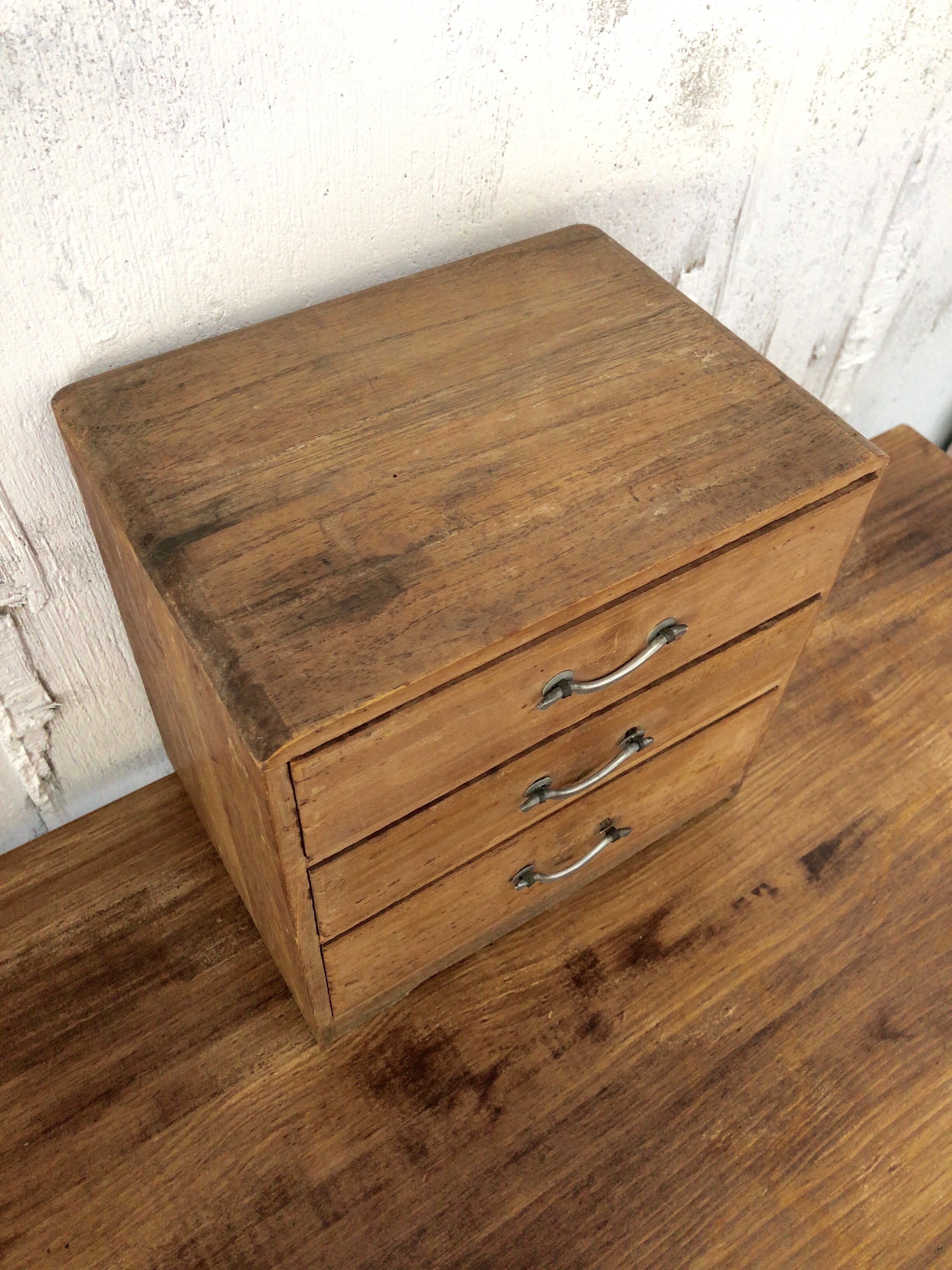 経年変化のナチュラルな木肌、雰囲気の良い取手が感じ良い小引き出し。引出し中は少し汚れがありますが、開閉はスムーズに行え、日常気軽にお使いいただけます。お部屋のカウンター上やリビング、作業場などで細々したものやステーショナリーの整理に役立ちそうです。