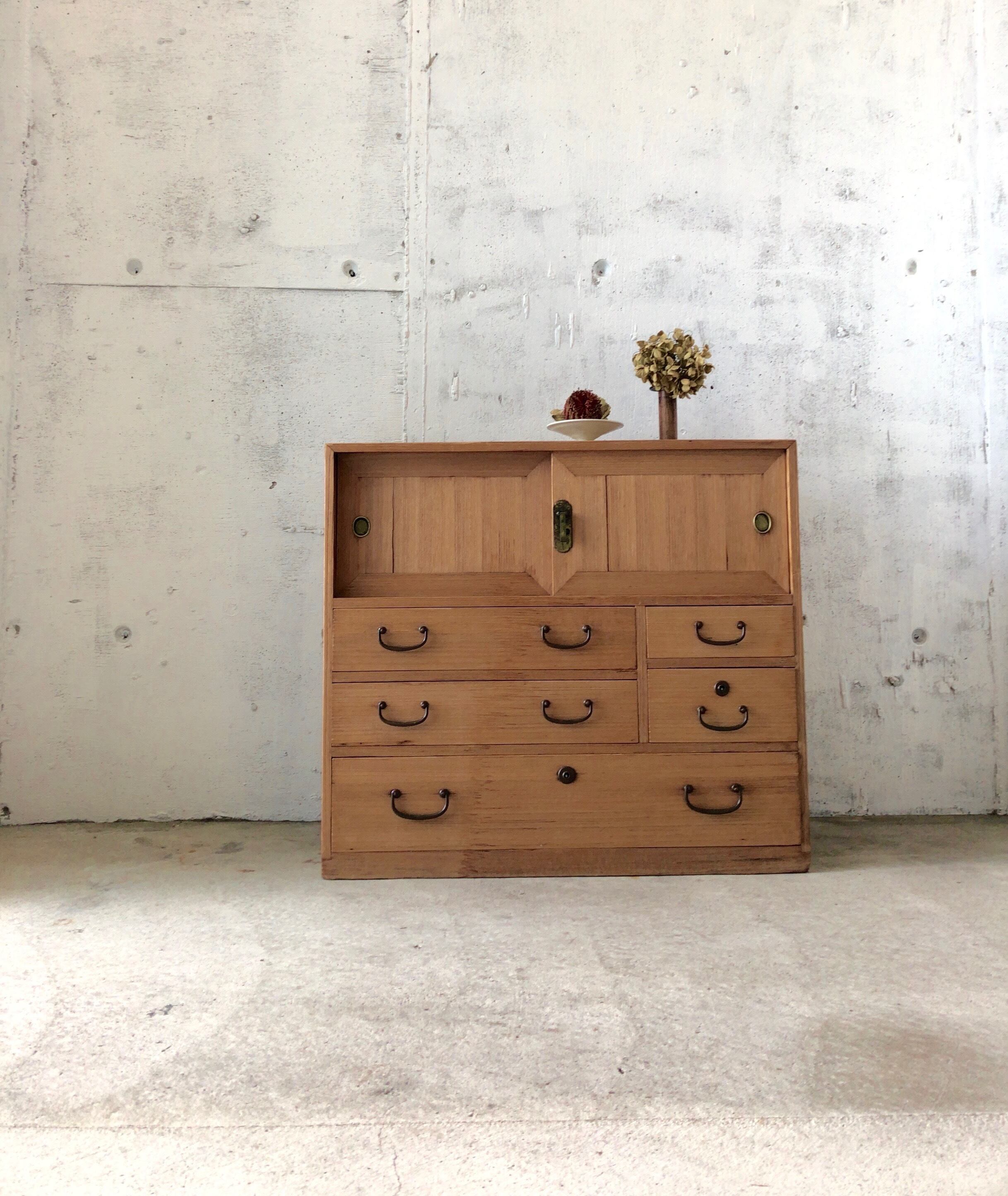 古い収納棚になります。スレや剥げ、当たりキズ、欠け、割れ、落としきれない汚れなどがあります。引出し中は比較的に綺麗で開閉もスムーズに行え、日常気軽にお使いいただけます。全体的に状態も良いのでまだまだ実用的に活躍してくれます。
