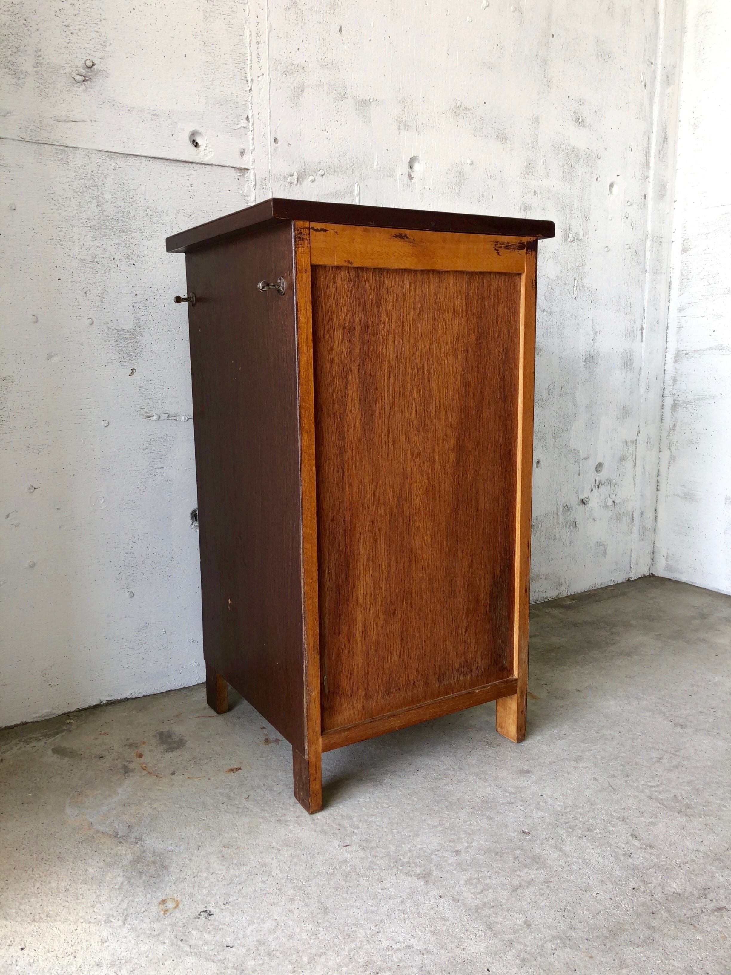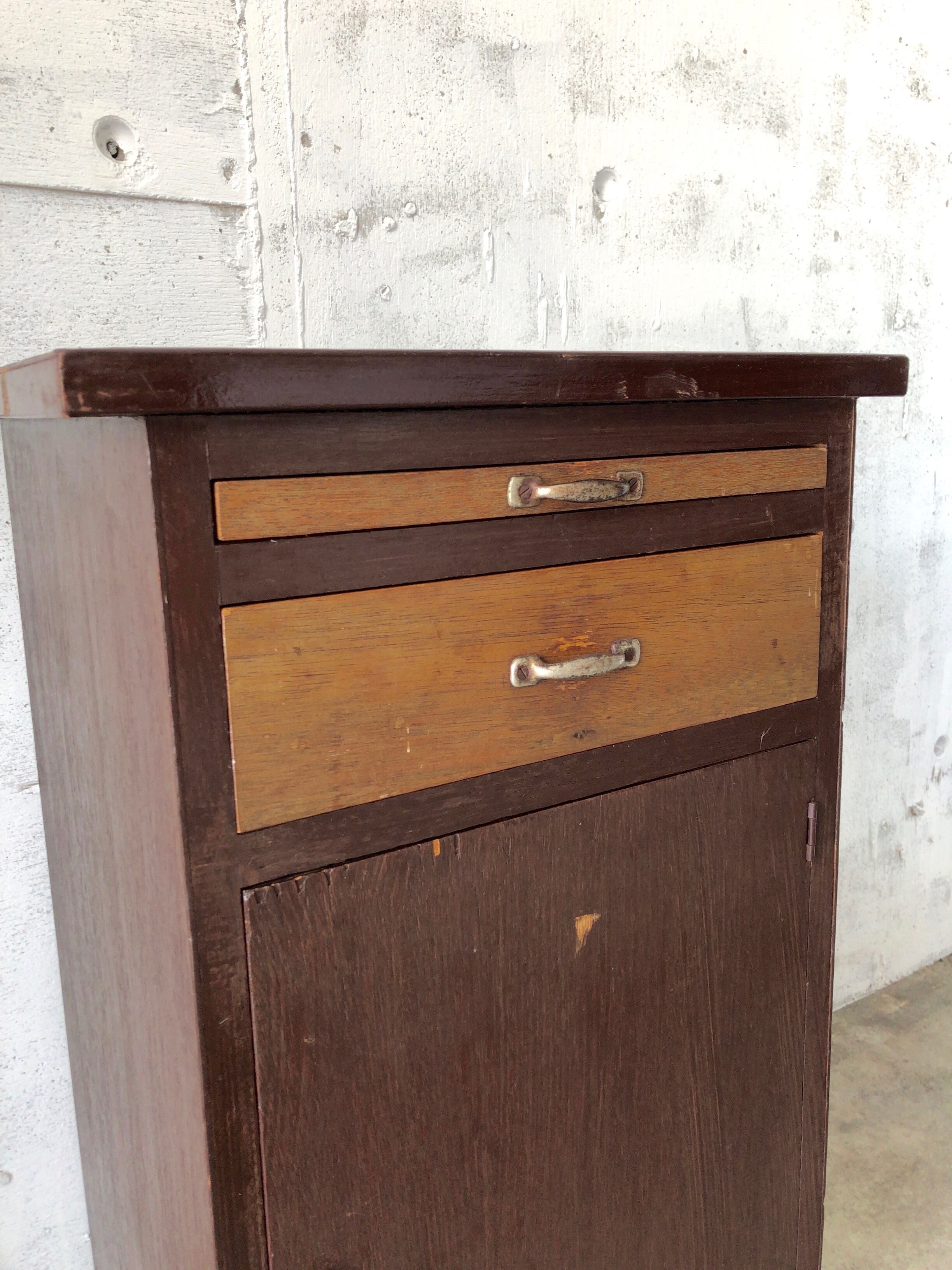 古い収納棚になります。スレや欠け、割れ、当たりキズ、落としきれない汚れなどがあります。扉戸、引出し、収納式台の開閉は比較的スムーズに行え、使用上問題なくお使いいただけます。引出し中は綺麗でB5サイズが入る大きさです。全体的に状態も良いのでまだまだ実用的に活躍してくれます。