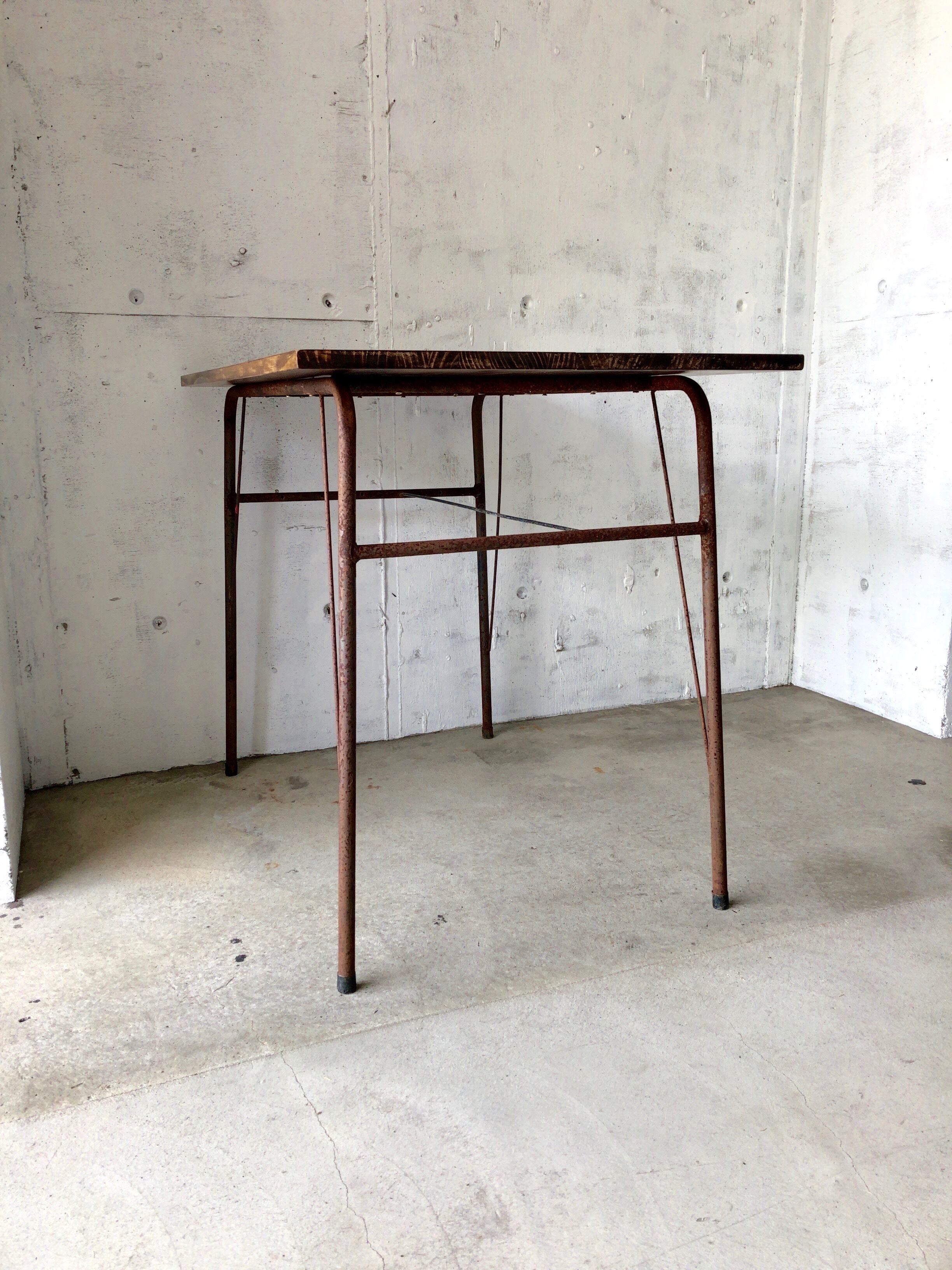 古い鉄脚と新材のテーブルになります。スレや剥げ、サビ、当たりキズ、落としきれない汚れなどがあります。古い鉄脚になりますので少しのがたつきはありますが、しっかりとしていて強度上問題なく、日常気軽にお使いいただけます。全体的に状態も良く、まだまだ実用的に活躍してくれます。