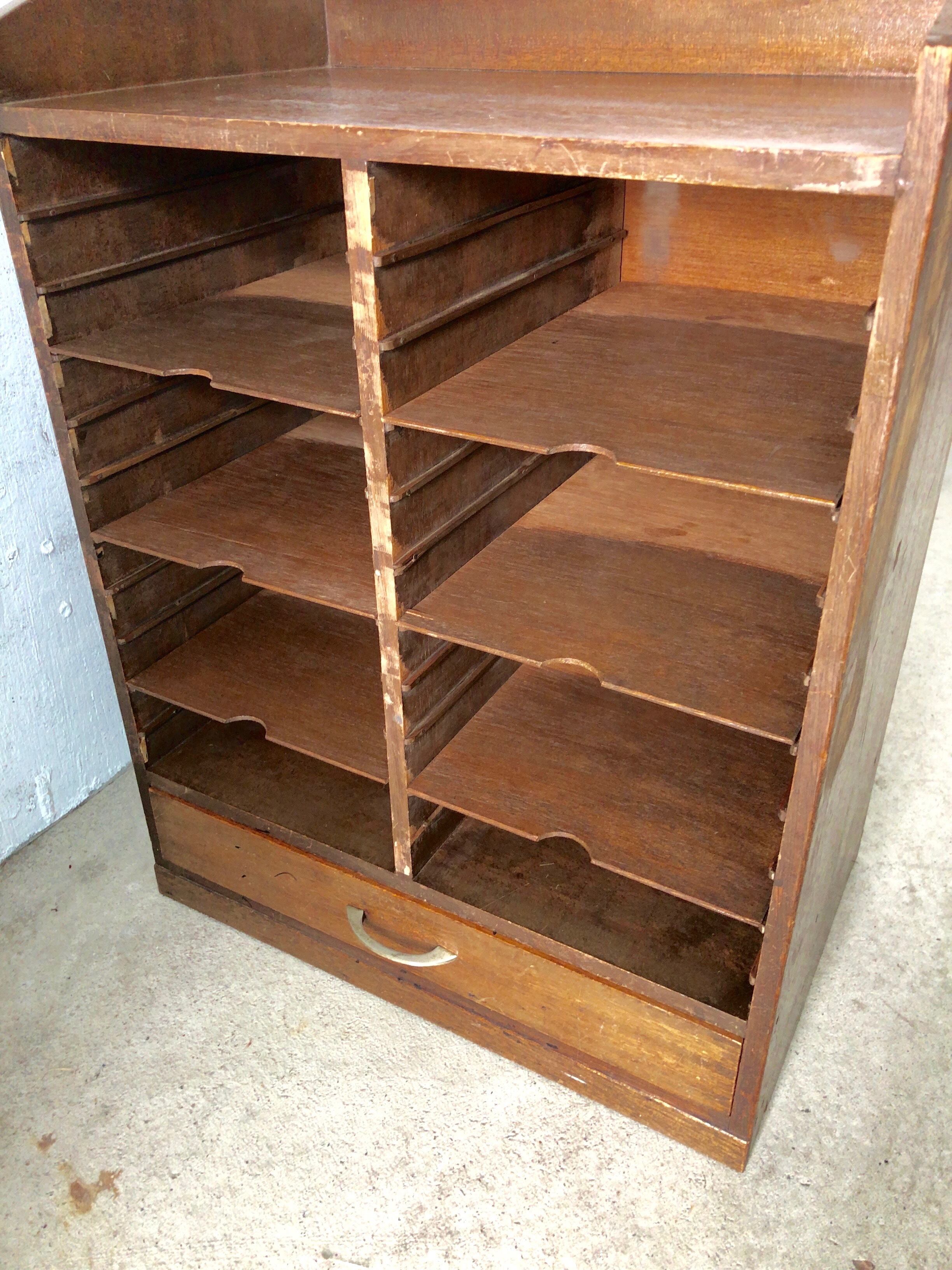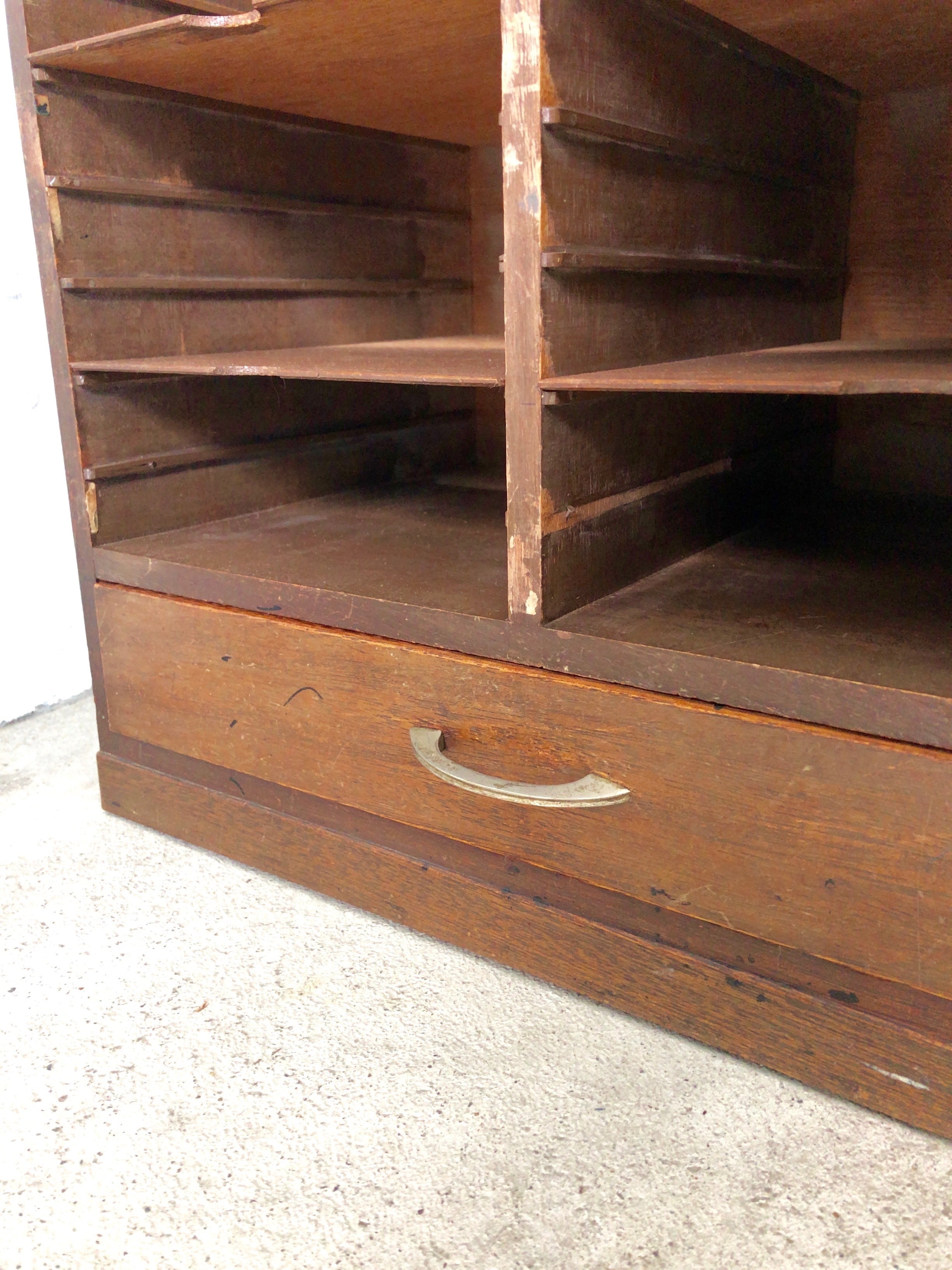 古いカルテケースになります。スレや当たりキズ、欠け、割れ、サビ、落としきれない汚れなどがあります。引出し中は綺麗で、開閉もスムーズに行え日常気軽にお使いいただけます。中板は全て取り外し可能です。全体的に状態も良いのでまだまだ実用的にお使いいただけます。