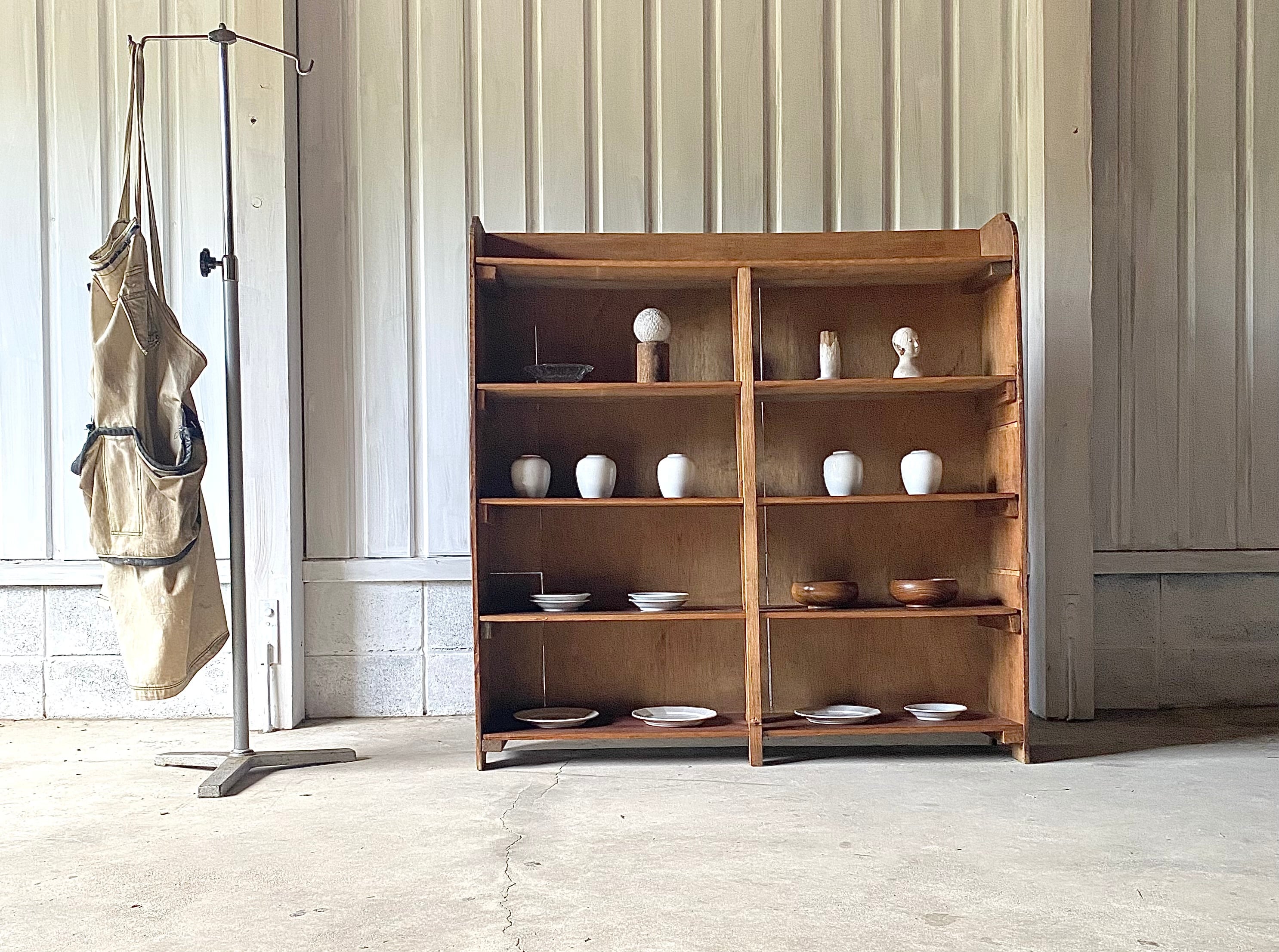 古いオープンラックになります。スレや剥げ、割れ、反り、当たりキズ、落としきれない汚れなどがございます。全体的に状態も良くまだまだ日常活躍してくれます。