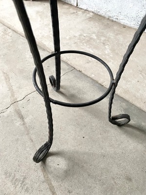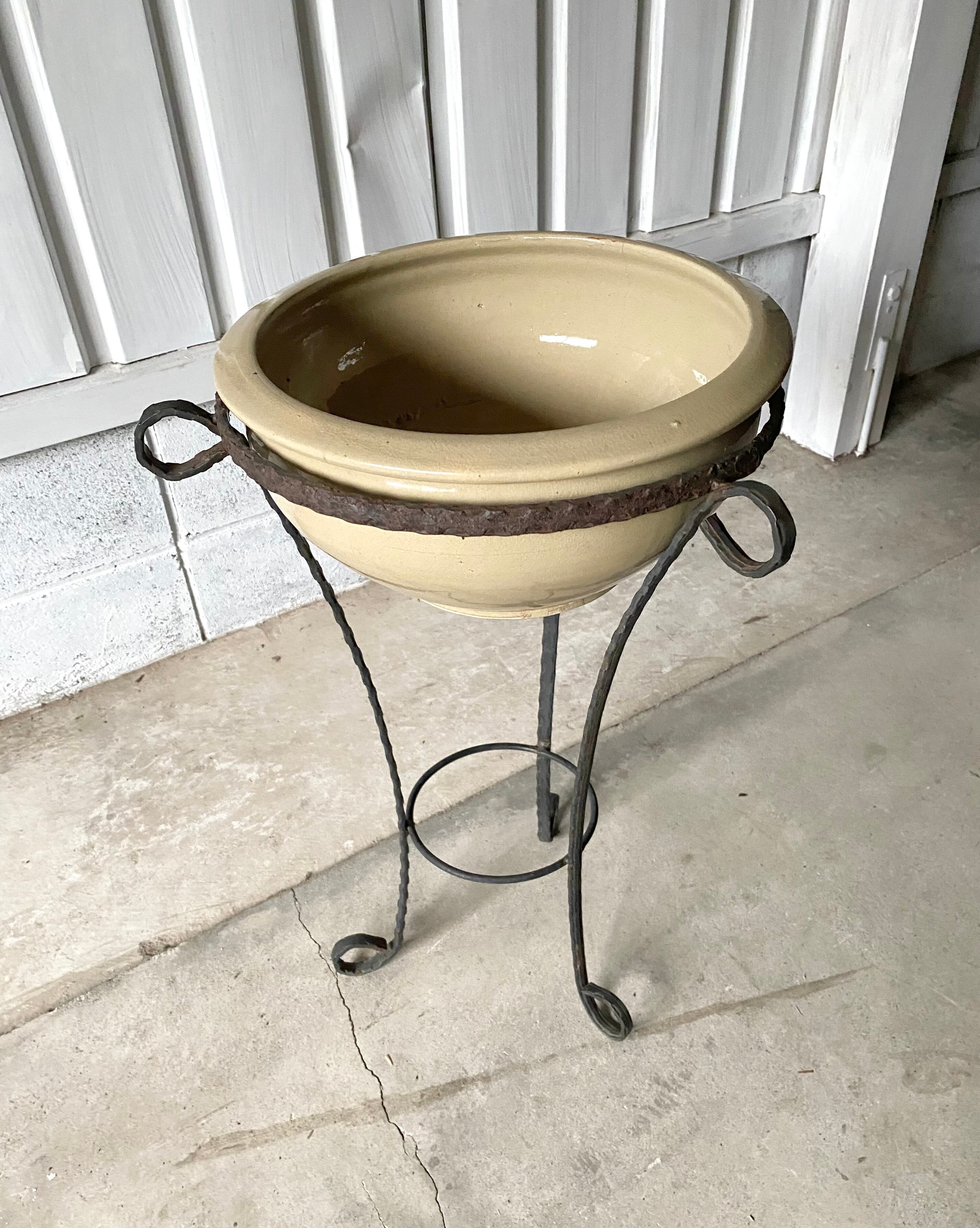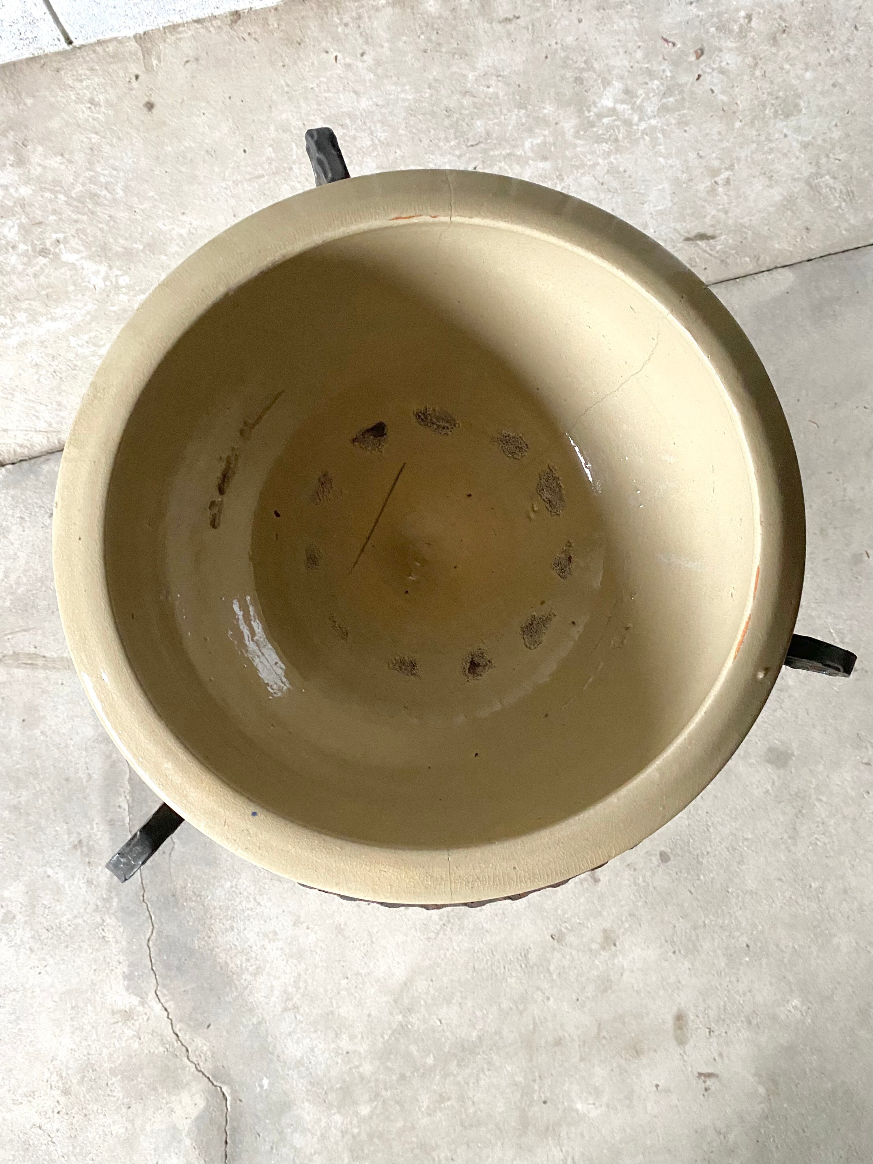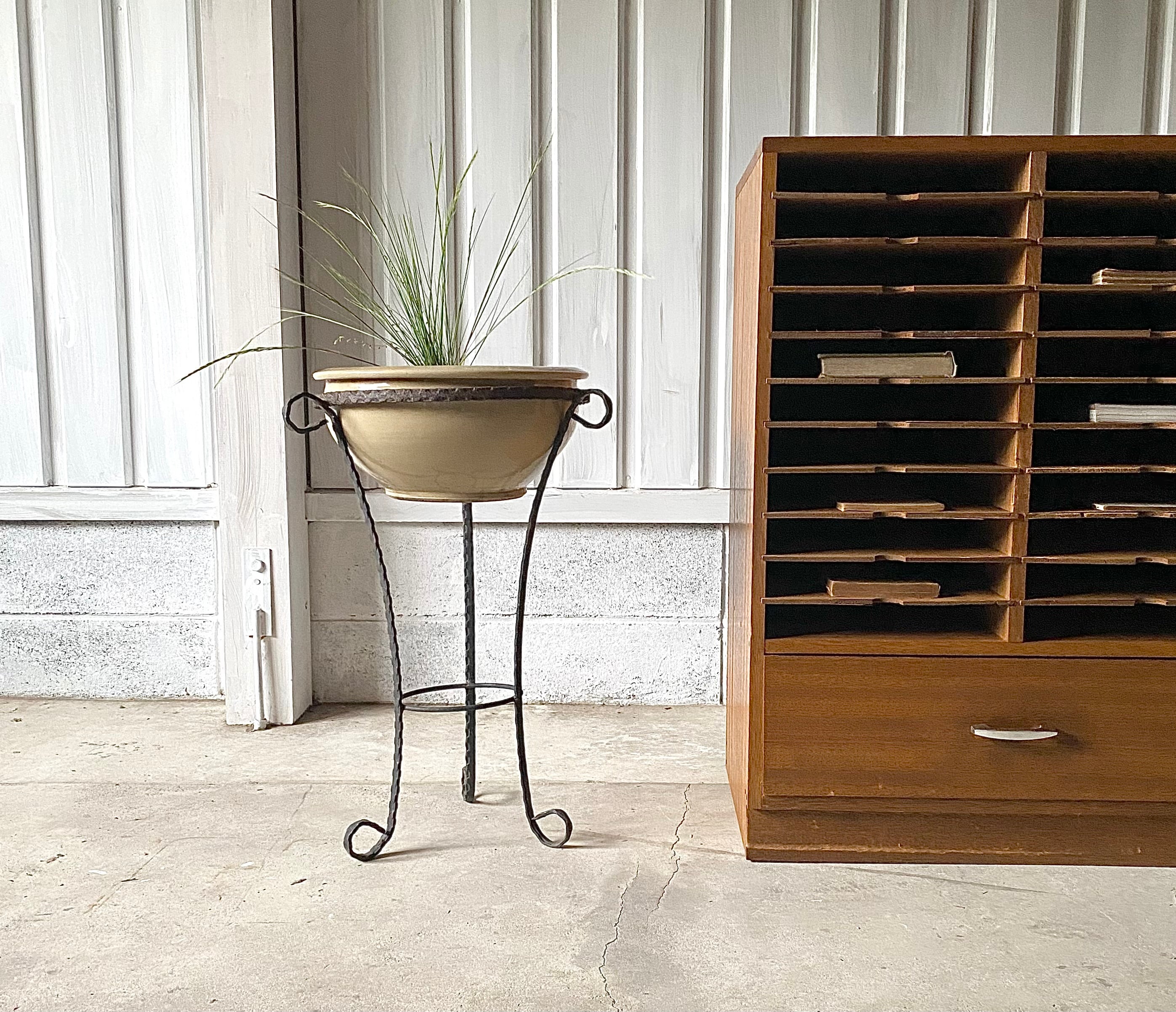 経年変化の雰囲気ある陶器と程良いサビ感の個性あるアイアン脚が感じ良い飾り台。リビングや趣味部屋、玄関、庭先でお気に入りの植物を飾る台としてや、玄関で鍵やアクセサリー入れとしても素敵です。