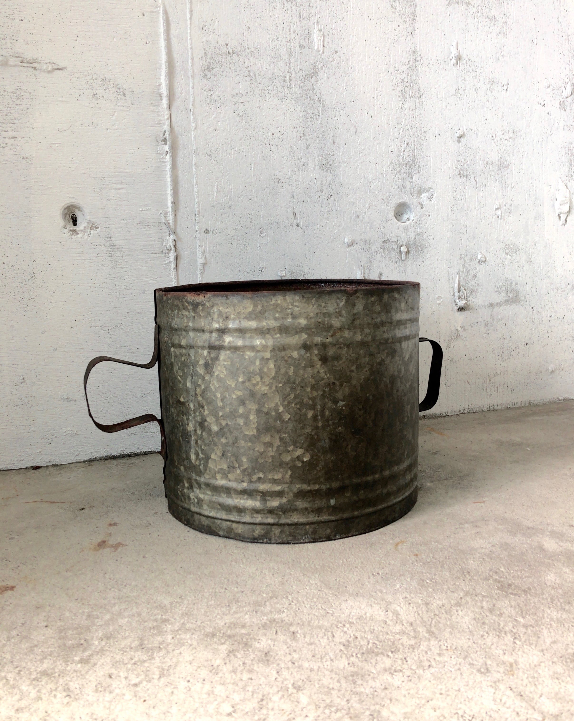 経年変化の雰囲気のあるサビ感、マットな質感が格好良いブリキ缶です。両側に取手が付いていて、持ち運びにも便利です。自宅使いでお部屋のディスプレイ、ショップのディスプレイとして、ドライフラワーをこんもり入れて飾ってみたり、底に穴が空いているので植物の鉢カバーとして使ってみても素敵です。