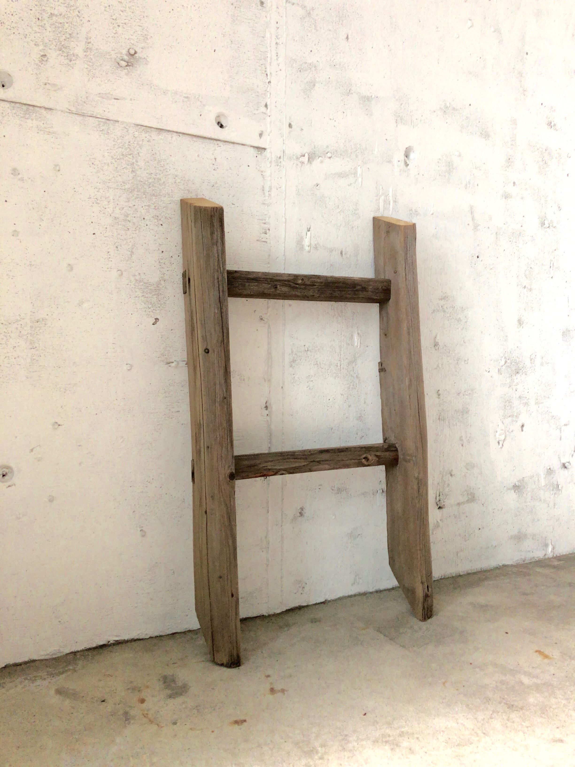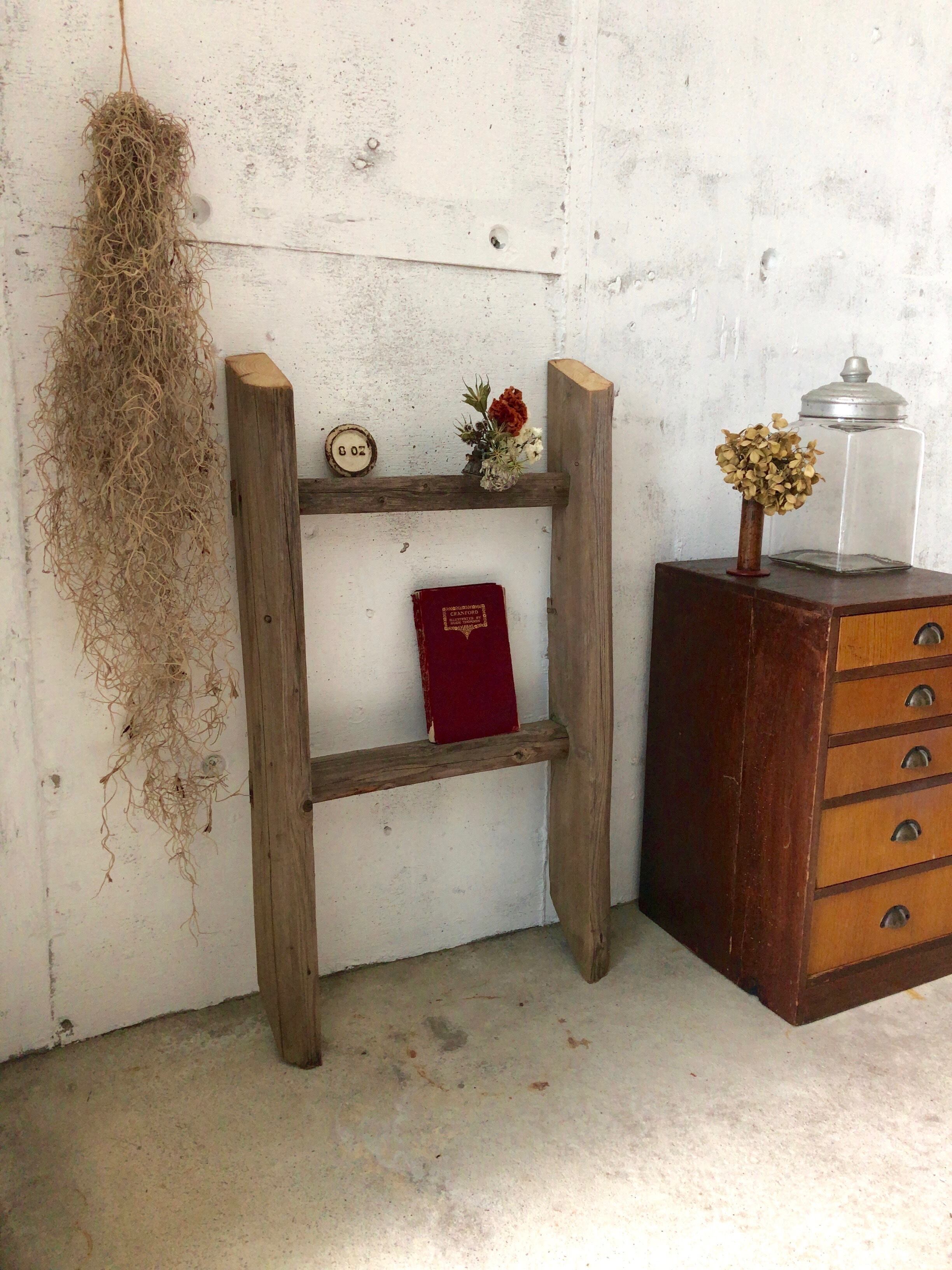 経年変化の素敵な雰囲気を放つ木製のラダー。少しぐらつきなどはありますが、しっかりとした厚みのある木で出来ていて、しっかりとしています。お部屋のディスプレイとして小物や本、植物などを飾ってみても感じ良いです。ショップさんの店舗什器としてもオススメの品です。