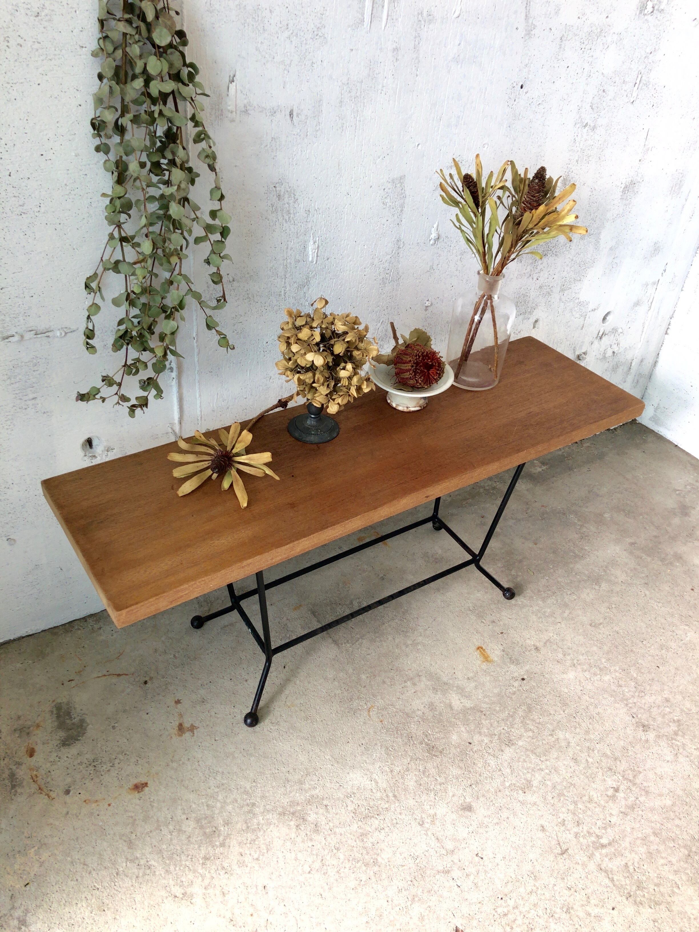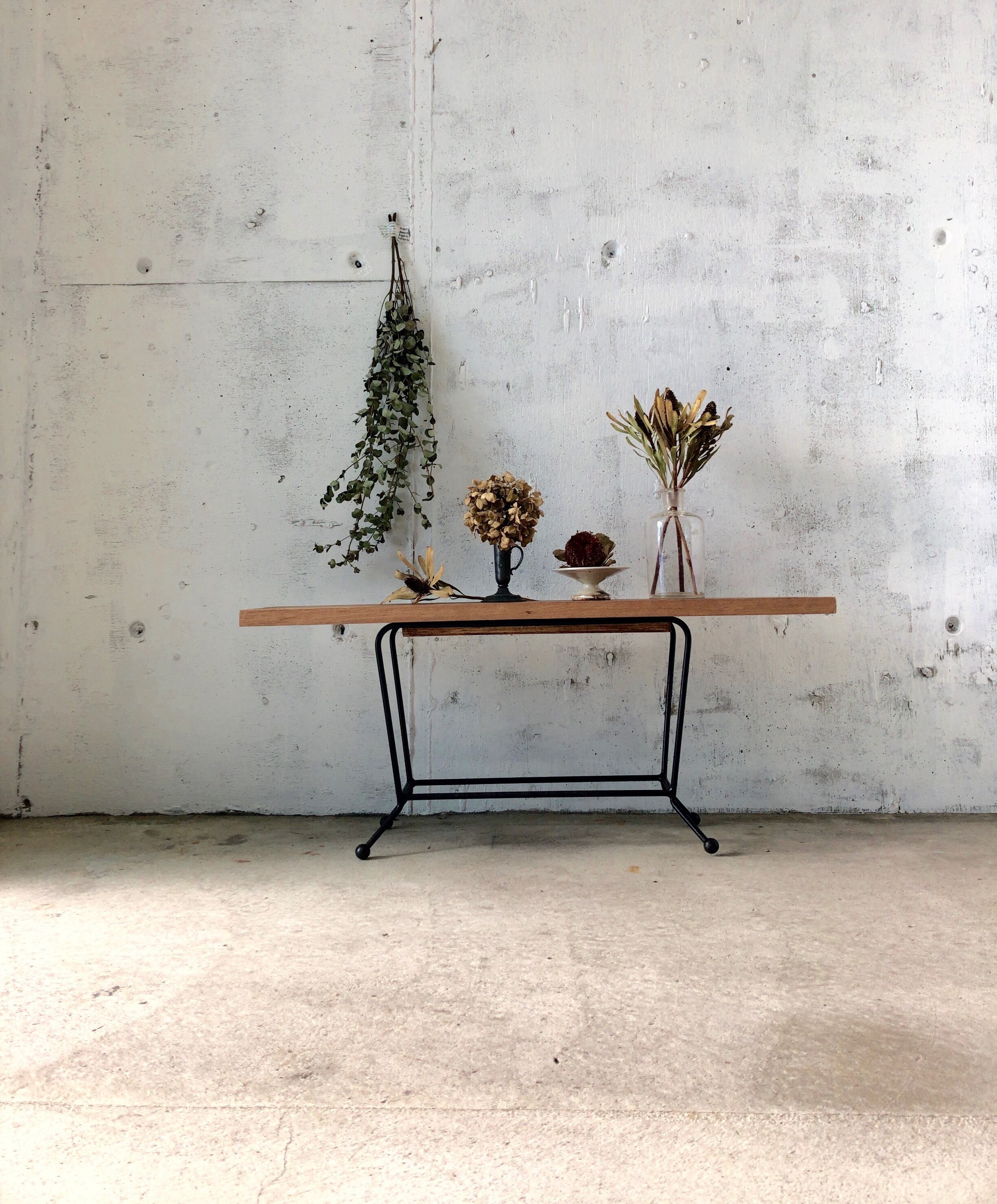 雰囲気の良い古材板と古い鉄脚が良く馴染んローテーブル。ソファテーブルとしてや、植物、小物を飾るディスプレイ台としても感じ良いです。ショップさんの店舗什器として、商品を置く台などとしてもオススメです。