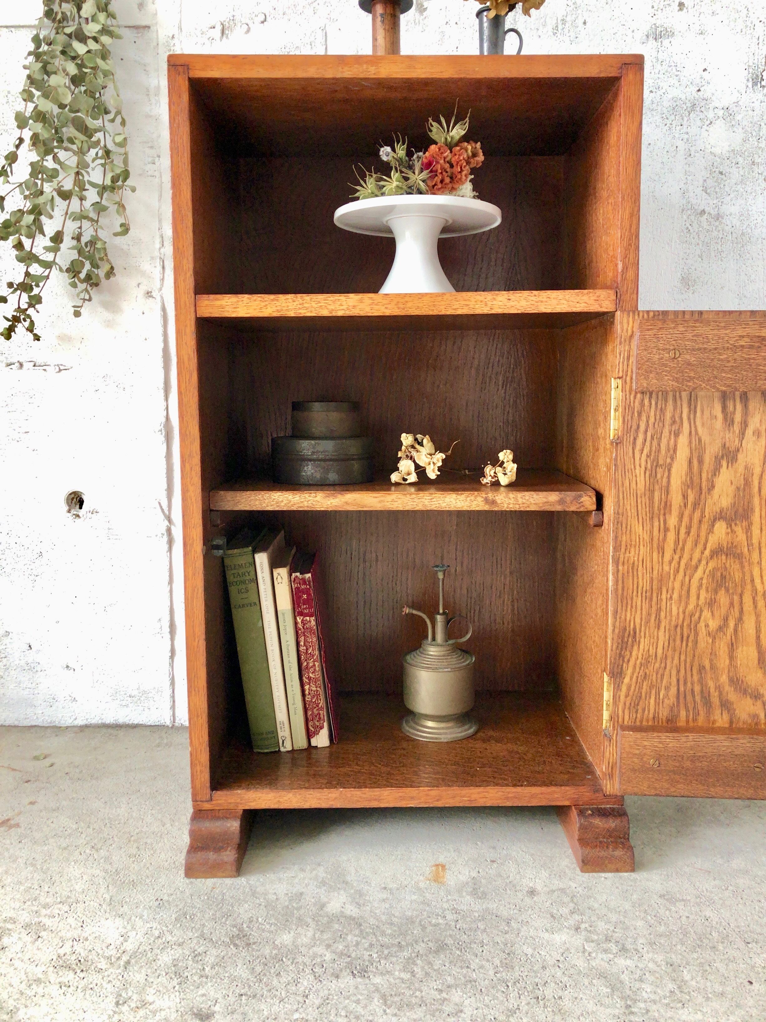 経年変化のナチュラルな木肌、味のある取手が感じ良い収納棚。収納力も十分で、扉収納棚の中板は取り外しが出来て使い勝手も良いです。キッチンで食器や調味料などの収納棚としてや、リビングで小物、本などの収納、脱衣所でタオルなどの収納としても素敵にお使いいただけそうです。