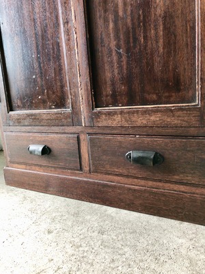 シンプルながら経年変化による深みは空間に落ち着きを与えてくれるキャビネット。扉戸収納と2杯の引き出しがあり、収納力も十分です。経年による傷などもありますが、収納扉の開閉も比較的スムーズに行え、使用上問題なくお使いいただけます。食器棚や小物、本などの収納棚として、毎日の暮らしの中で手元に置いてお役立てください。