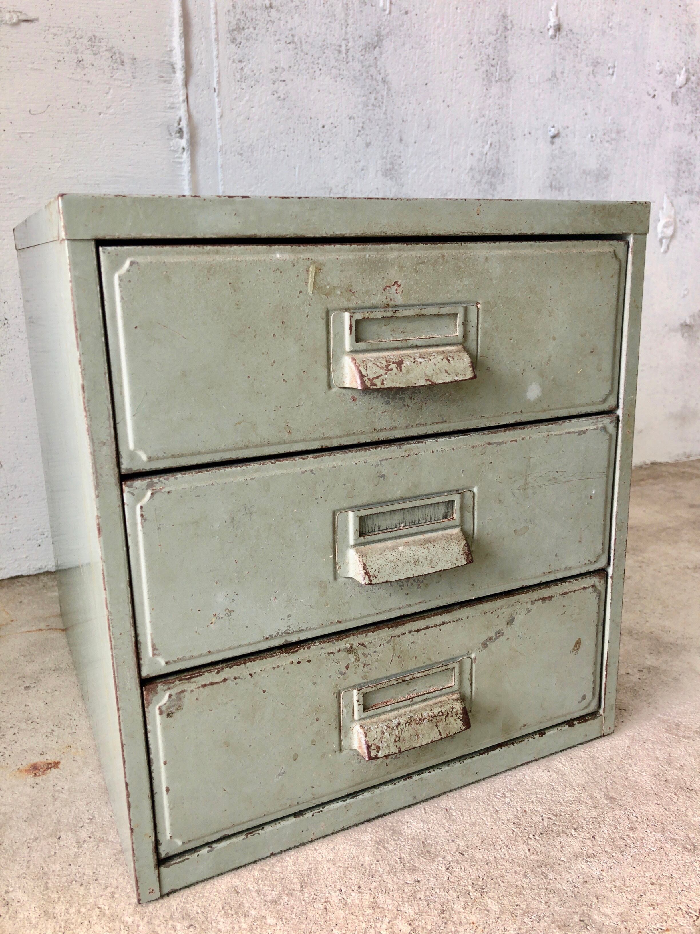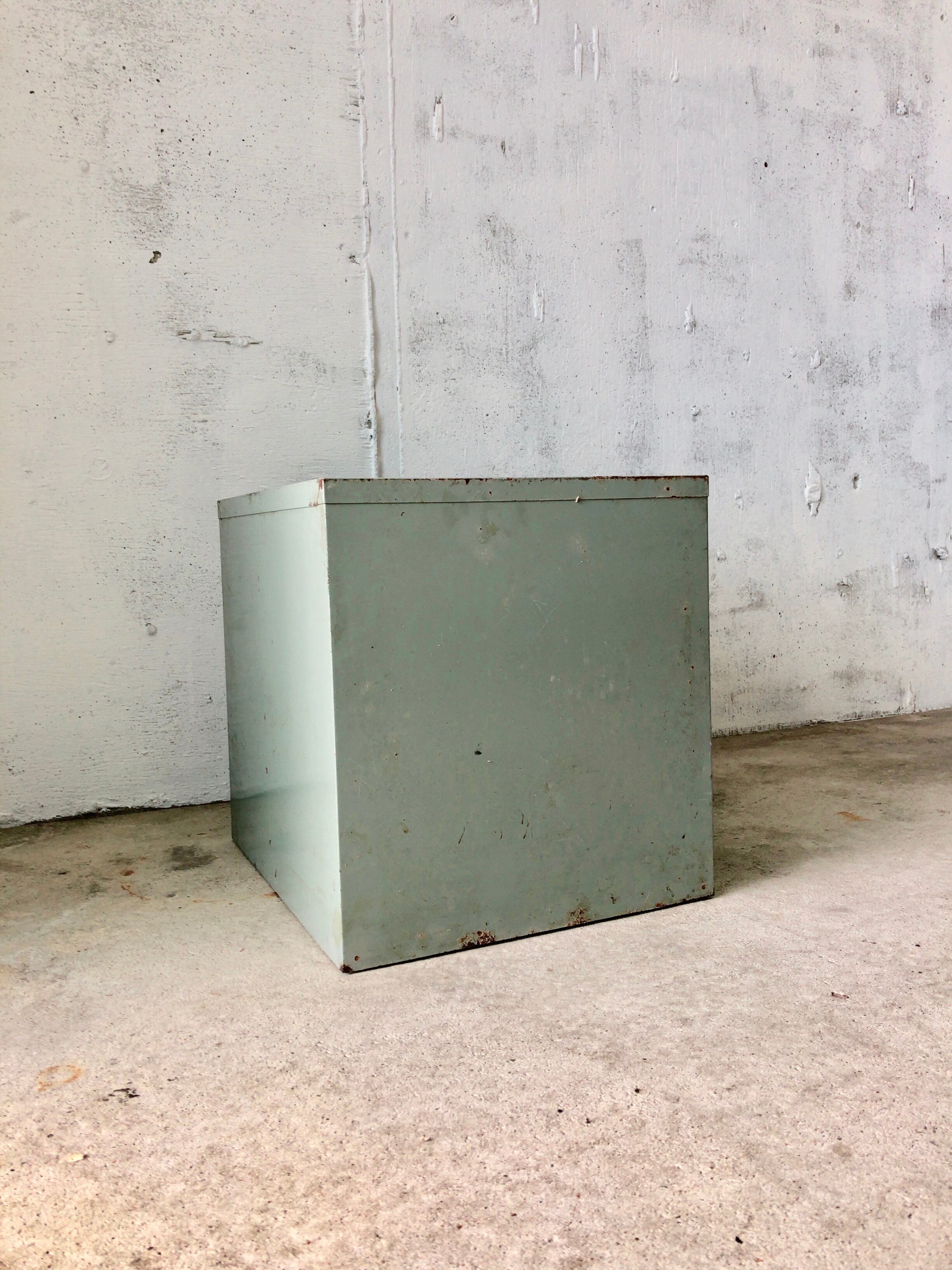 格好の良い雰囲気のインダストリアルな小引き出し。経年変化のマットな質感、程よいサビ感が魅力的です。引出し中は少し汚れがありますが、開閉はスムーズに行え、日常気軽にお使いいただけます。作業場や趣味部屋で小物、パーツなどの収納としても素敵です。