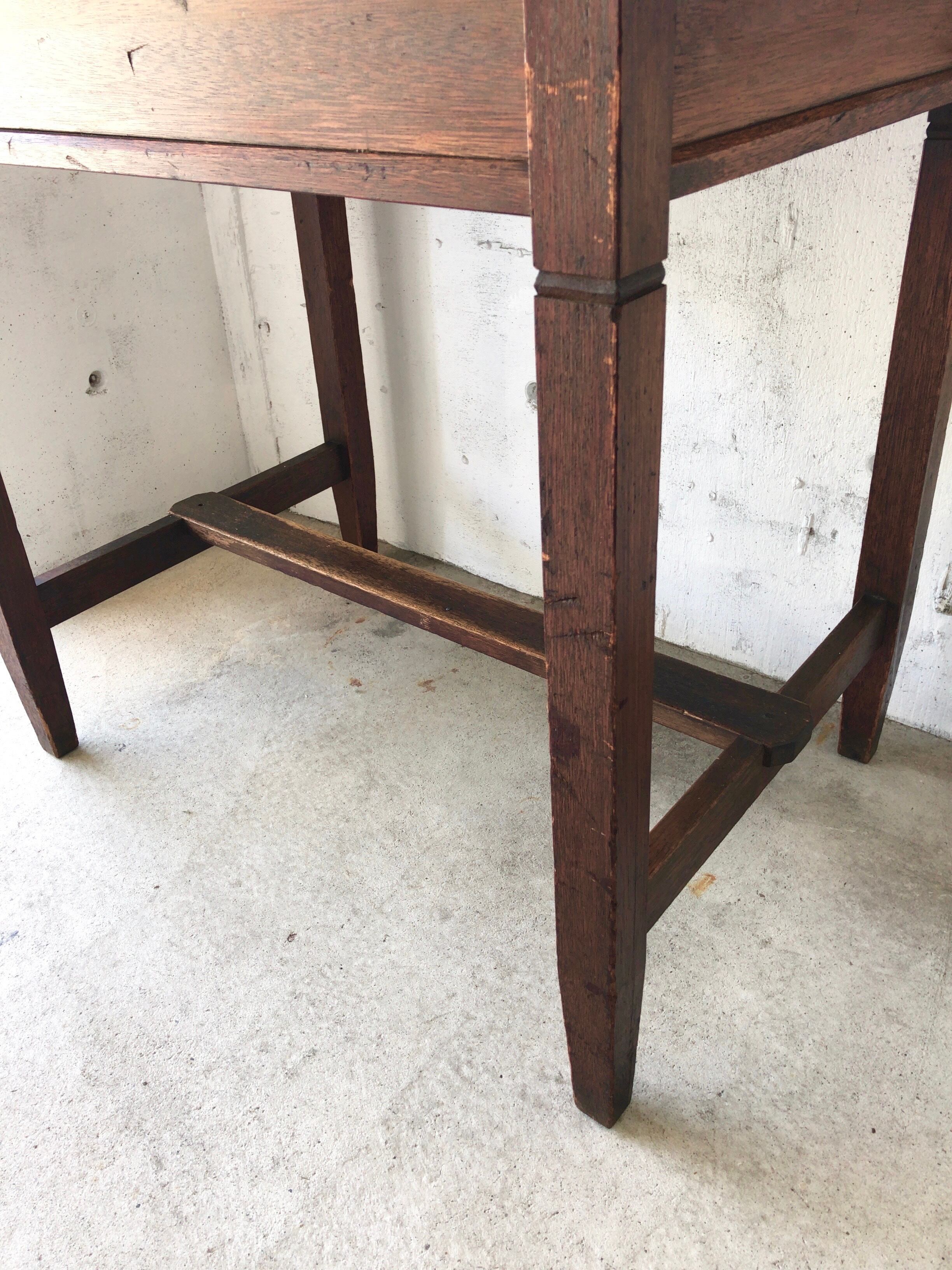 古い木製テーブルになります。スレやハゲ、欠け、反り、割れ、当たりキズ、落としきれない汚れなどがあります。引出し中は少し汚れがありますが、開閉は比較的スムーズに行え、A4サイズが入る大きさです。少しがたつきはありますが全体的に状態も良いので、まだまだ実用的に活躍してくれます。