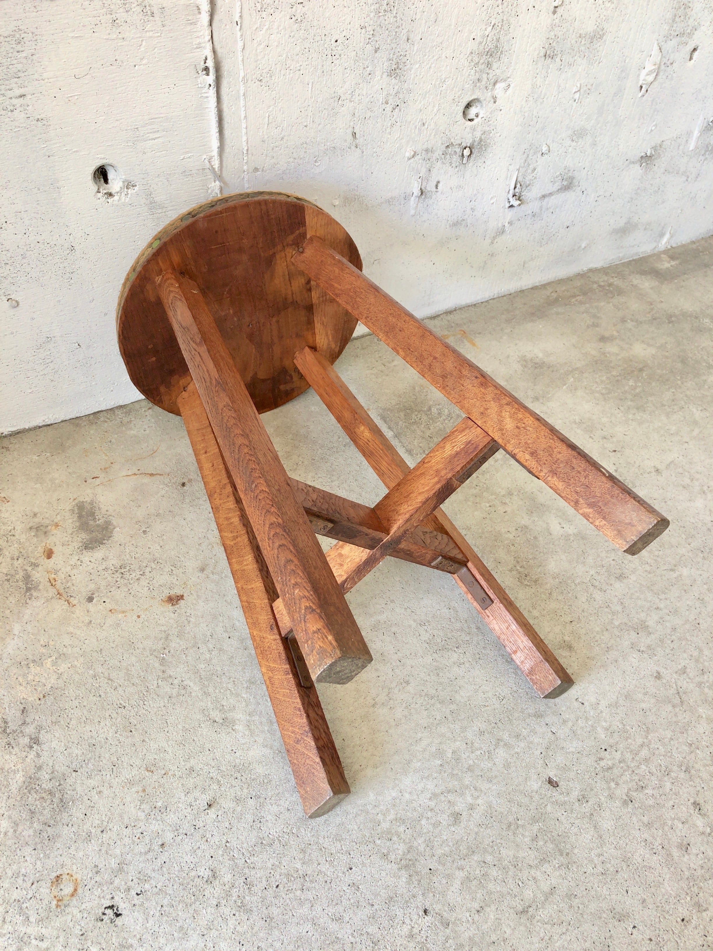 古いスツールになります。スレや剥げ、割れ、欠け、ほつれ、当たりキズ、落としきれない汚れなどがあります。少しのがたつきはありますが、しっかりとした造りで全体的に状態も良いので、まだまだ実用的に活躍してくれます。