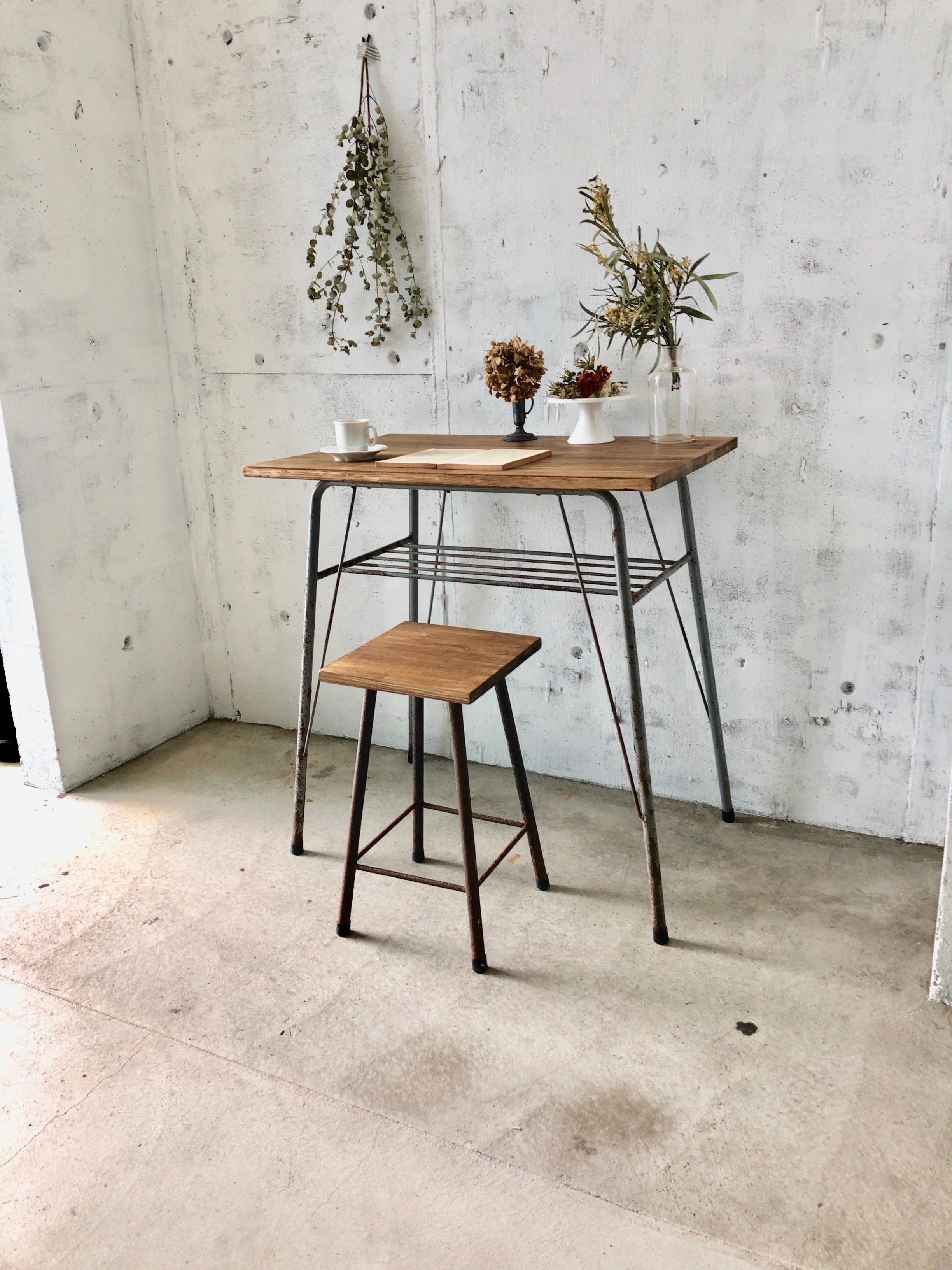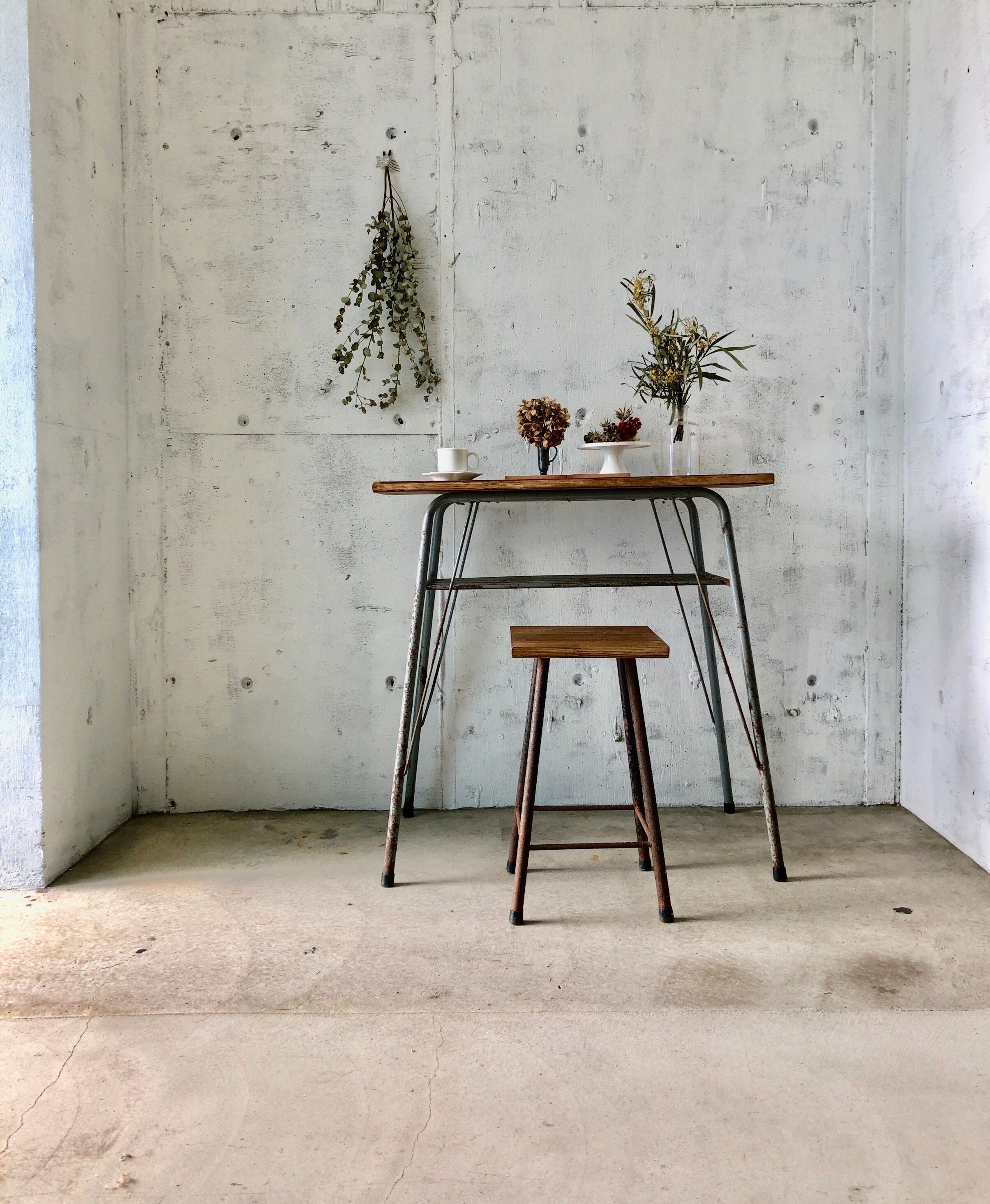 雰囲気の良い木板と古い鉄脚が良く馴染んだ鉄脚テーブル。天板下のオープンラックも雑誌などが置けるので便利です。お気に入りの小物や植物を飾る台としてや、日常の作業をするのに程よいサイズ感がオススメです。味のあるテーブルひとつプラスするだけで雰囲気あるお部屋作りが叶いそうです。