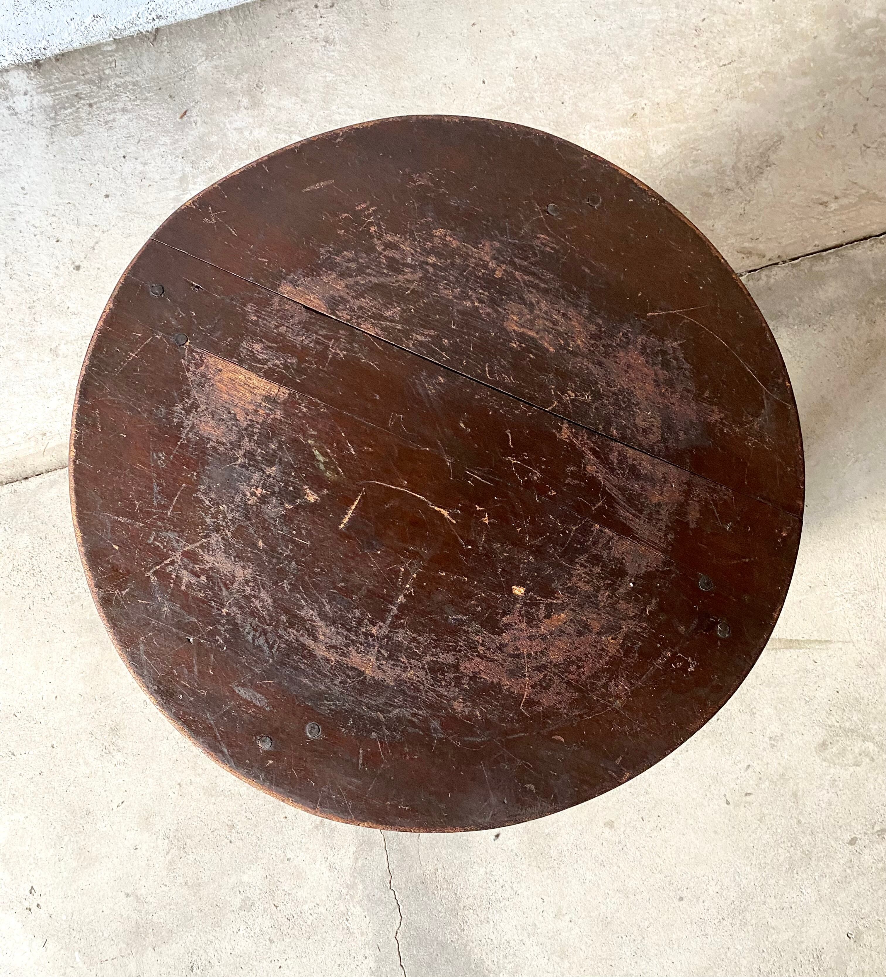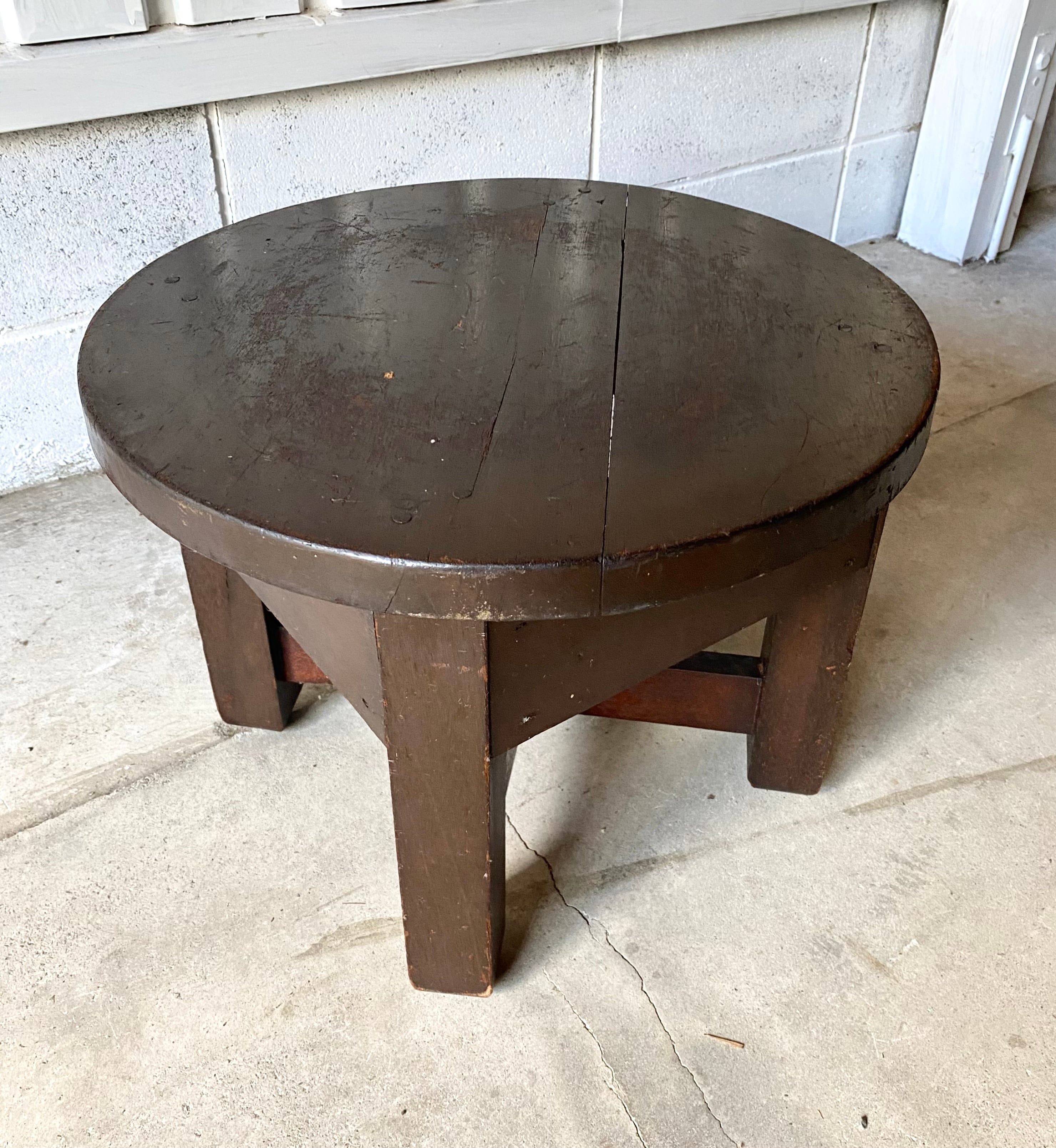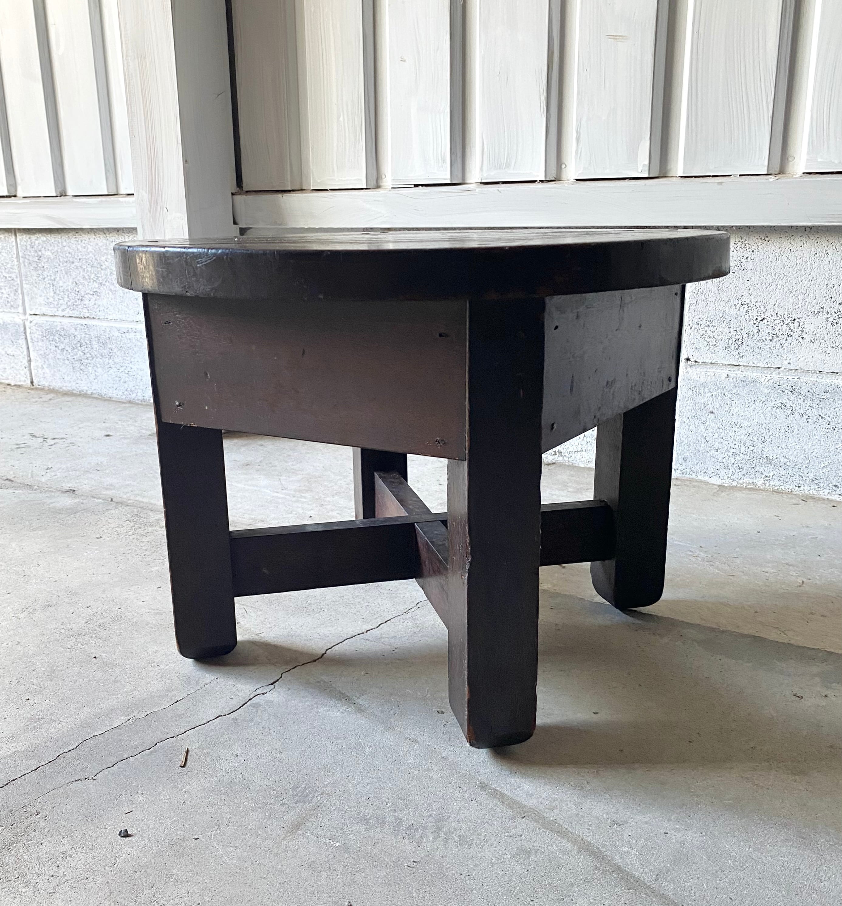 古いカフェテーブルになります。スレや当たりキズ、禿げ、欠け、反り、落としきれない汚れなどがあります。少しのがたつきはありますが、全体的に状態も良いのでまだまだ実用的にお使いいただけます。