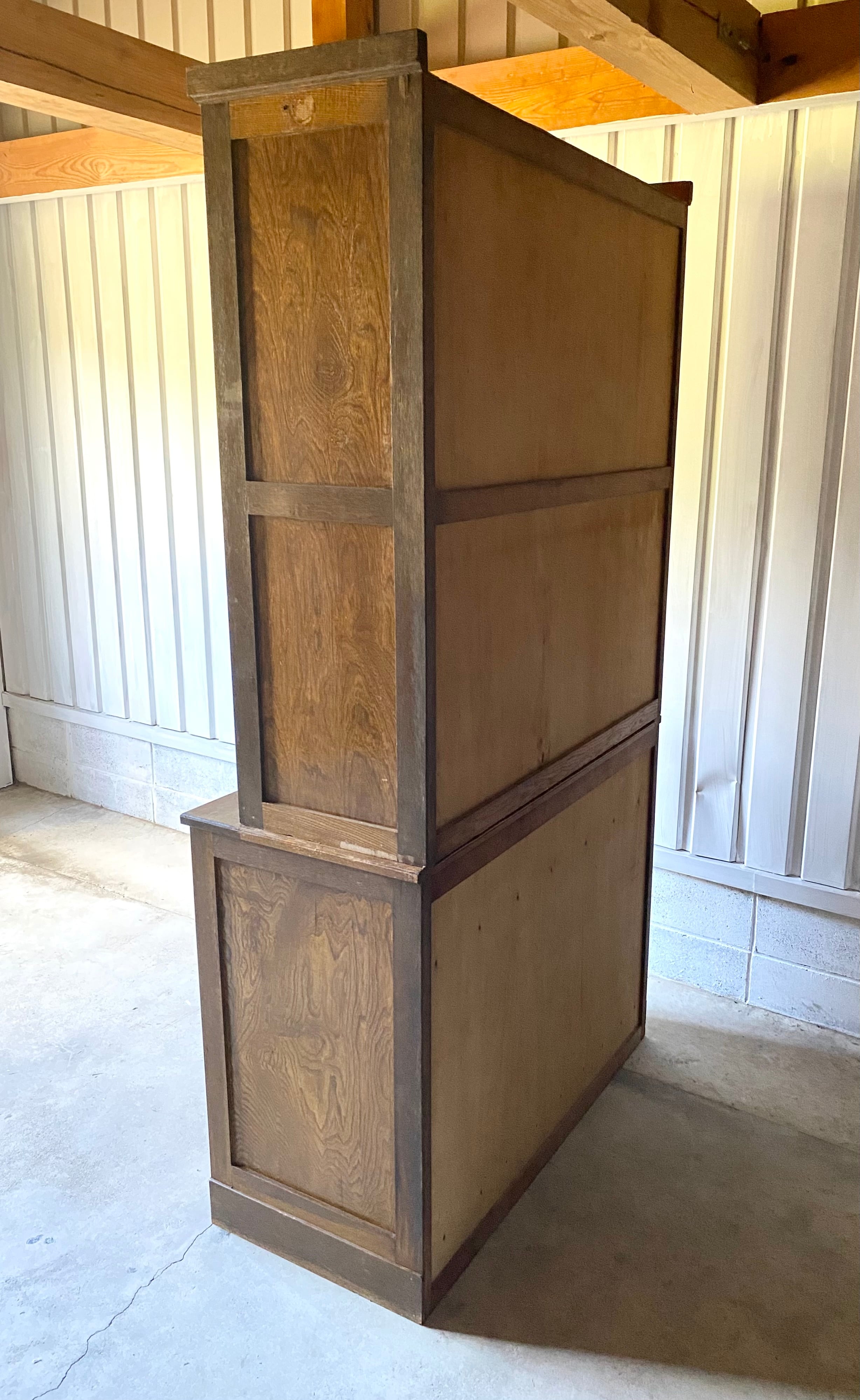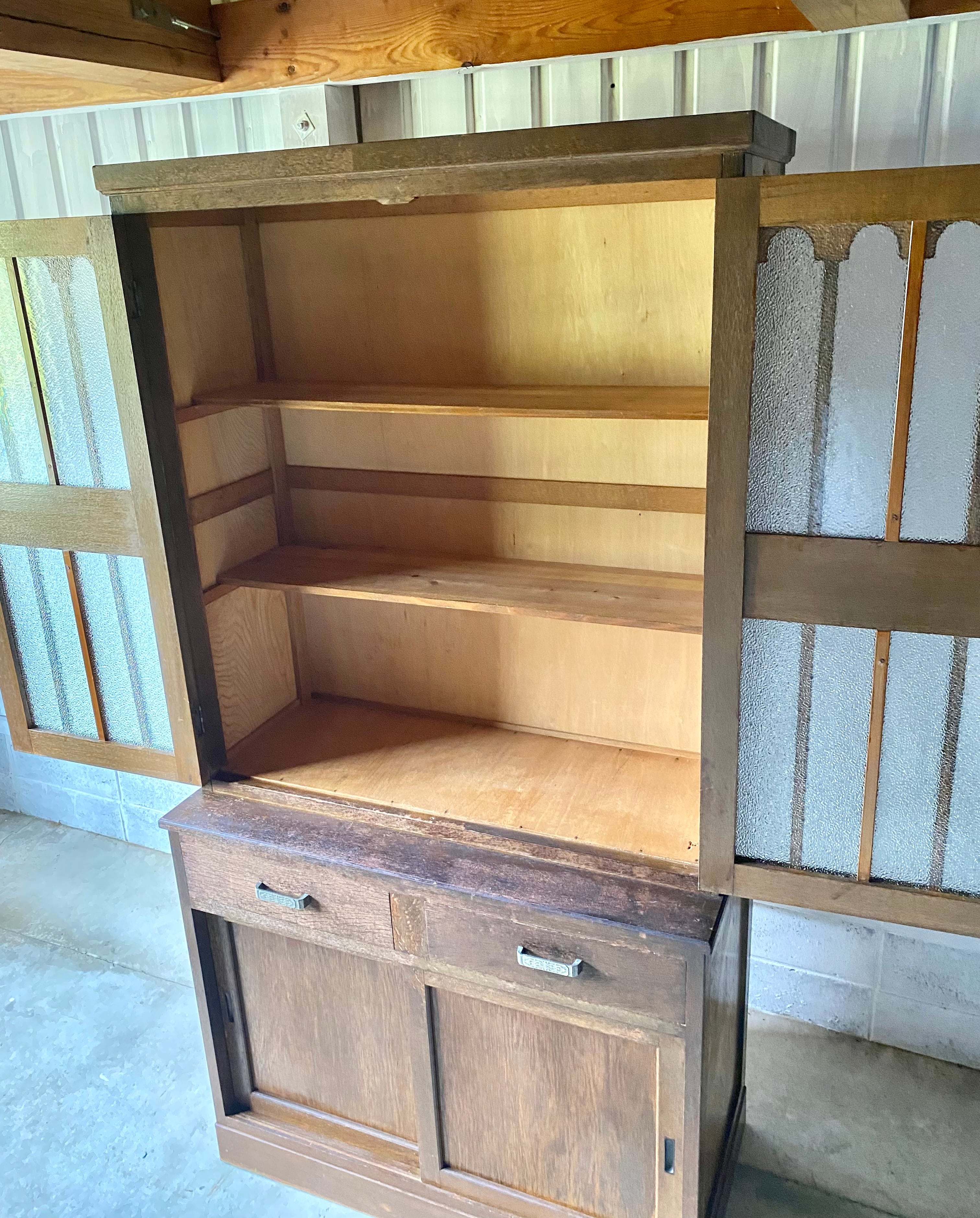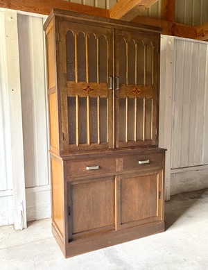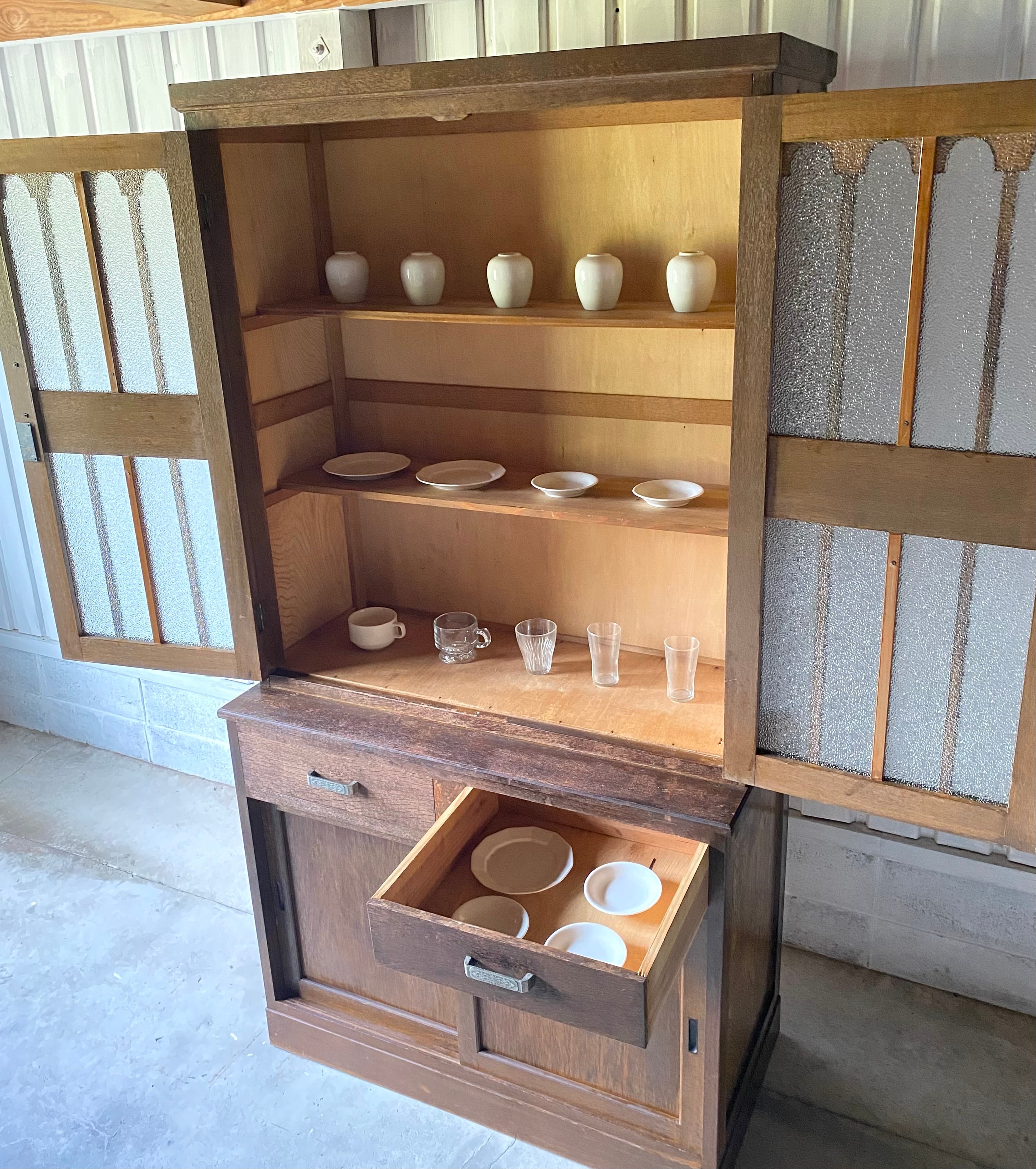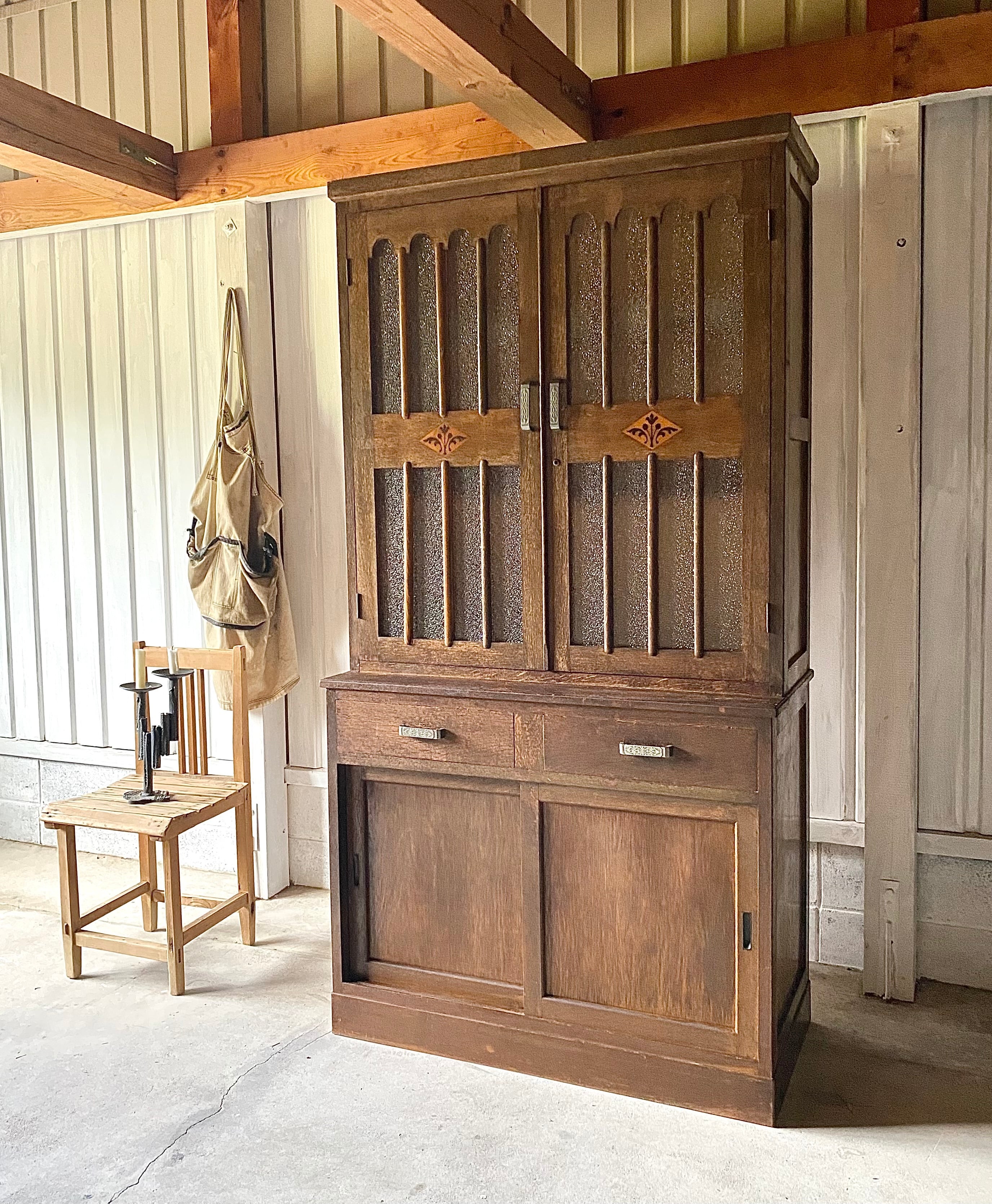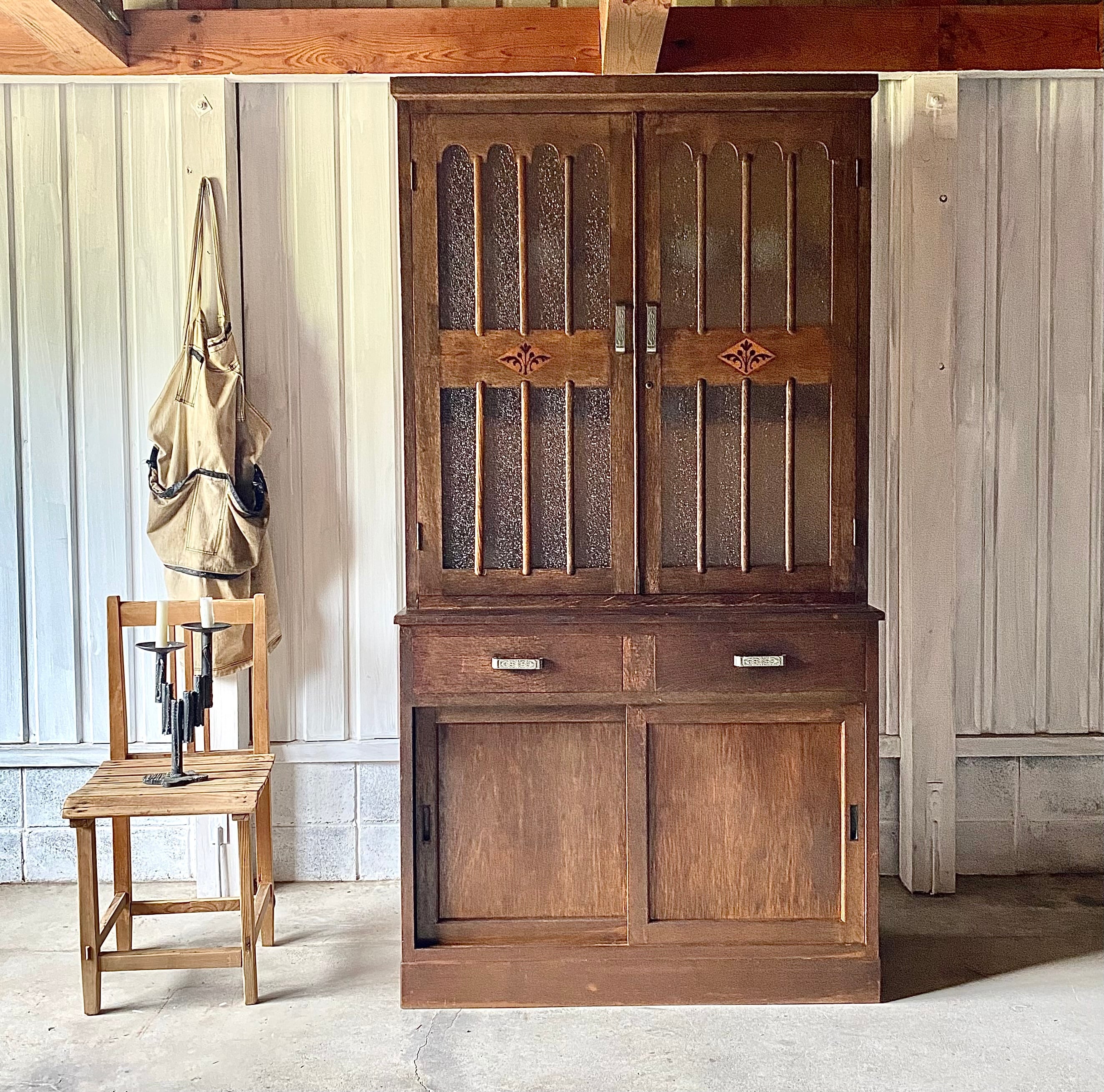 経年変化の雰囲気ある木肌と取手、品のある姿が感じ良い食器棚。扉戸、引出し、引戸の開閉は比較的スムーズに行えます。キッチンで食器棚としてやリビングやアトリエで本や小物の収納棚としても素敵です。