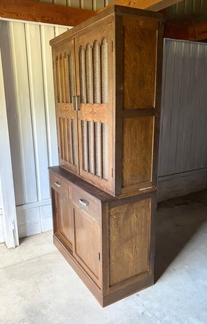 古い食器棚になります。スレや当たりキズ、禿げ、欠け、サビ、反り、落としきれない汚れなどがあります。扉戸、引出し、引戸の開閉は比較的スムーズに行えます。棚は上下分かれます。特に目立つガラスの割れはなく、全体的に状態も良いのでまだまだ実用的にお使いいただけます。