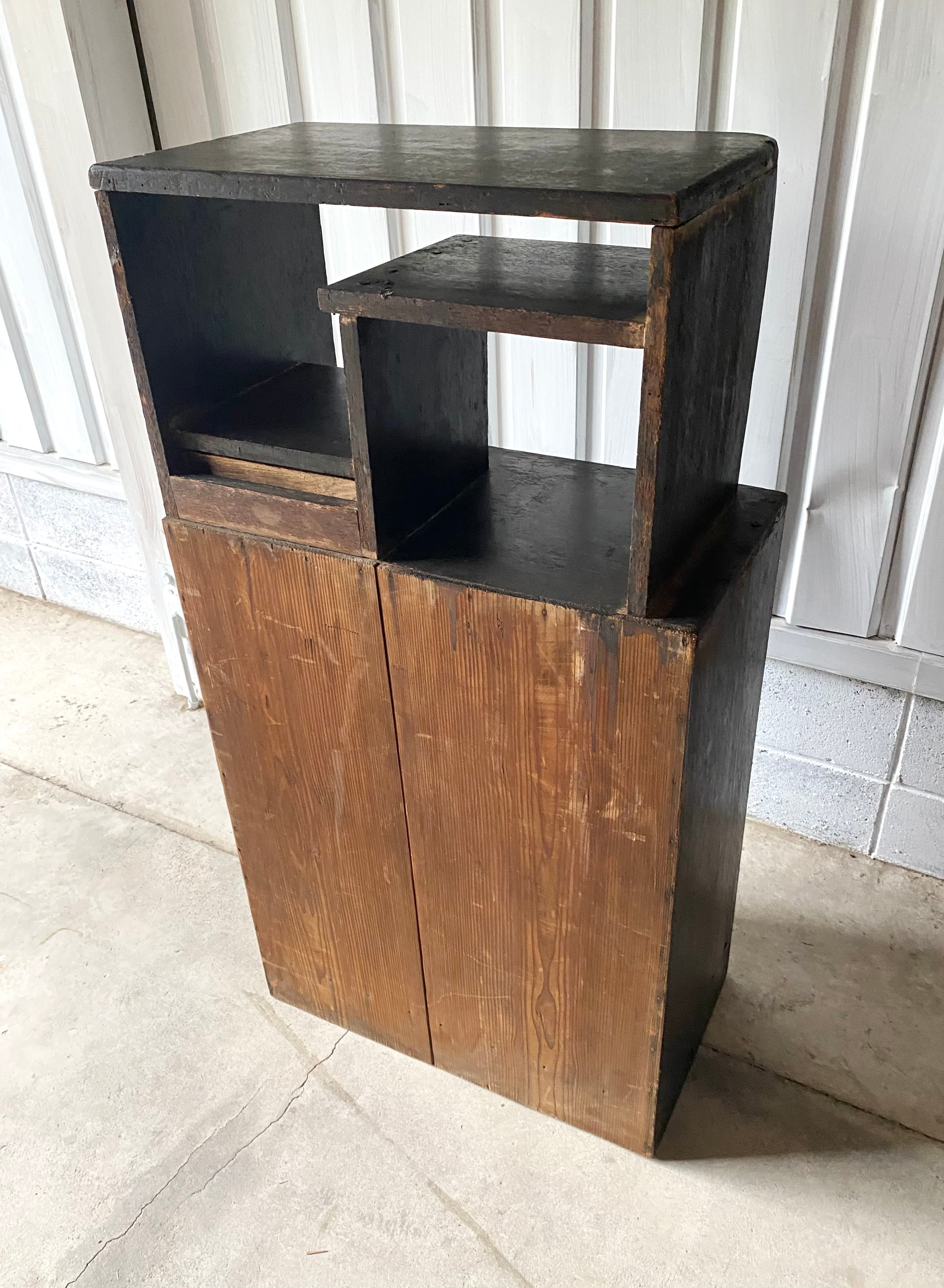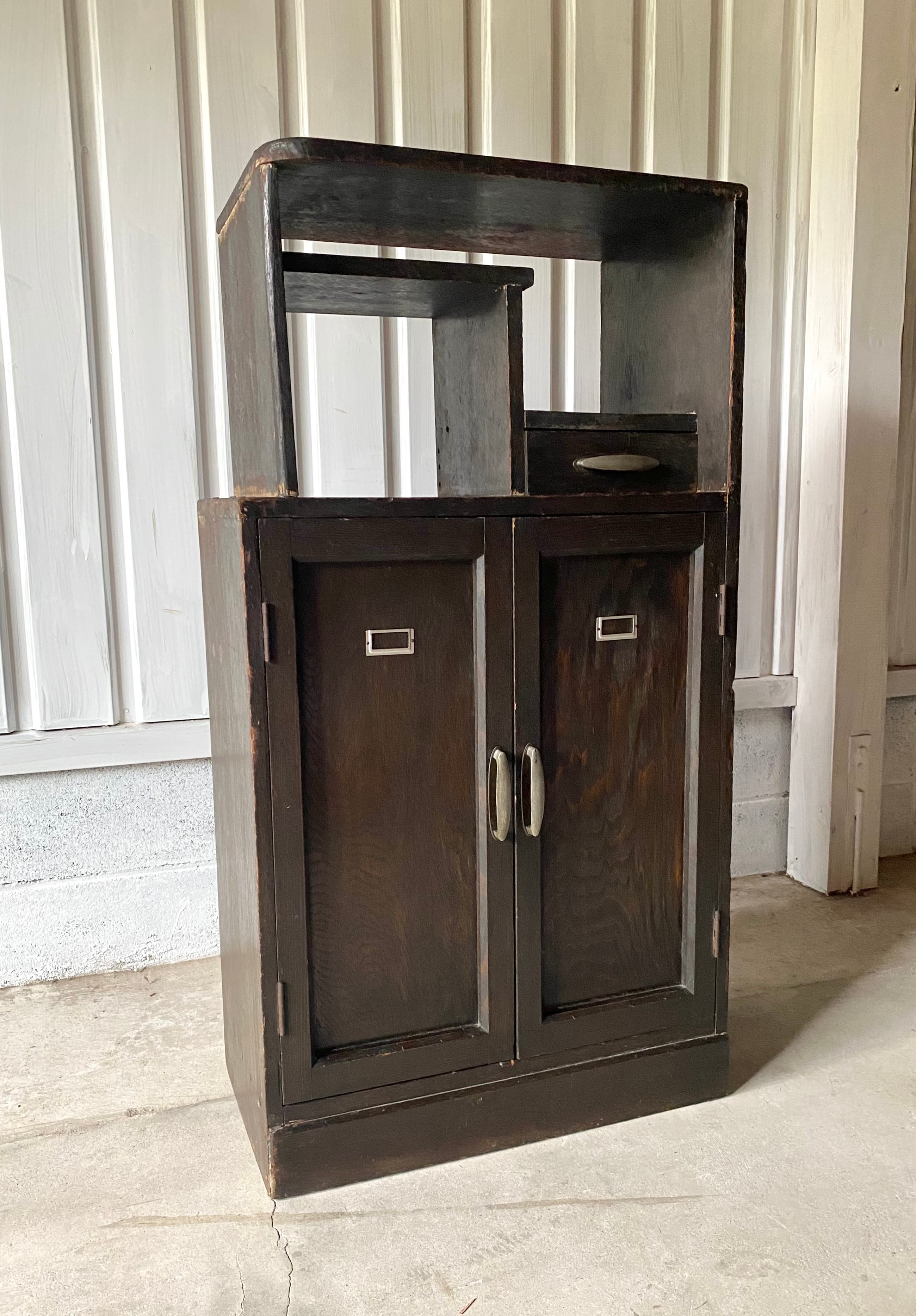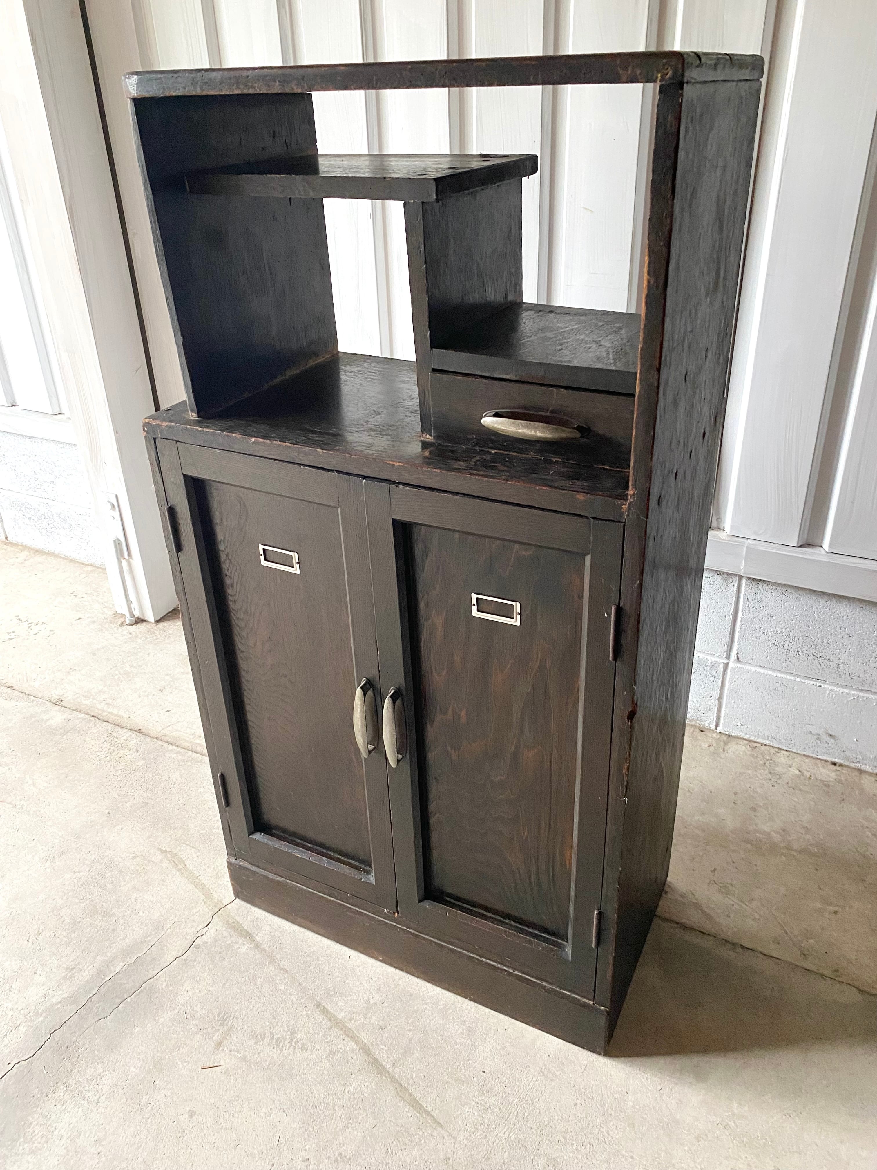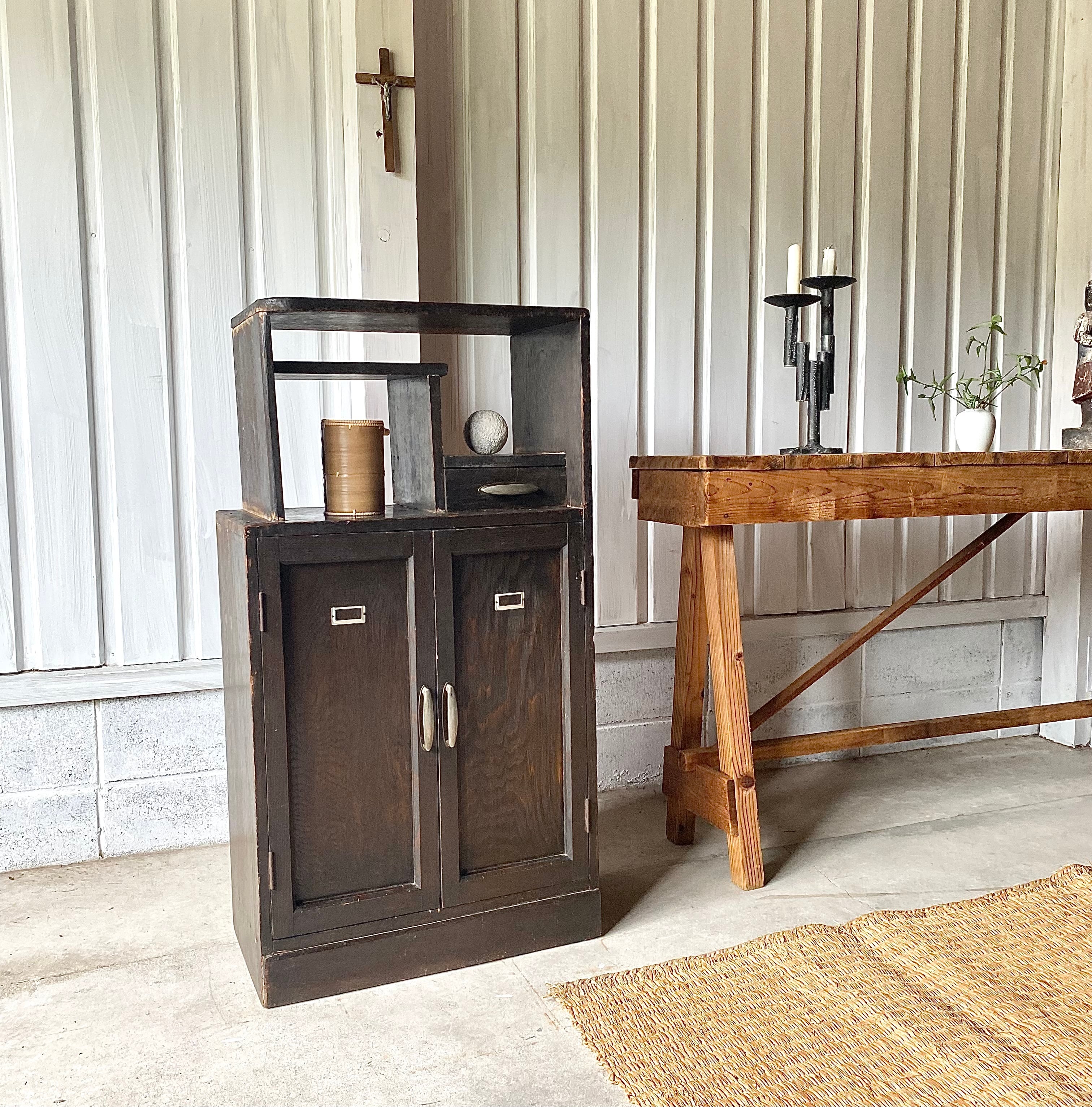 古い収納棚になります。スレや当たりキズ、禿げ、欠け、反り、落としきれない汚れなどがあります。引出し、扉戸の開閉は比較的スムーズに行えます。全体的に状態も良いのでまだまだ実用的にお使いいただけます。
