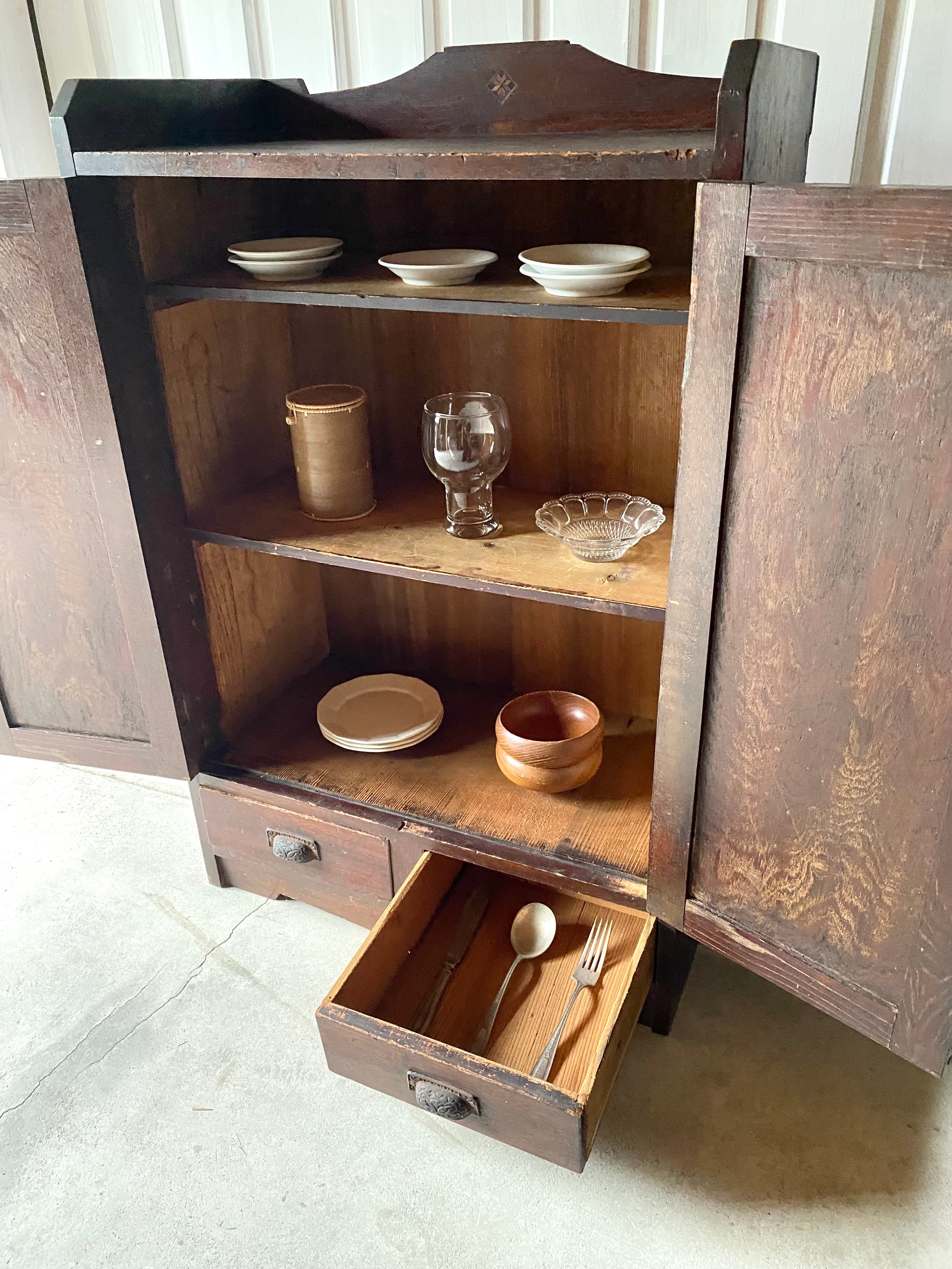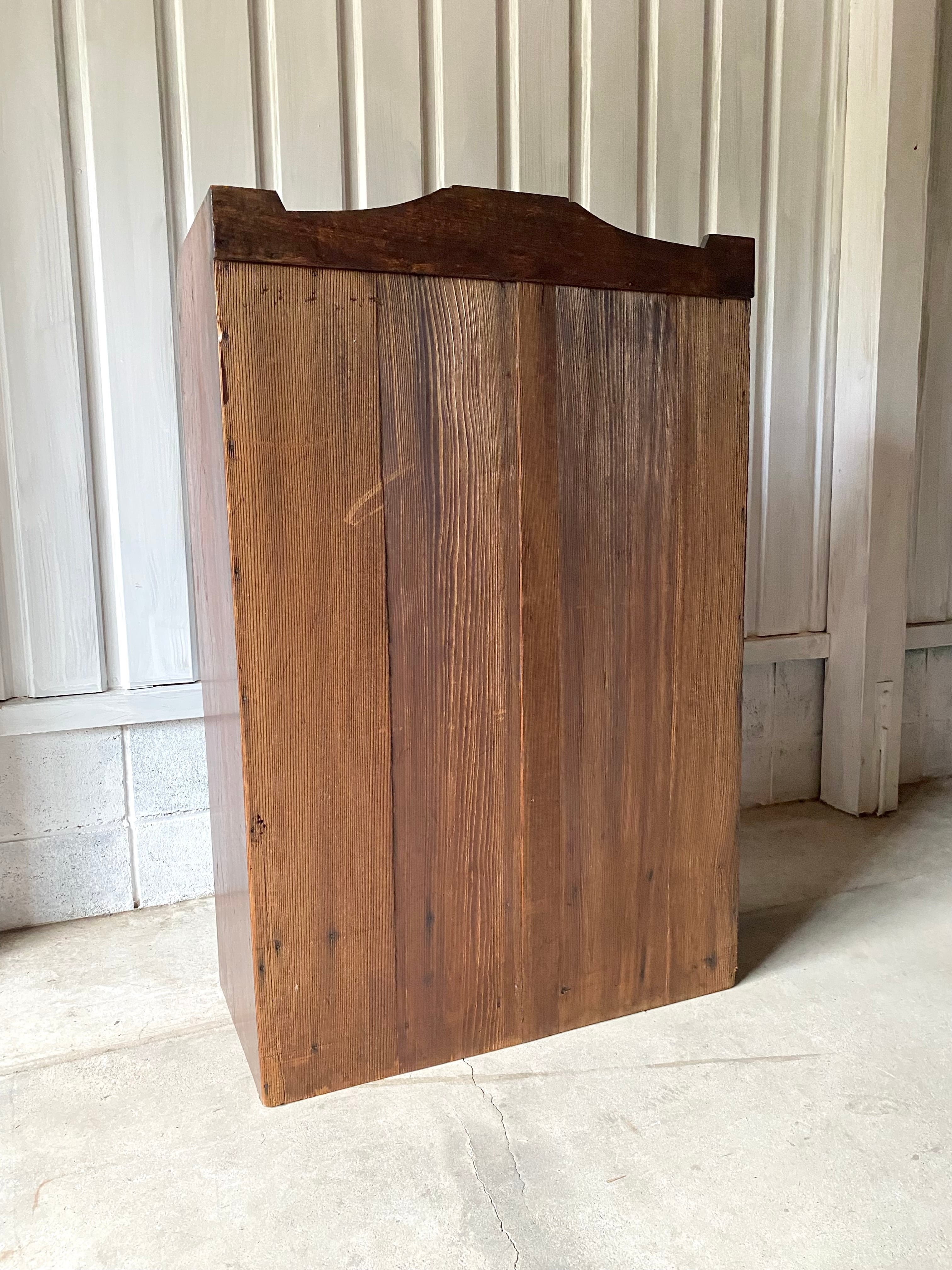 経年変化の味のあるある木肌と取手、上品な佇まいが感じ良い収納棚。キッチンで食器棚としてやリビングや趣味部屋、アトリエで本や小物の収納としても素敵にお使い頂けます。