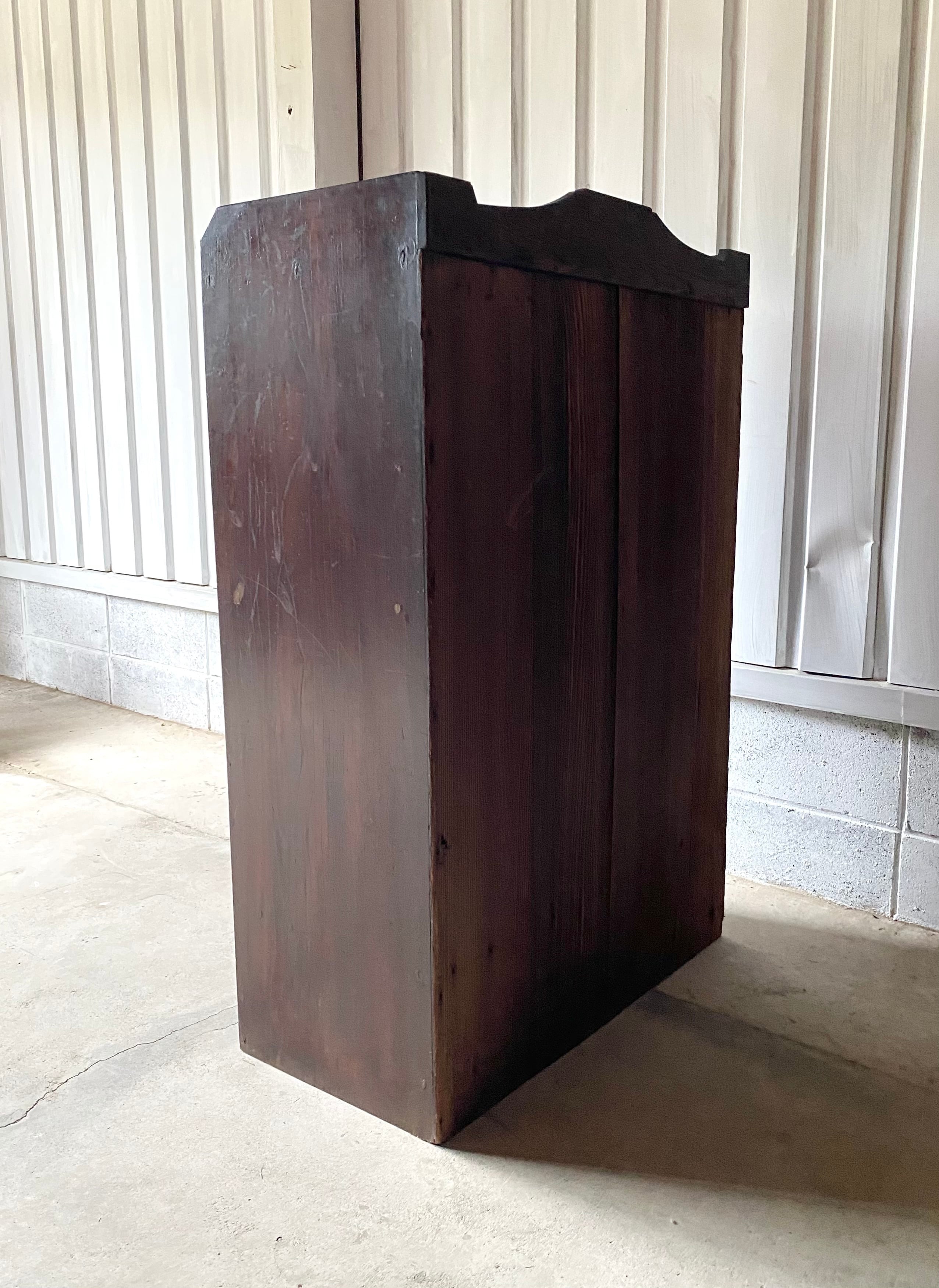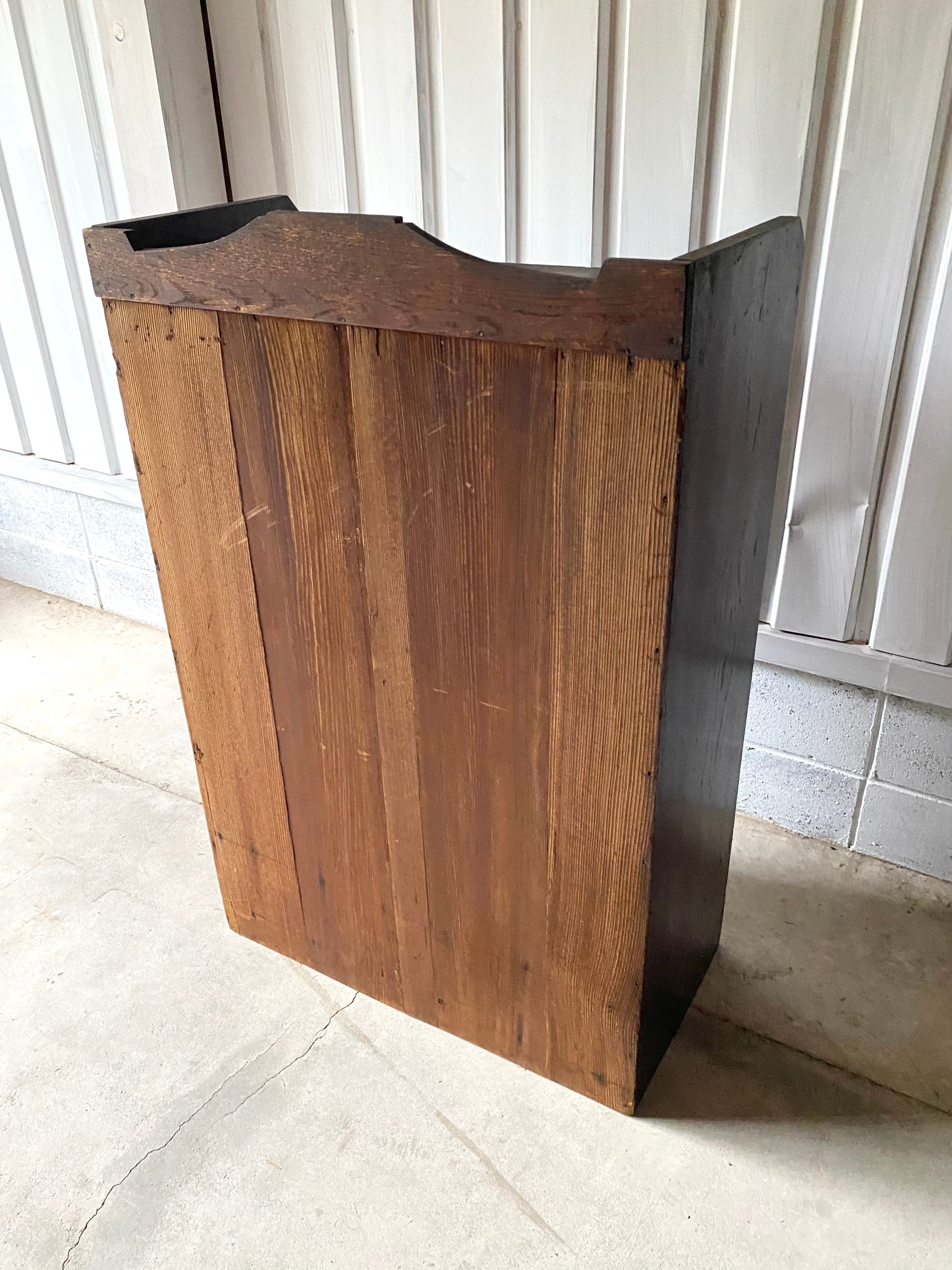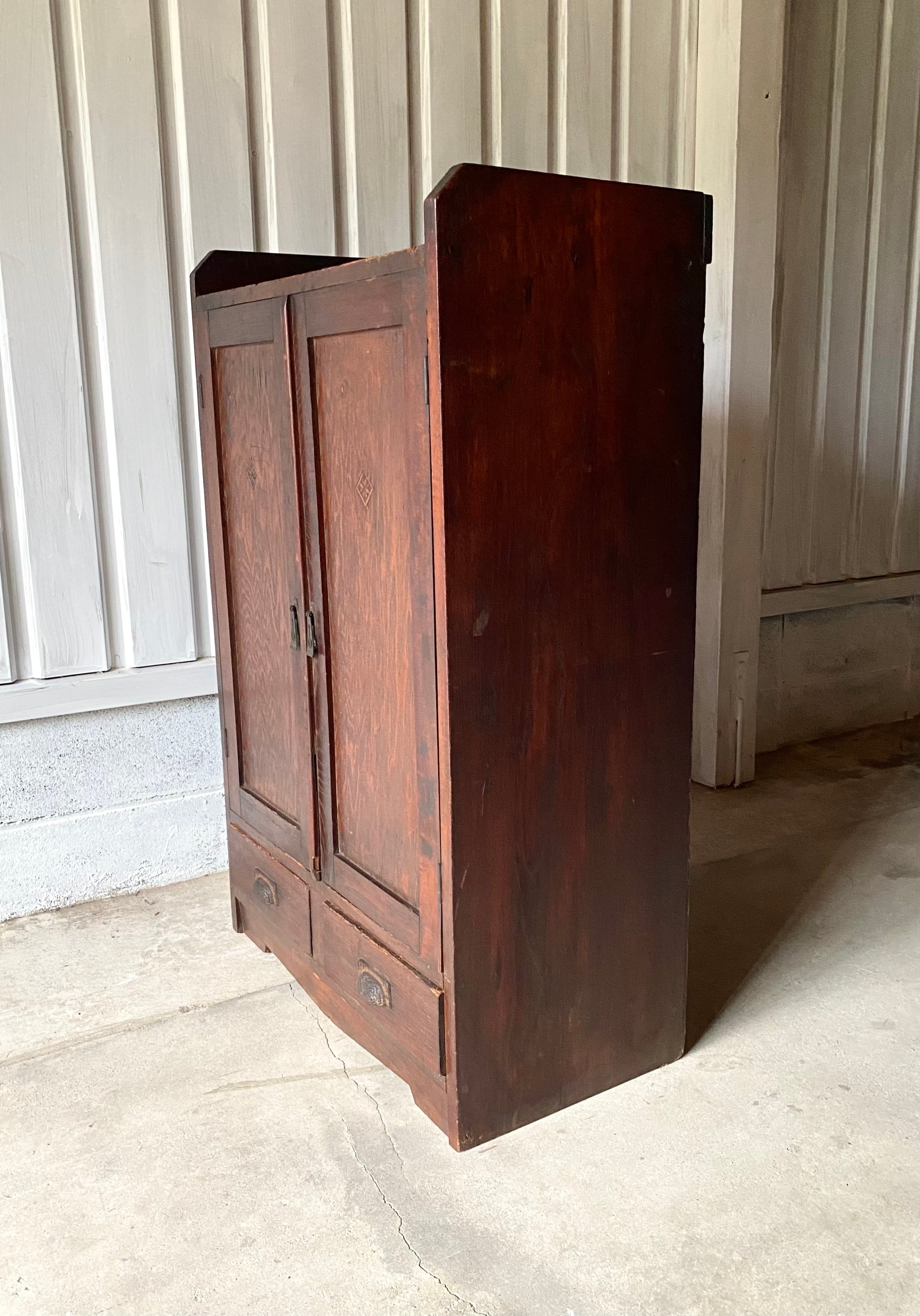 古い収納棚になります。スレや当たりキズ、禿げ、欠け、反り、サビ、落としきれない汚れなどがあります。引出し、扉戸の開閉は比較的スムーズに行えます。全体的に状態も良いのでまだまだ実用的にお使いいただけます。