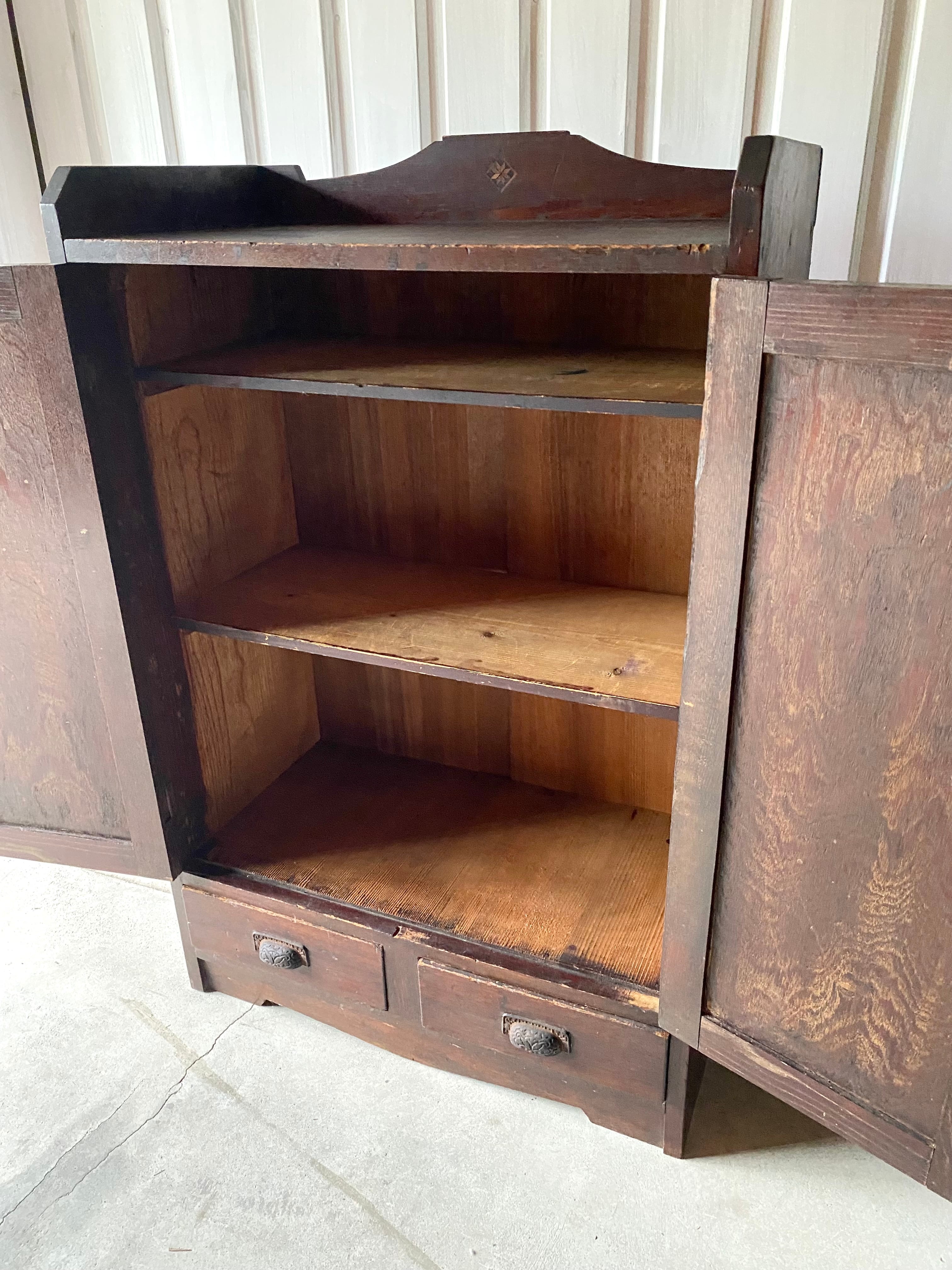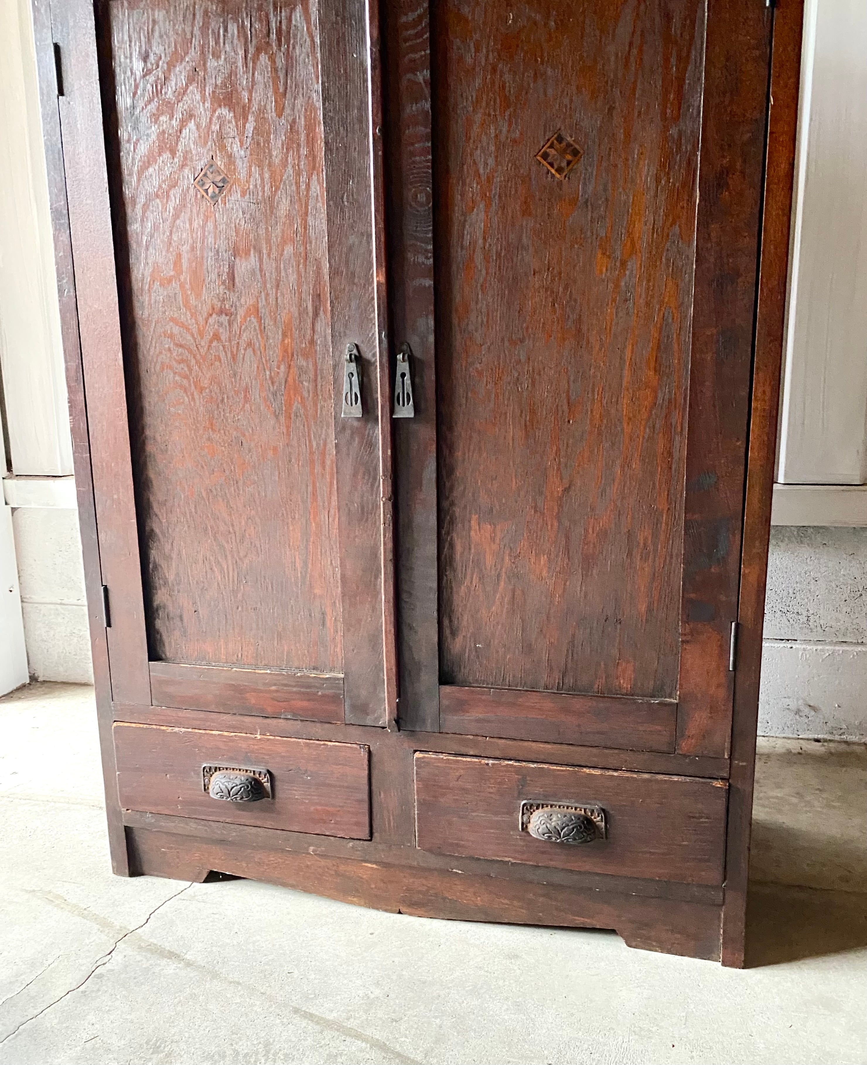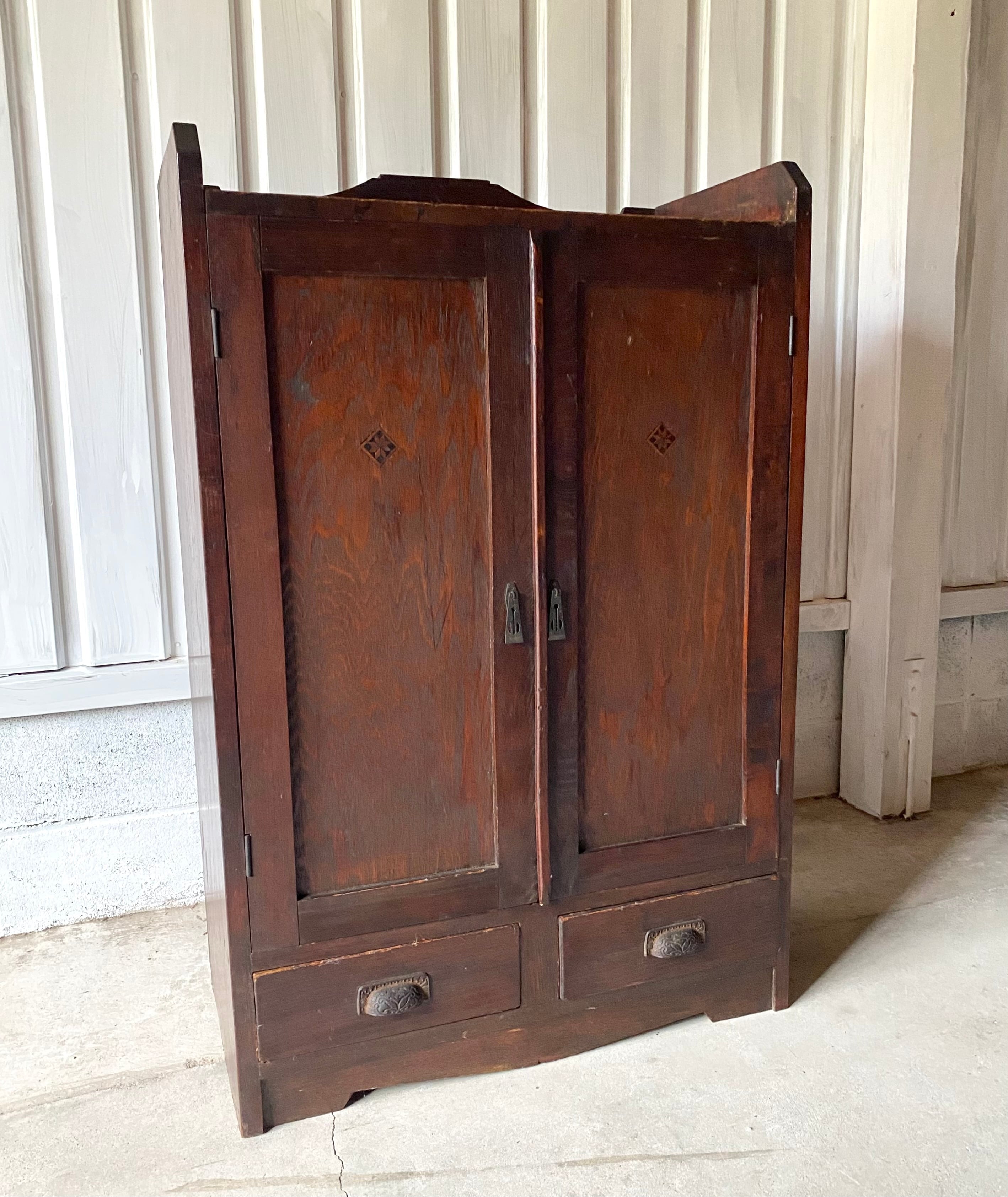古い収納棚になります。スレや当たりキズ、禿げ、欠け、反り、サビ、落としきれない汚れなどがあります。引出し、扉戸の開閉は比較的スムーズに行えます。全体的に状態も良いのでまだまだ実用的にお使いいただけます。