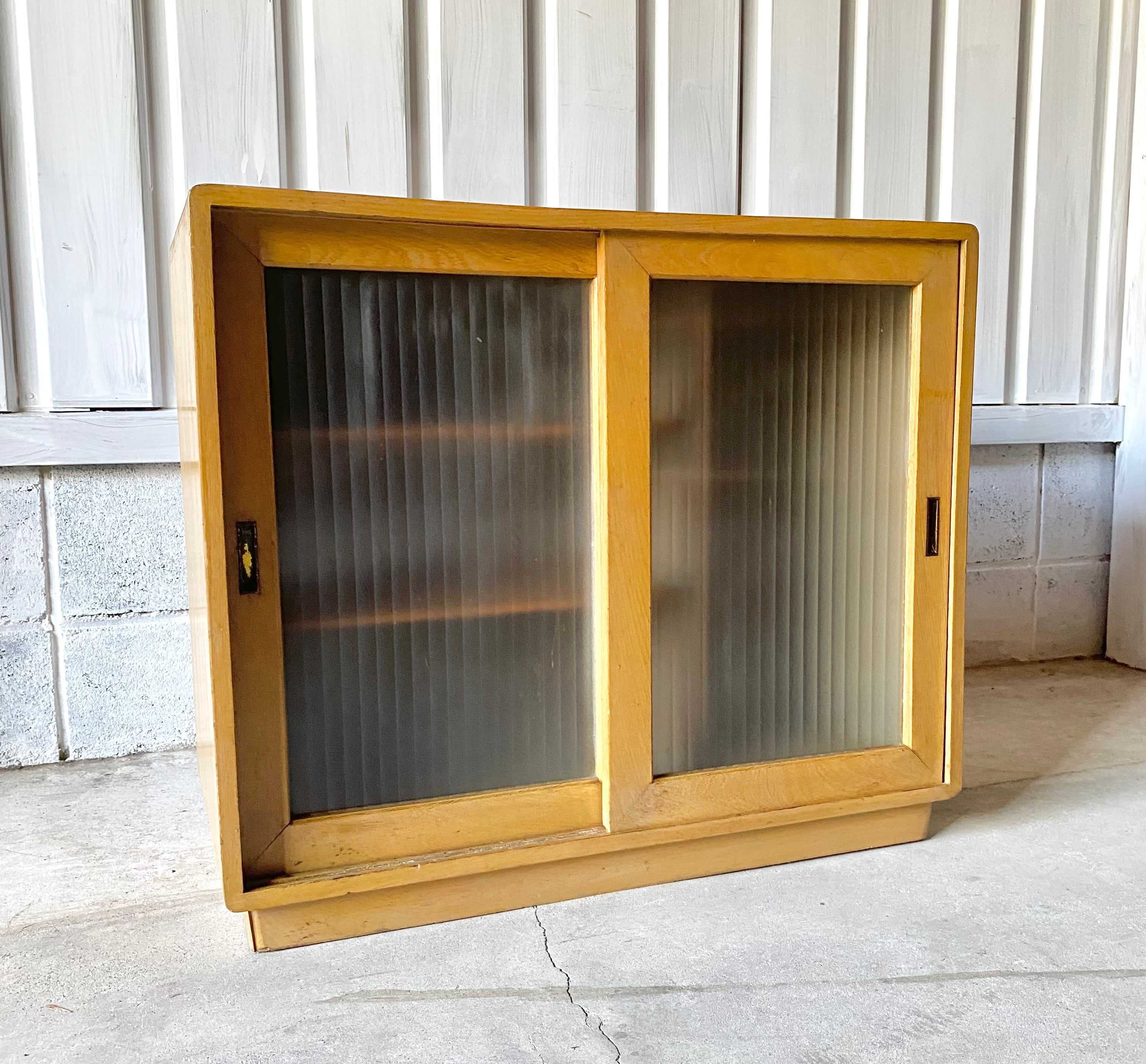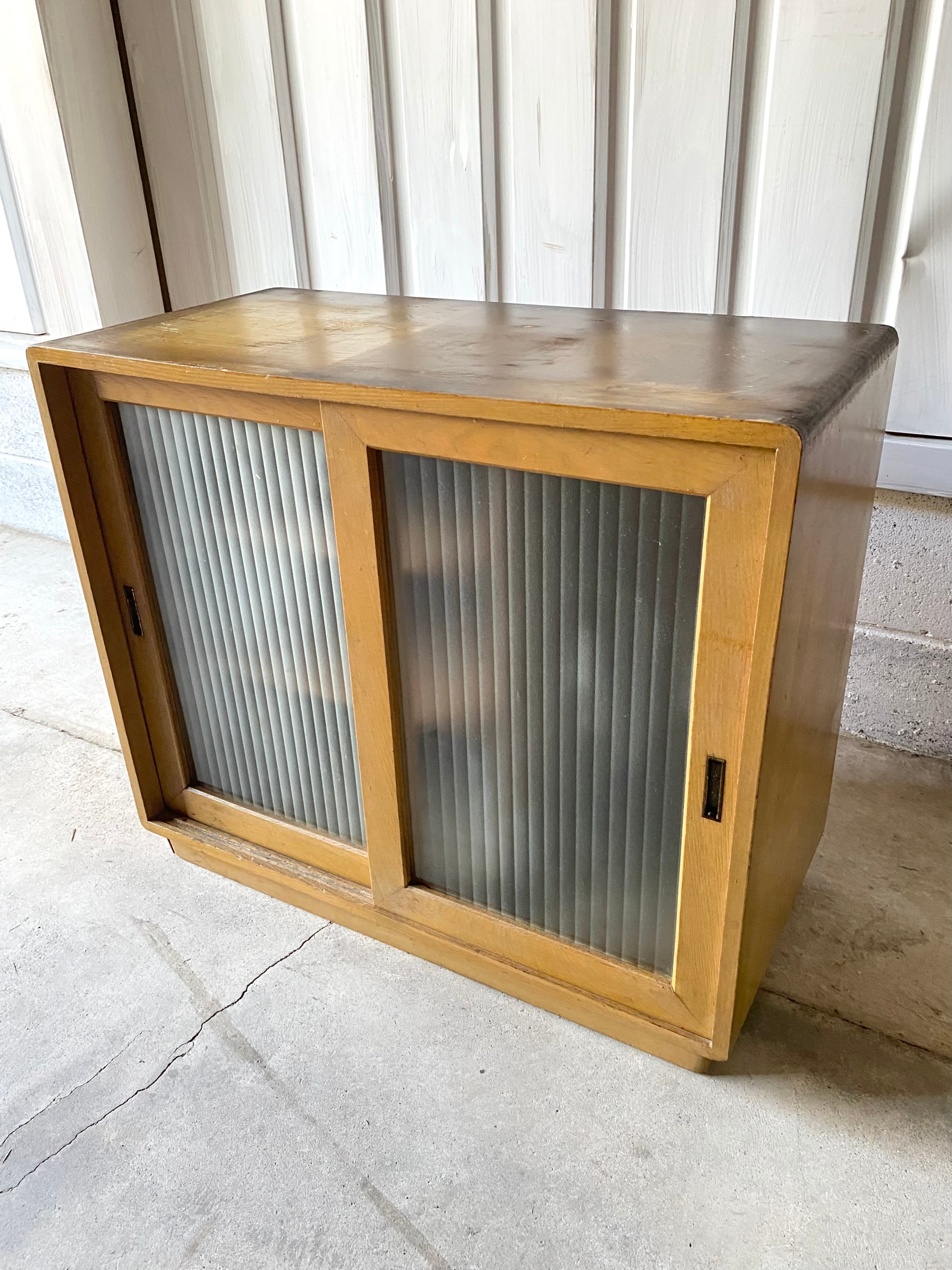 経年変化の雰囲気あるナチュラルな木肌とガラス引戸が感じ良い収納棚。引戸の開閉はスムーズに行えます。キッチンやリビングなどのカウンター上や棚横に置いて、食器や調味料、本や小物のストック棚としても活躍してくれそうです。