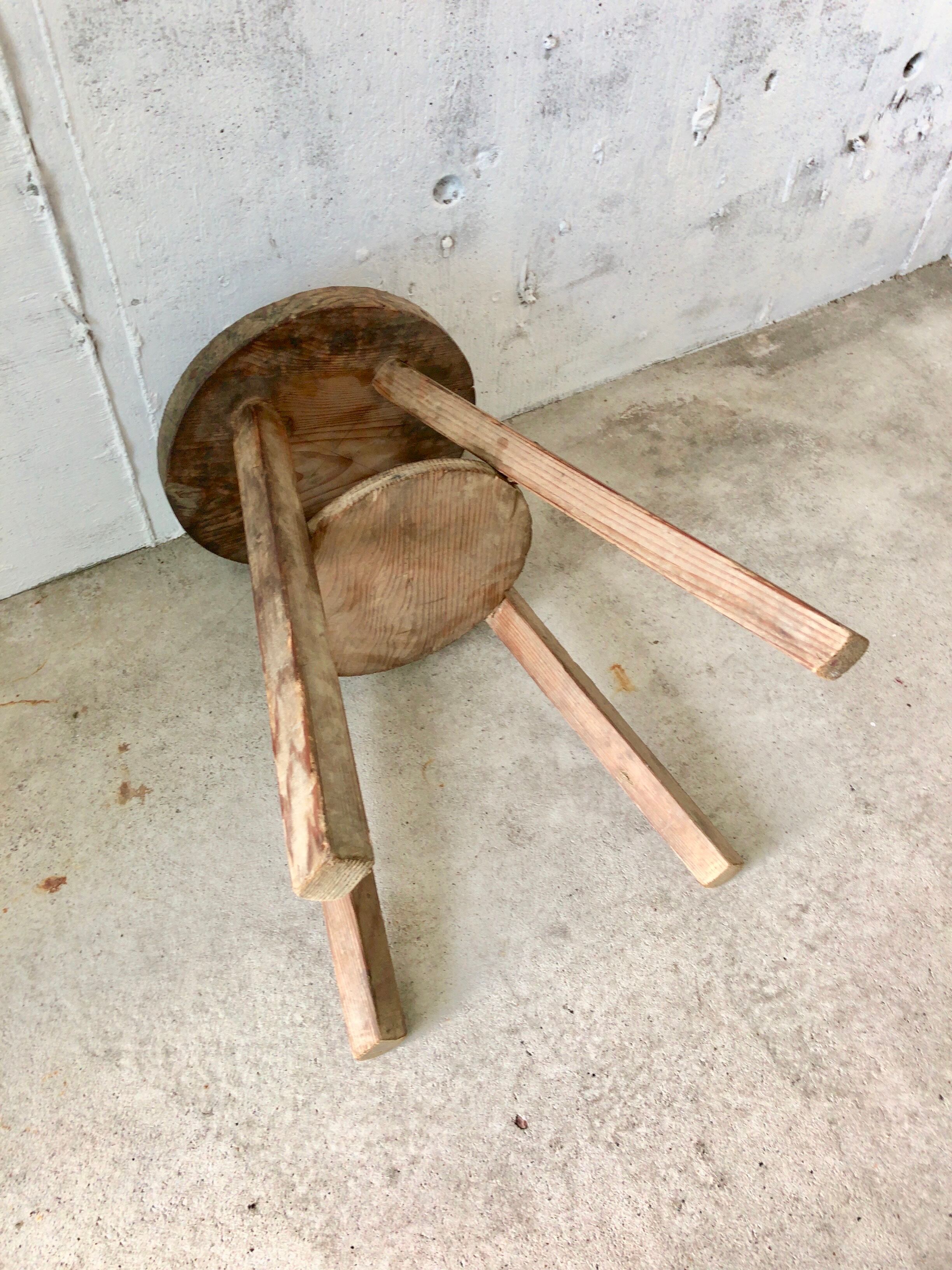 古いスツールになります。スレや剥げ、割れ、欠け、当たりキズ、落としきれない汚れなどがあります。少しのがたつきはありますが、しっかりとした造りで全体的に状態も良いので、まだまだ実用的に活躍してくれます。