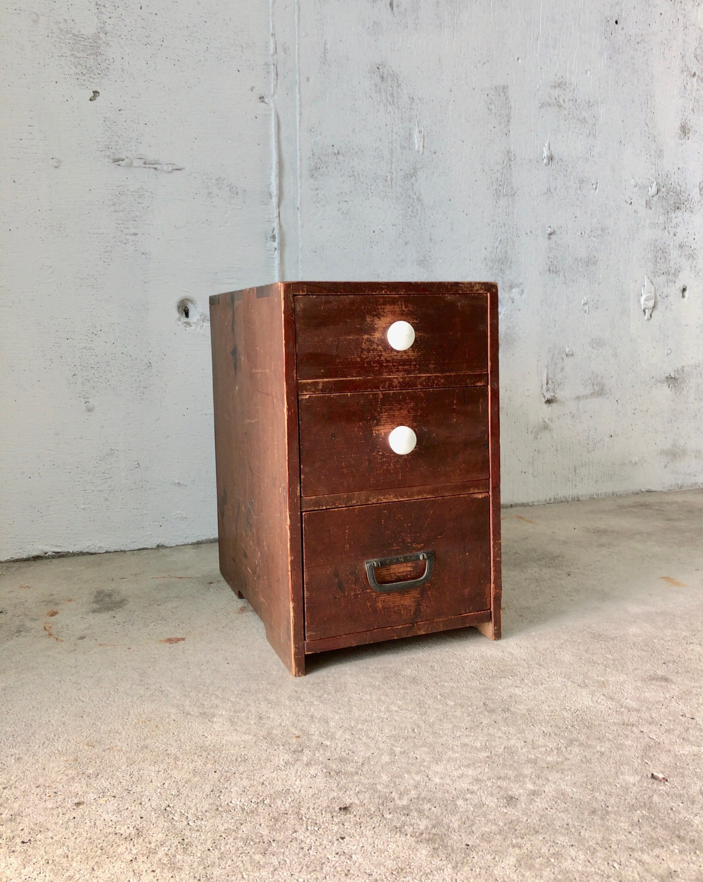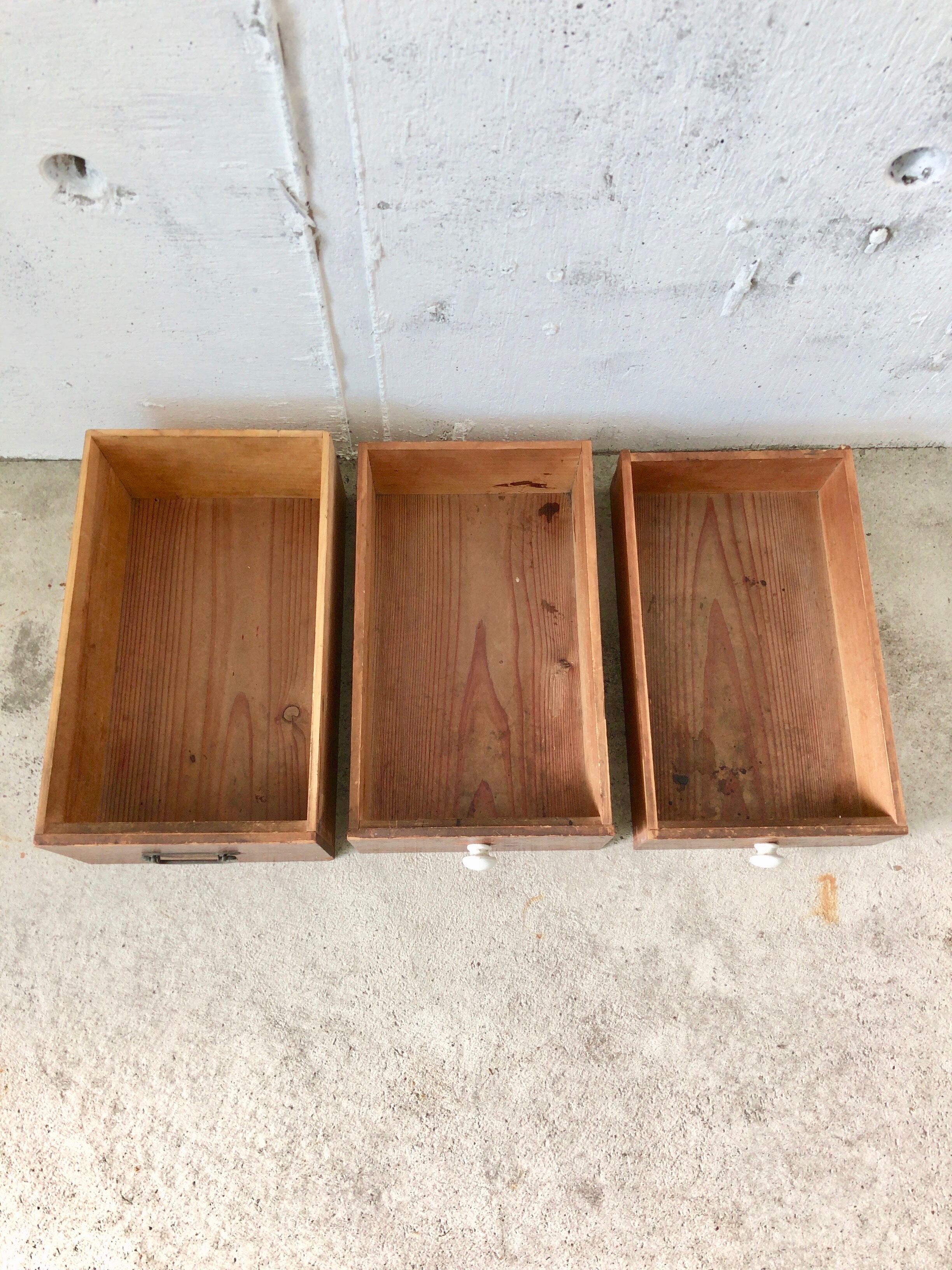 経年変化の雰囲気の良い木肌、白い取手が感じ良い小引き出し。引出し中は少し汚れがありますが開閉はスムーズに行え、日常気軽にお使いいただけます。リビングや作業場などで細々したもの、パーツの収納にも素敵です。