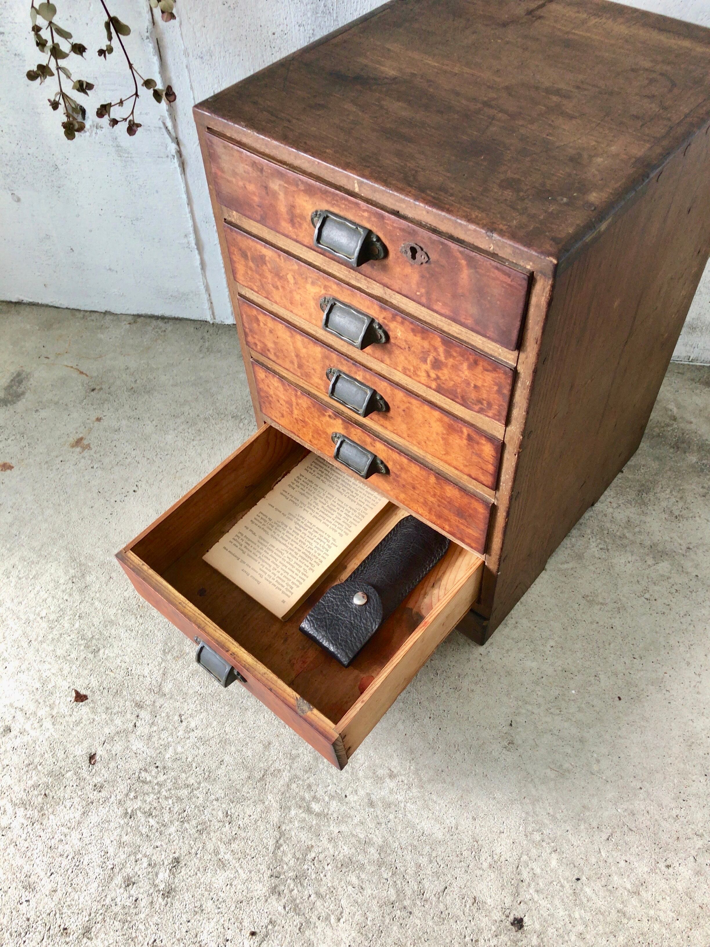 古い小引出しになります。スレや当たりキズ、禿げ、欠け、割れ、落としきれない汚れなどがあります。引出し中は少し汚れがありますが開閉はスムーズに行え、日常気軽にお使いいただけます。引出しはB5サイズが入る大きさです。全体的に状態も良いのでまだまだ実用的にお使いいただけます。