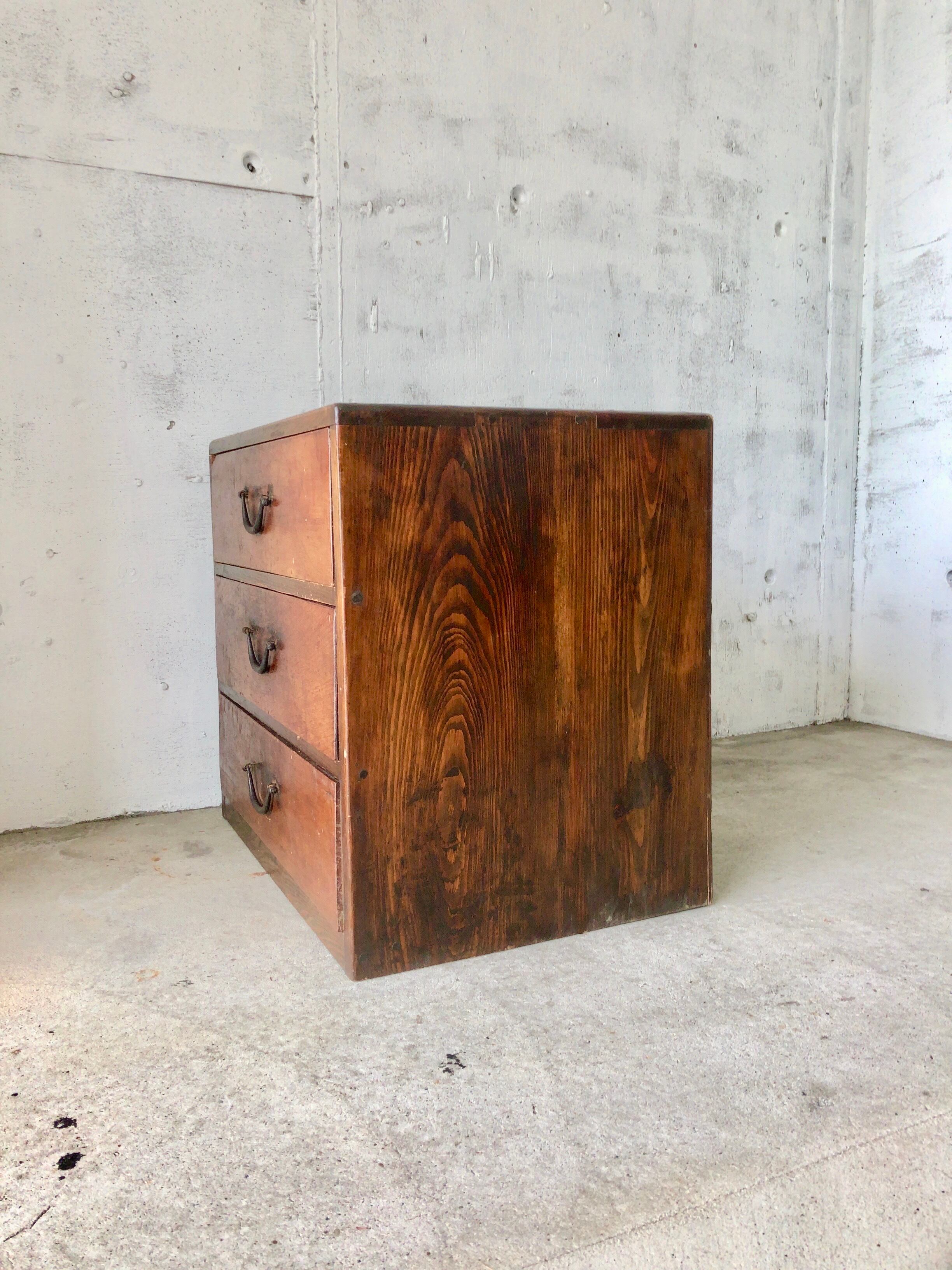 経年変化の良い木肌、味のある取手が感じ良い収納棚。引出し中は少し汚れがありますが、開閉は比較的スムーズに行え日常気軽にお使いいただけます。収納中は深さのある引出しが3段あり、収納力も十分です。作業テーブルの脇に置いて書類などの整理収納に使ってみたり、寝室のベッド横で卓上ランプなどを置いてサイドテーブルとして使ってみても素敵です。