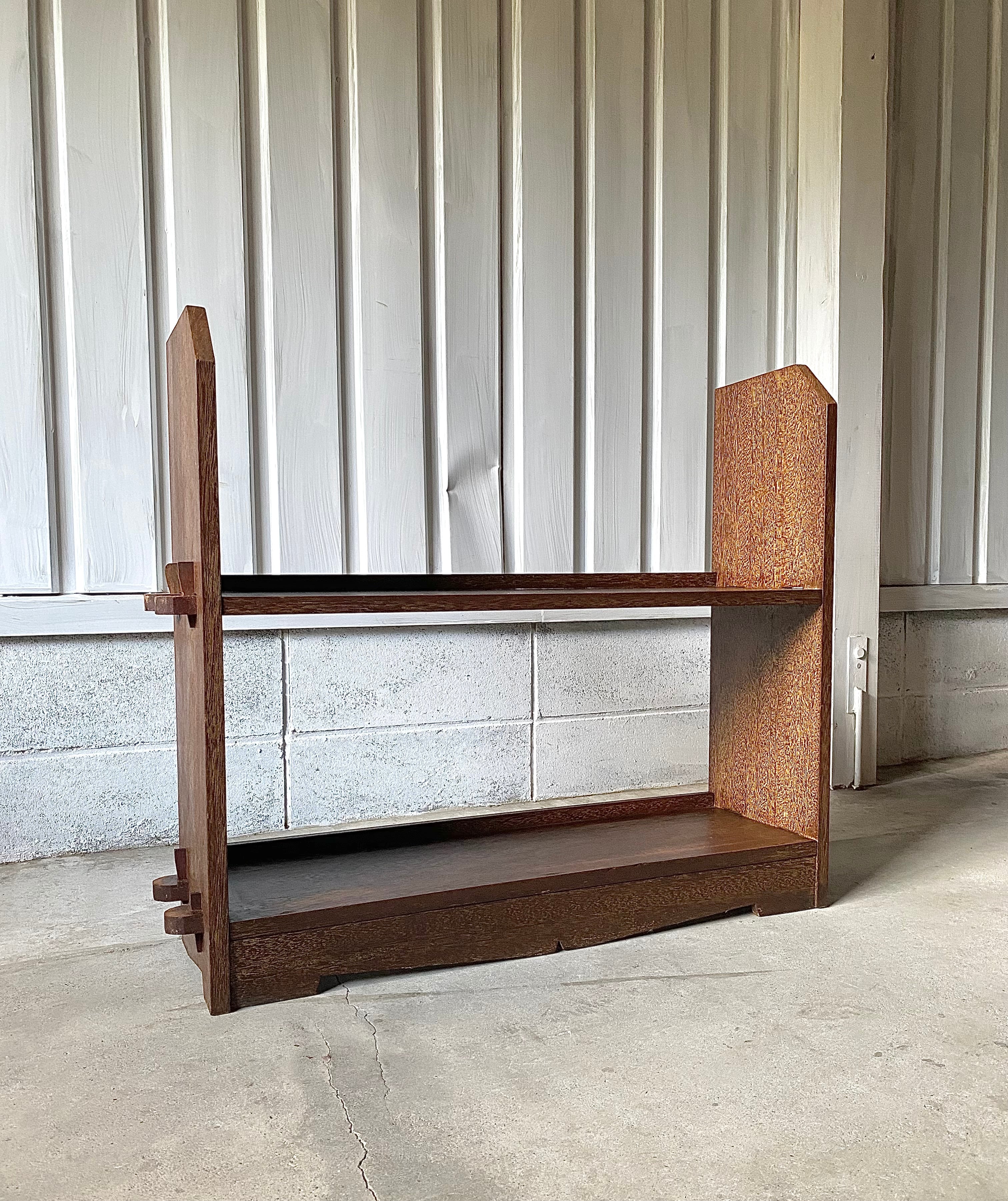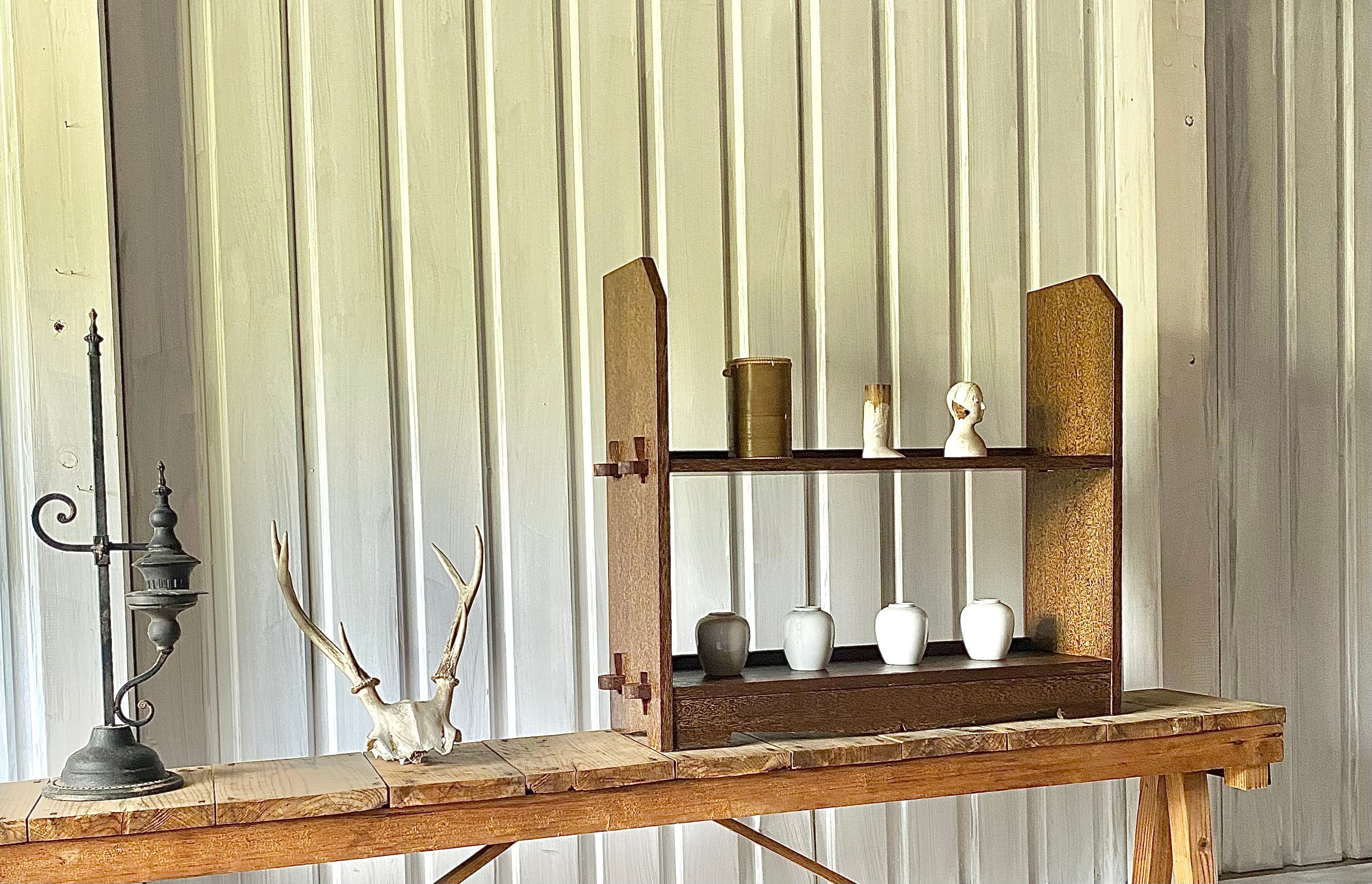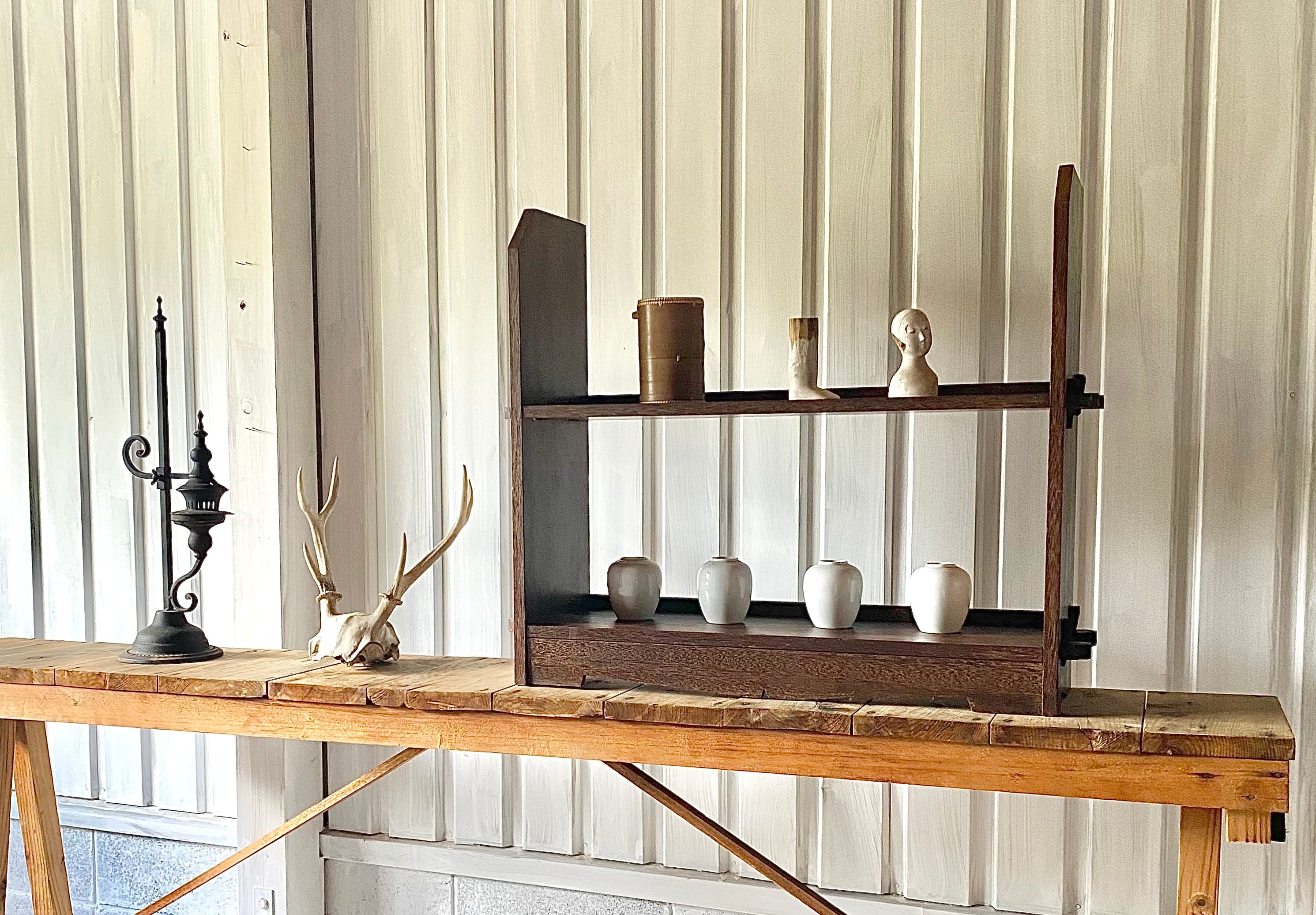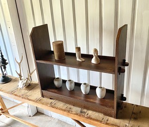 経年変化の落ち着きある佇まい、すっきりとした姿がお部屋にすっと馴染んでくれる楔棚。釘を使わず楔で組み立てられていてしっかりとした造りです。お部屋の卓上やカウンター上に置いて、お気に入りの小物や植物をディスプレイしても可愛いです。