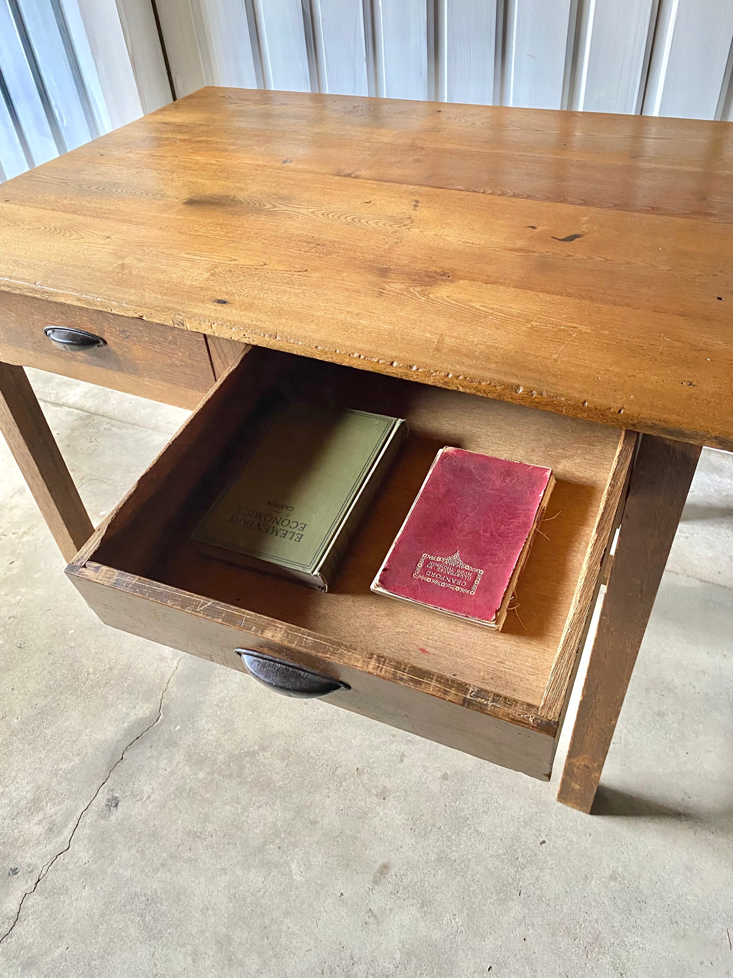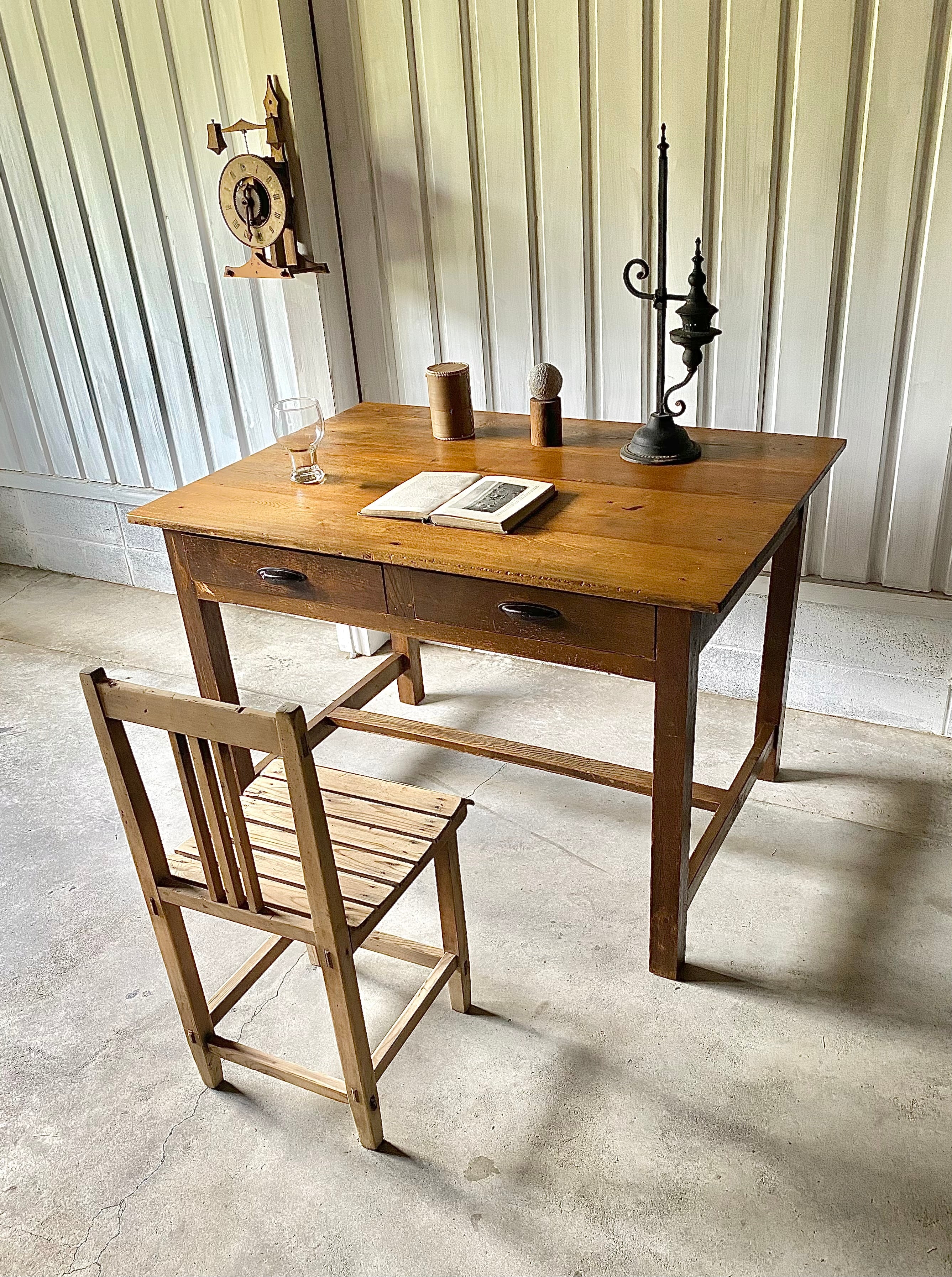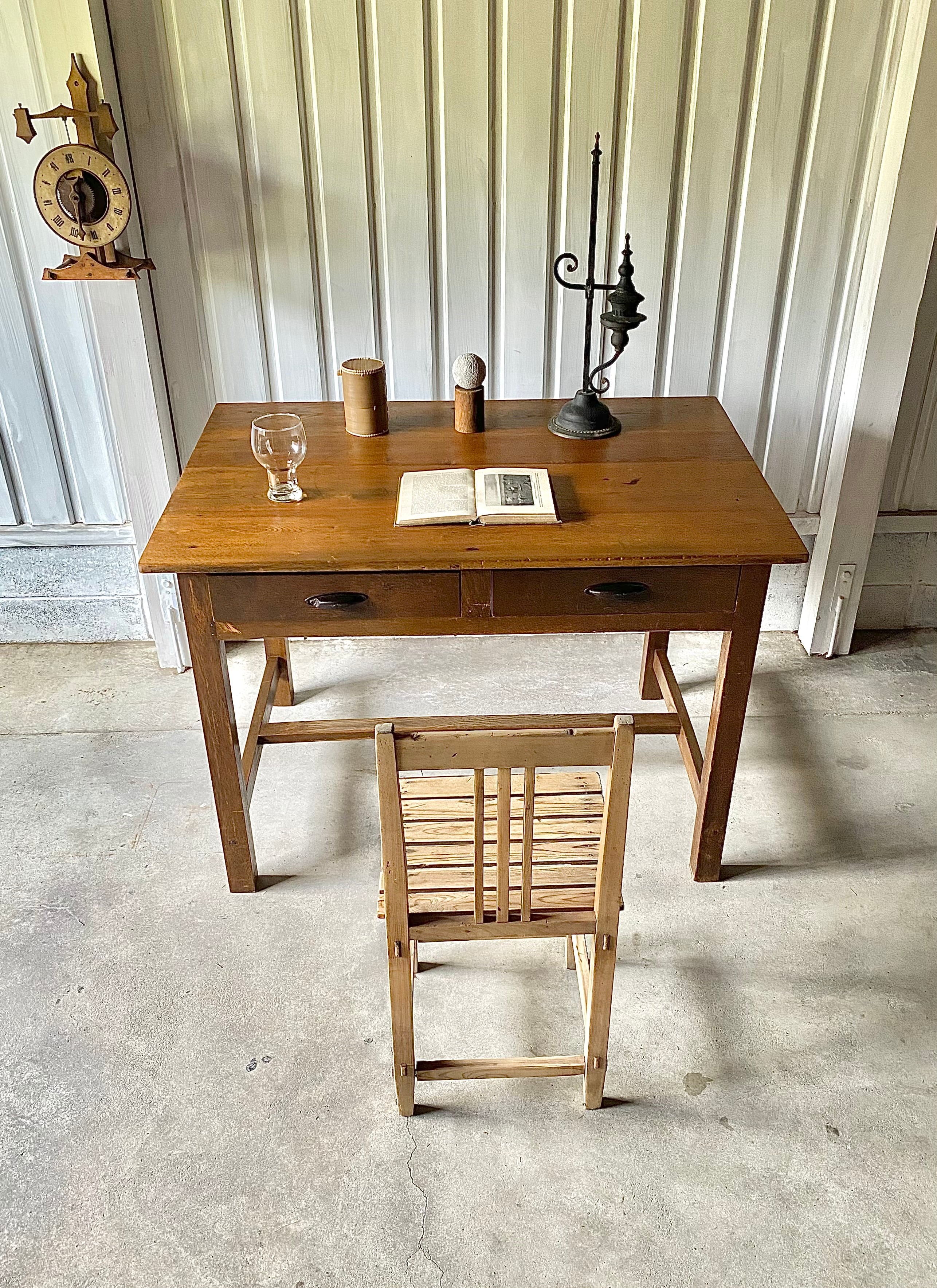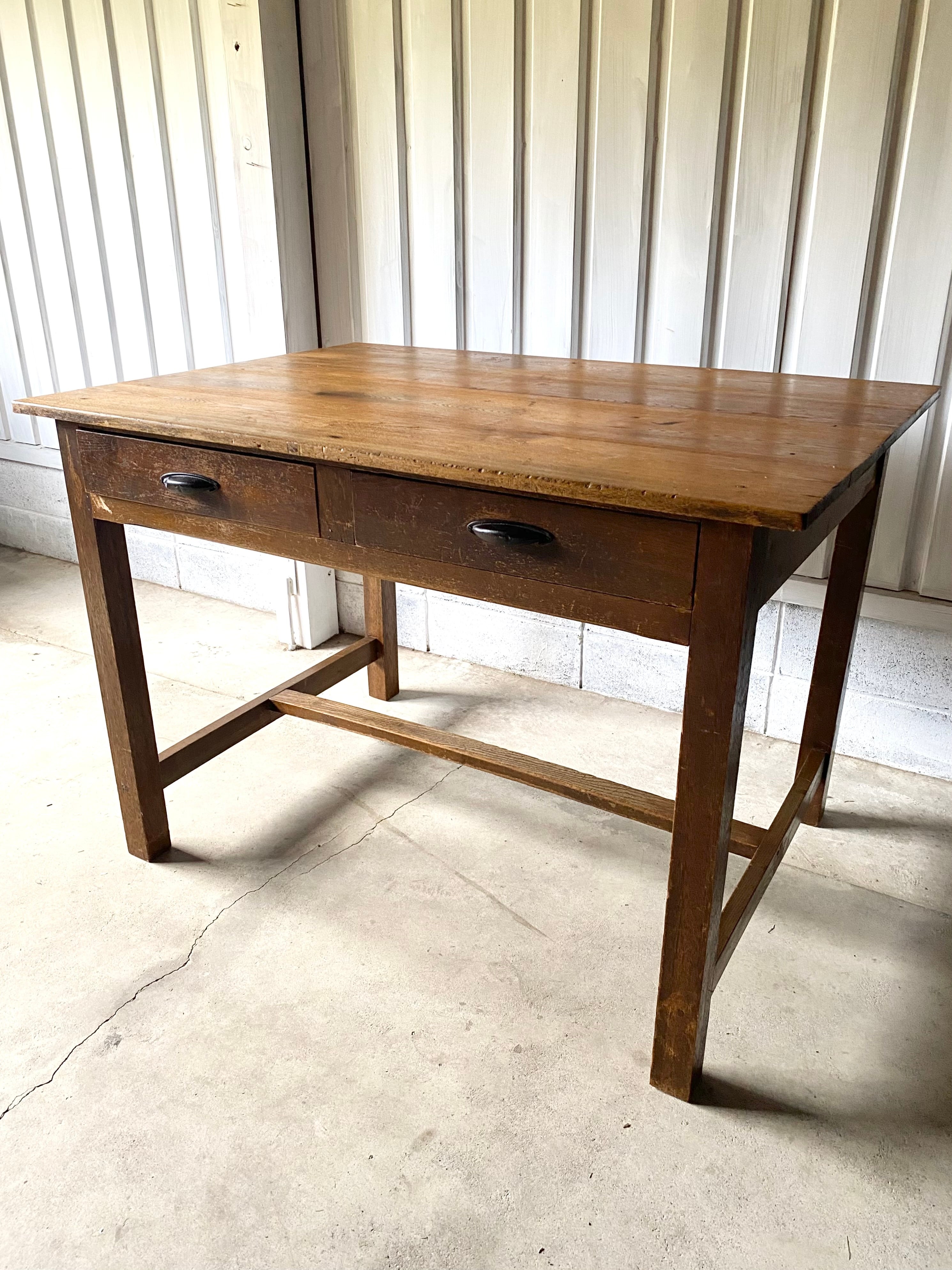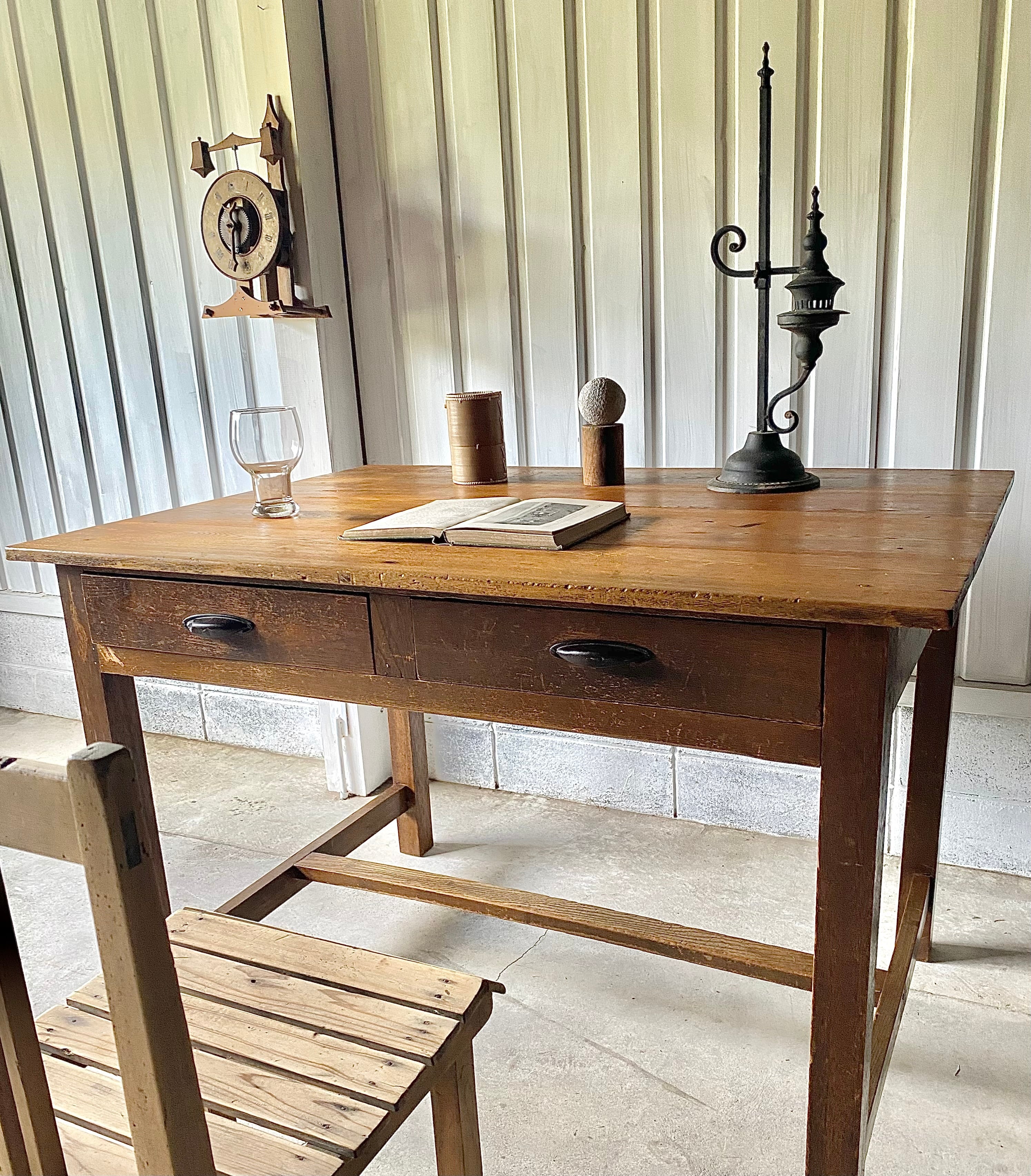 経年変化の雰囲気ある木肌と味のある取手、すっきりとした姿が感じ良い木製デスク。作業部屋でパソコン作業や書物をするデスクとしてや、お子さんの勉強机として、店舗什器としてカフェ席のテーブルや商品の展示台としてもおすすめです。