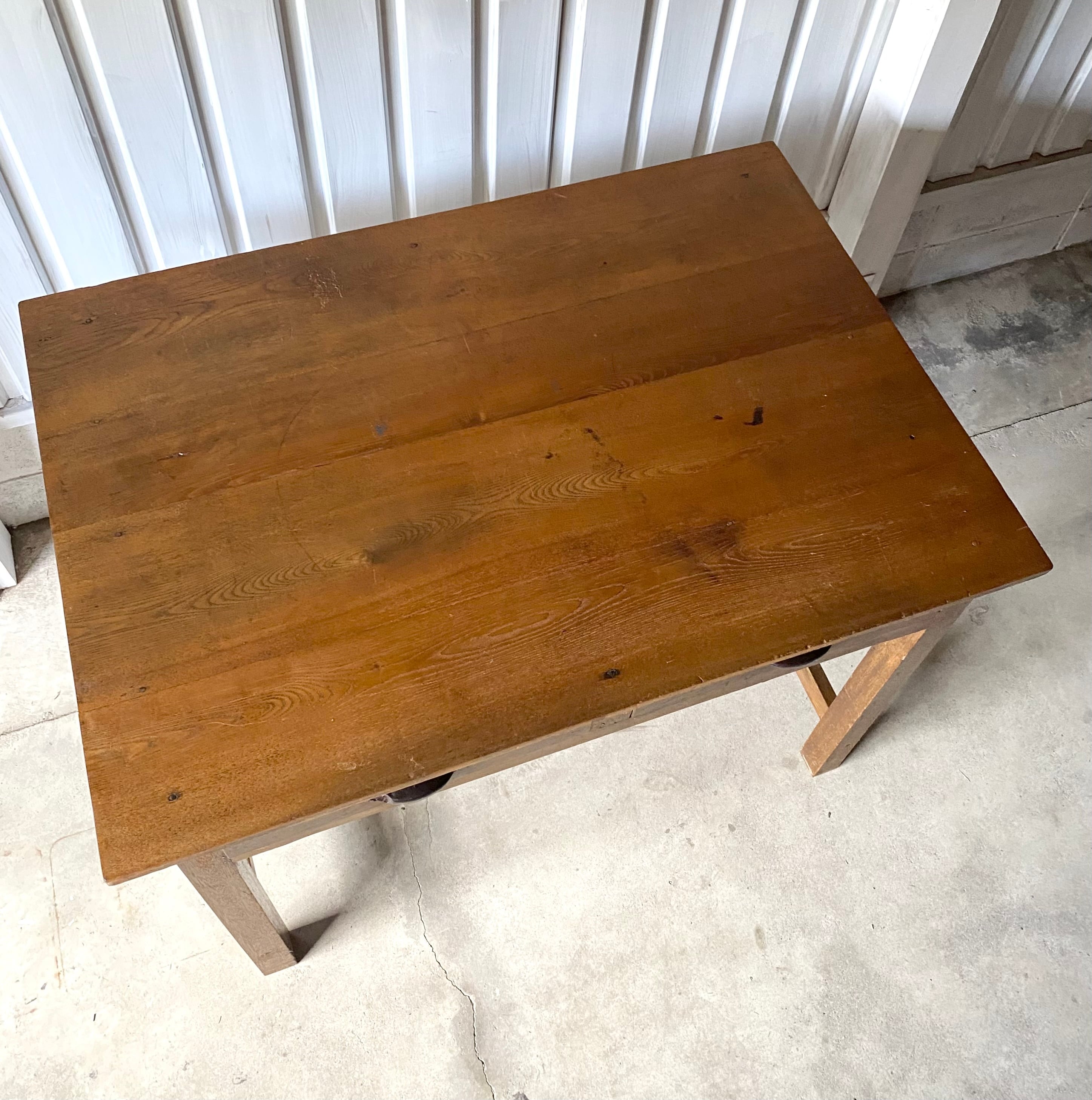 古い木製デスクになります。スレや剥げ、反り、当たりキズ、サビ、落としきれない汚れなどがあります。少しのがたつきはありますが、全体的に状態も良いのでまだまだ実用的に活躍してくれます。