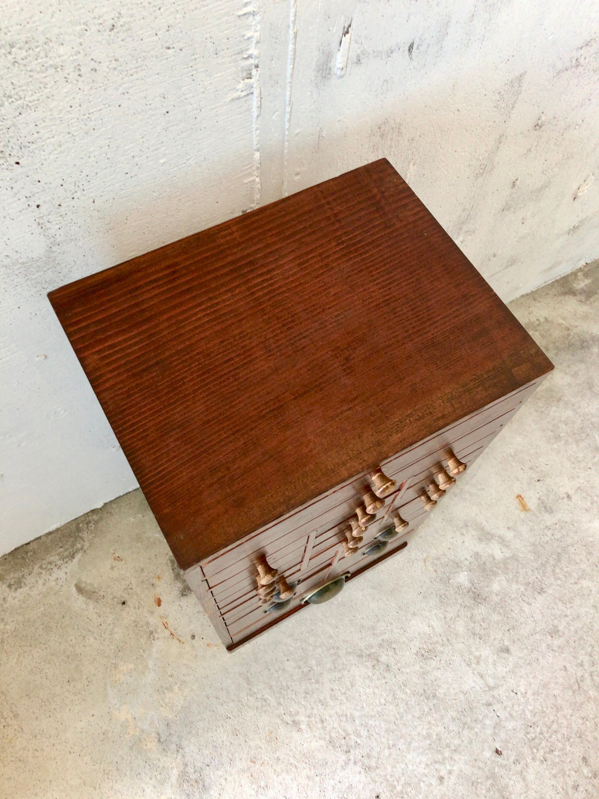 経年変化の良い木肌、味のある取手が雰囲気の良い収納棚。引出し中は少し汚れがありますが、開閉はスムーズに行え日常気軽にお使いいただけます。リビング、作業場などの棚横やテーブル脇で細々したもの、パーツ、ステーショナリーの整理にも役立ちそうです。