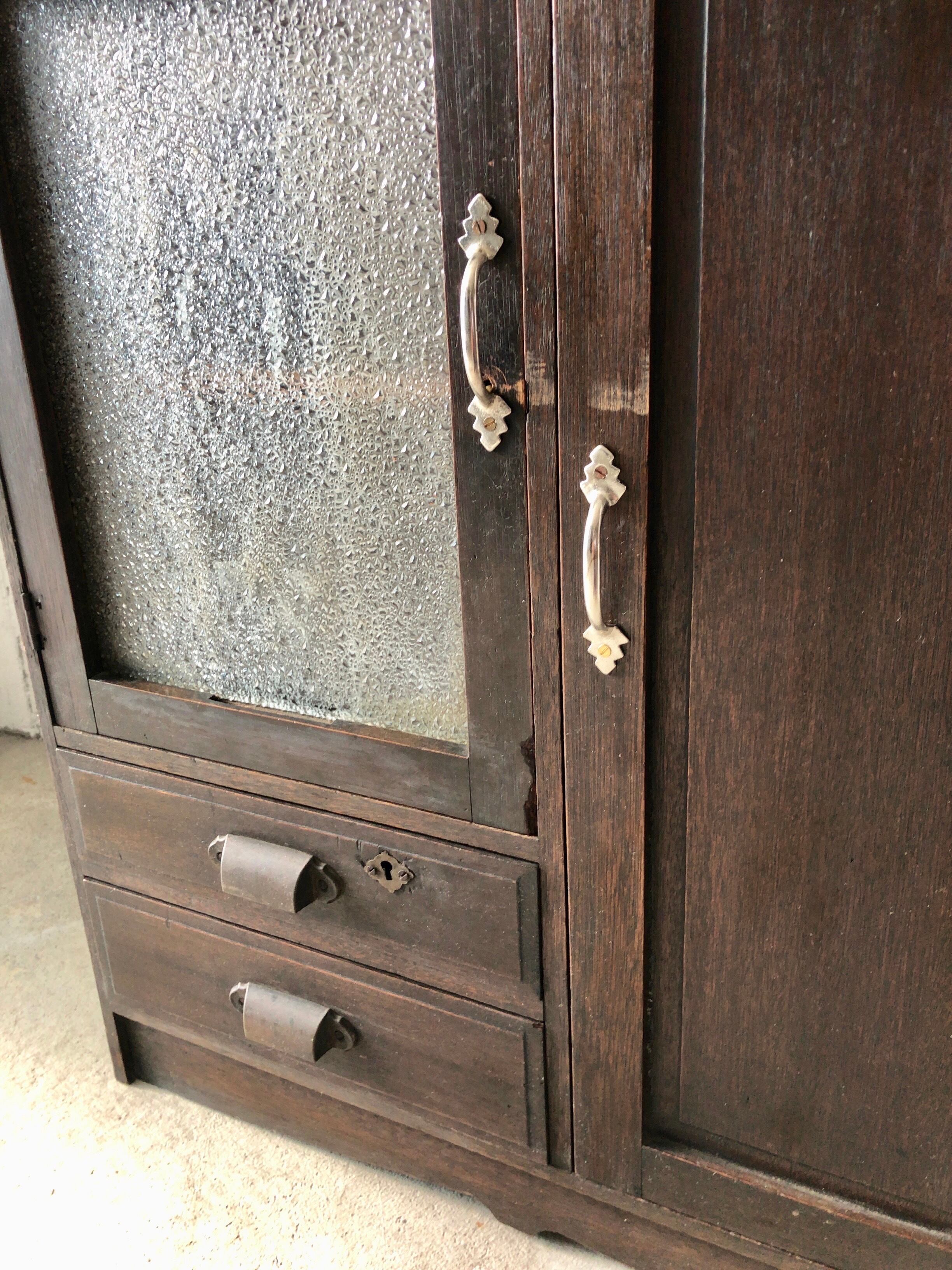 古い収納棚になります。スレや欠け、割れ、当たりキズ、落としきれない汚れなどがあります。引出しはB5サイズが入る大きさです。扉戸のガラスは特に割れもなく、開閉は比較的スムーズに行え、使用上問題なくお使いいただけます。収納中の板は取り外し出来ます。全体的に状態も良いのでまだまだ実用的に活躍してくれます。