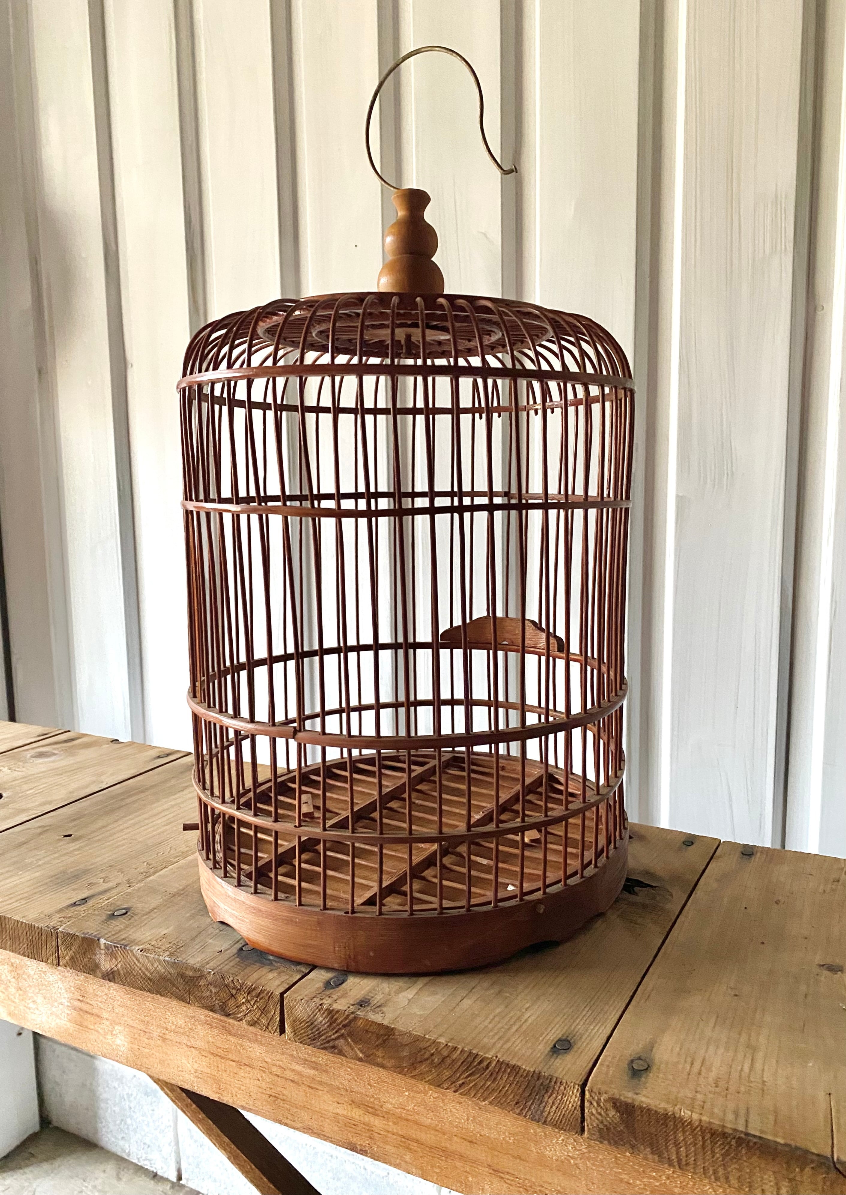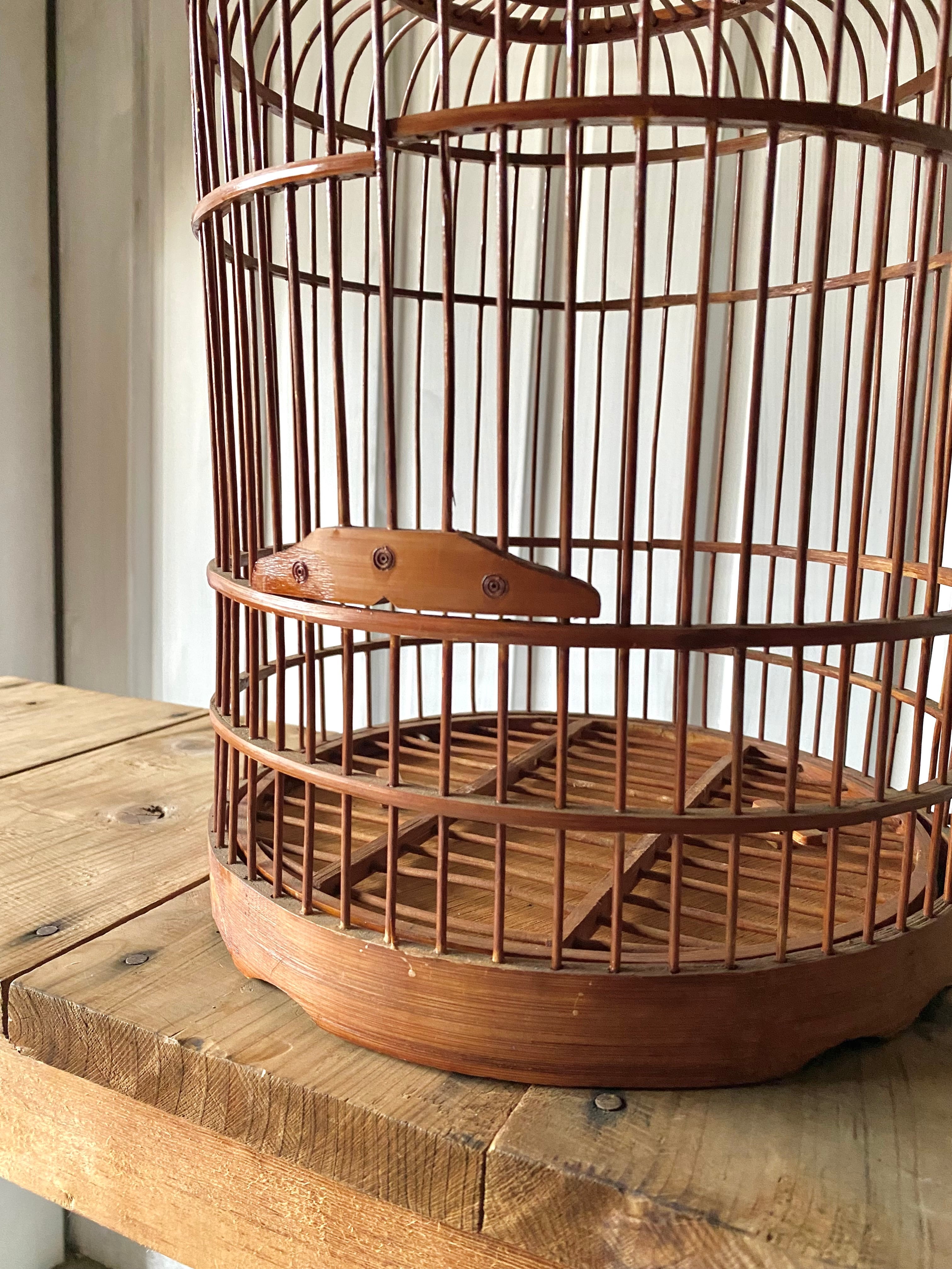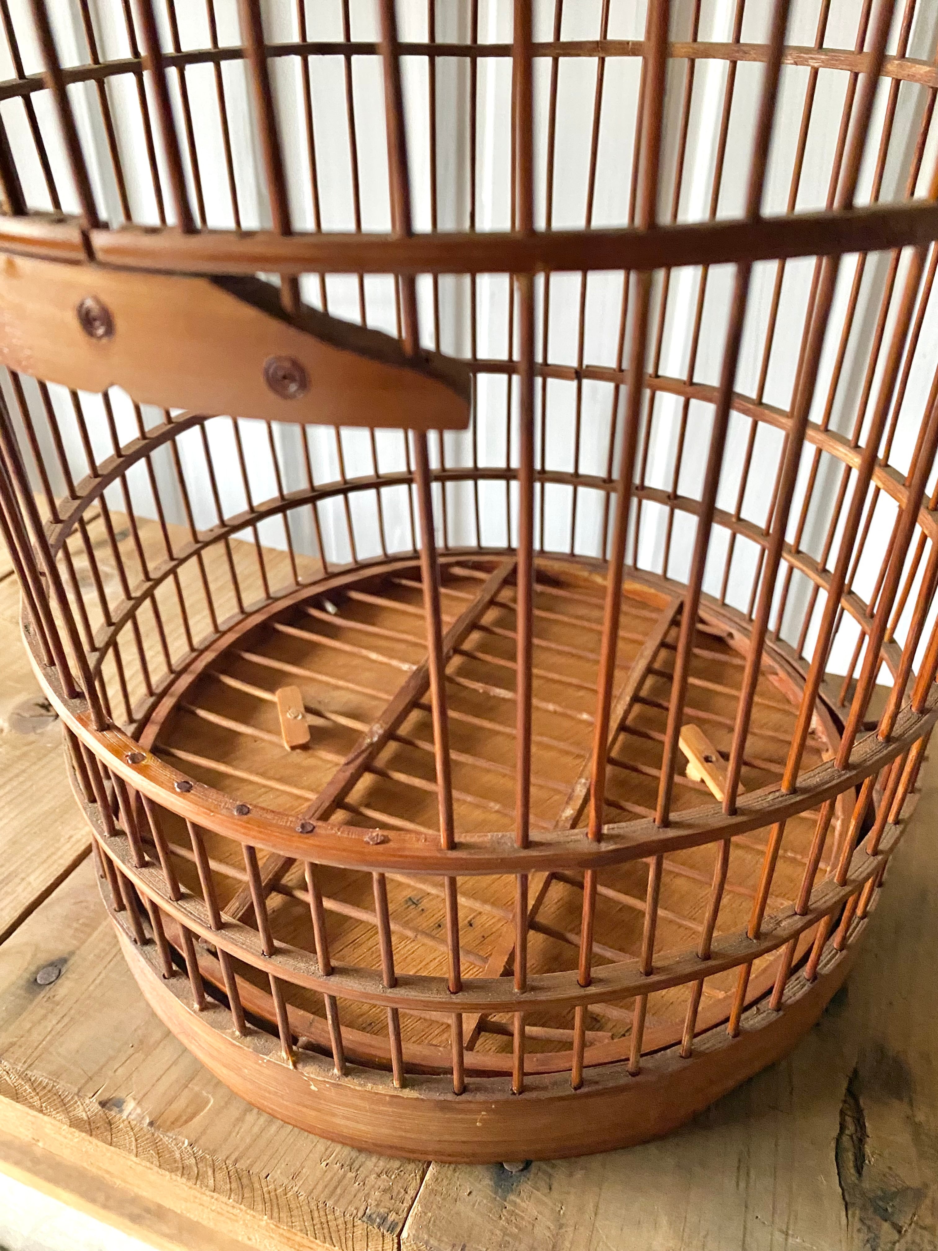 古い鳥籠になります。スレや剥げ、割れ、反り、当たりキズ、落としきれない汚れなどがあります。籠の入口は比較的スムーズに開閉出来ます。全体的に状態も良いのでまだまだ実用的に活躍してくれます。