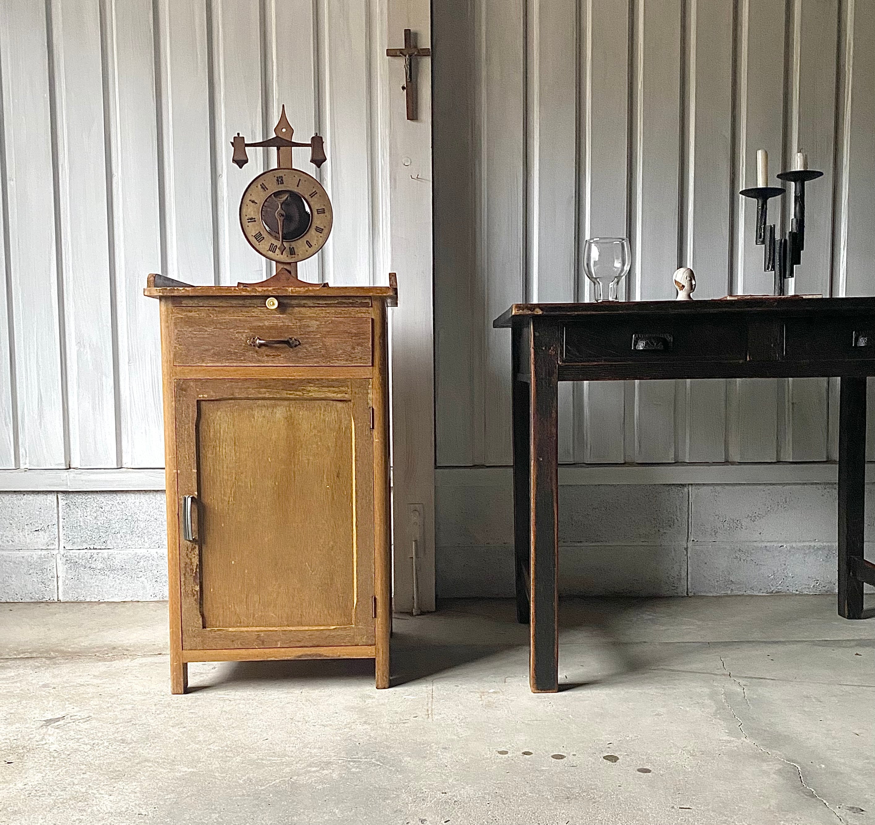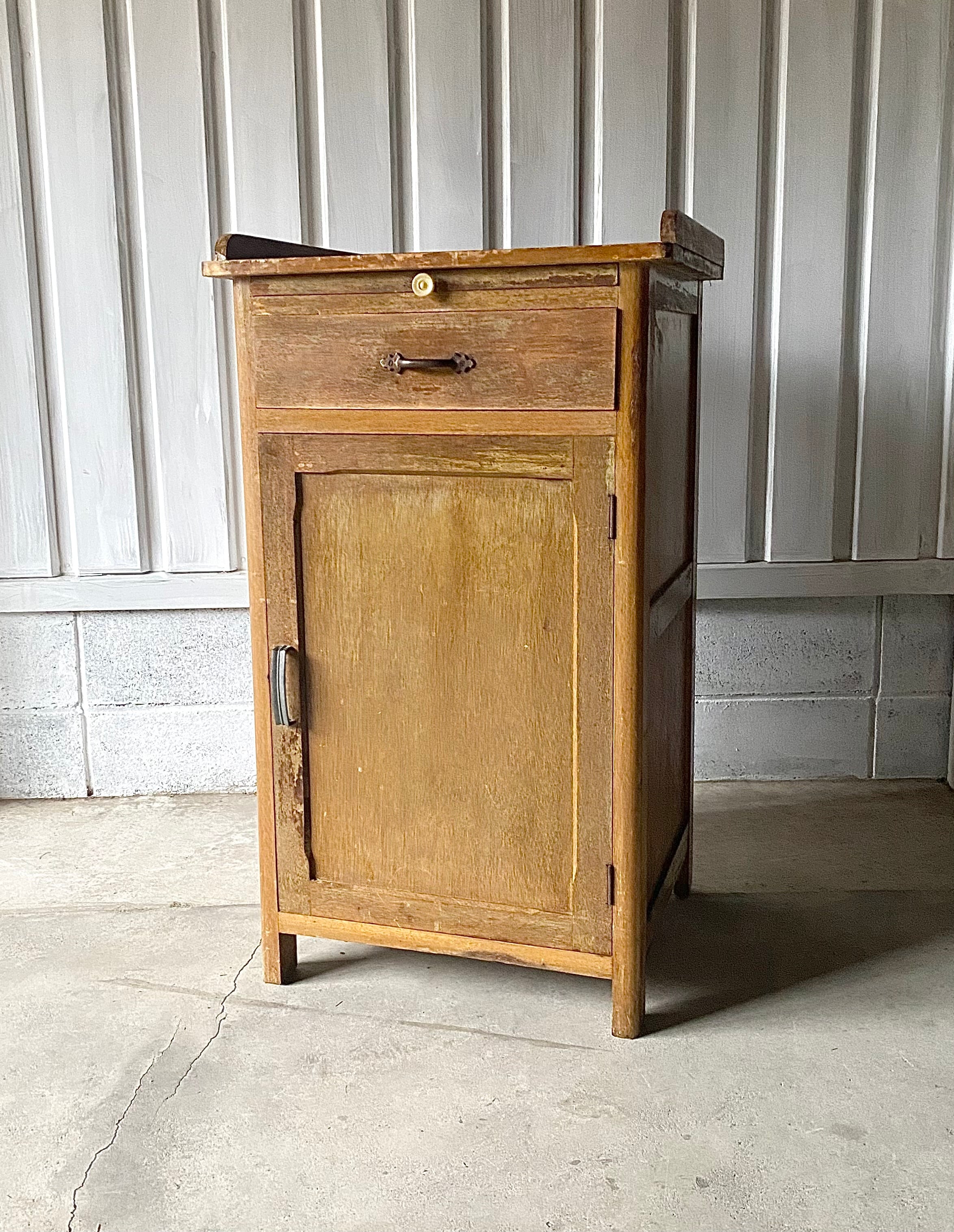 経年変化の味のある木肌と木製取手、すらっとした姿が感じ良い袖机。引出し、スライド式天板、扉戸収納もあり、収納力、使い勝手も良いです。テーブル脇に置いて本や書類、小物の収納としてや、キッチンで食器やスパイスのストック棚としても素敵です。