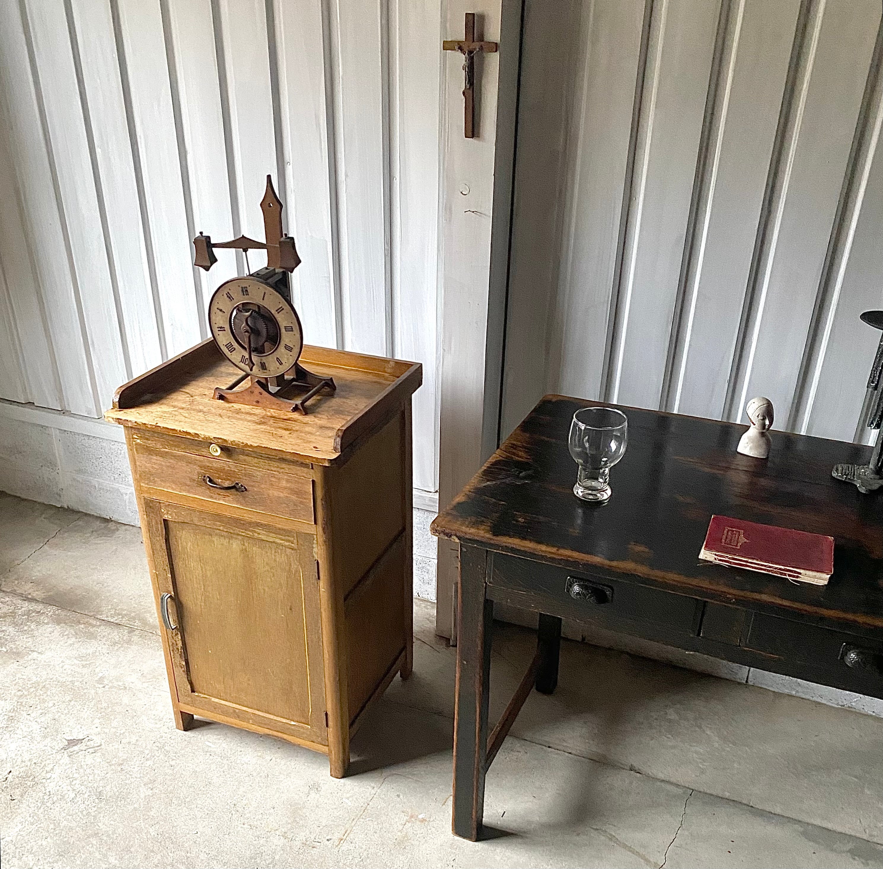 古い袖机になります。スレや剥げ、割れ、反り、サビ、当たりキズ、落としきれない汚れなどがあります。扉戸、引出し、スライド式天板の開閉は比較的スムーズに行なえます。全体的に状態も良いのでまだまだ実用的に活躍してくれます。