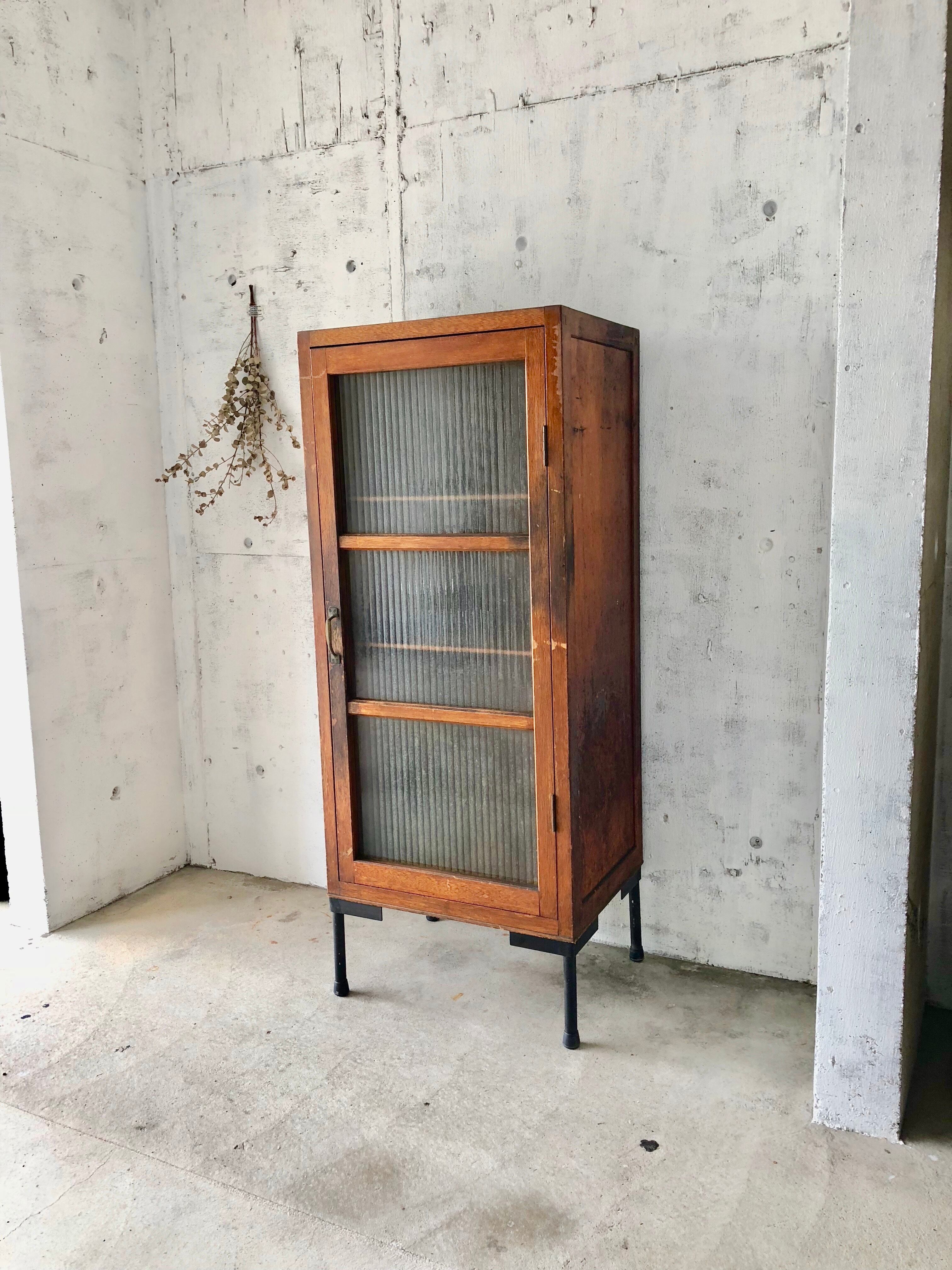 古いキャビネットになります。スレや欠け、割れ、当たりキズ、落としきれない汚れなどがあります。扉戸のガラスは特に割れもなく、開閉は比較的スムーズに行え、使用上問題なくお使いいただけます。全体的に状態も良いのでまだまだ実用的に活躍してくれます。