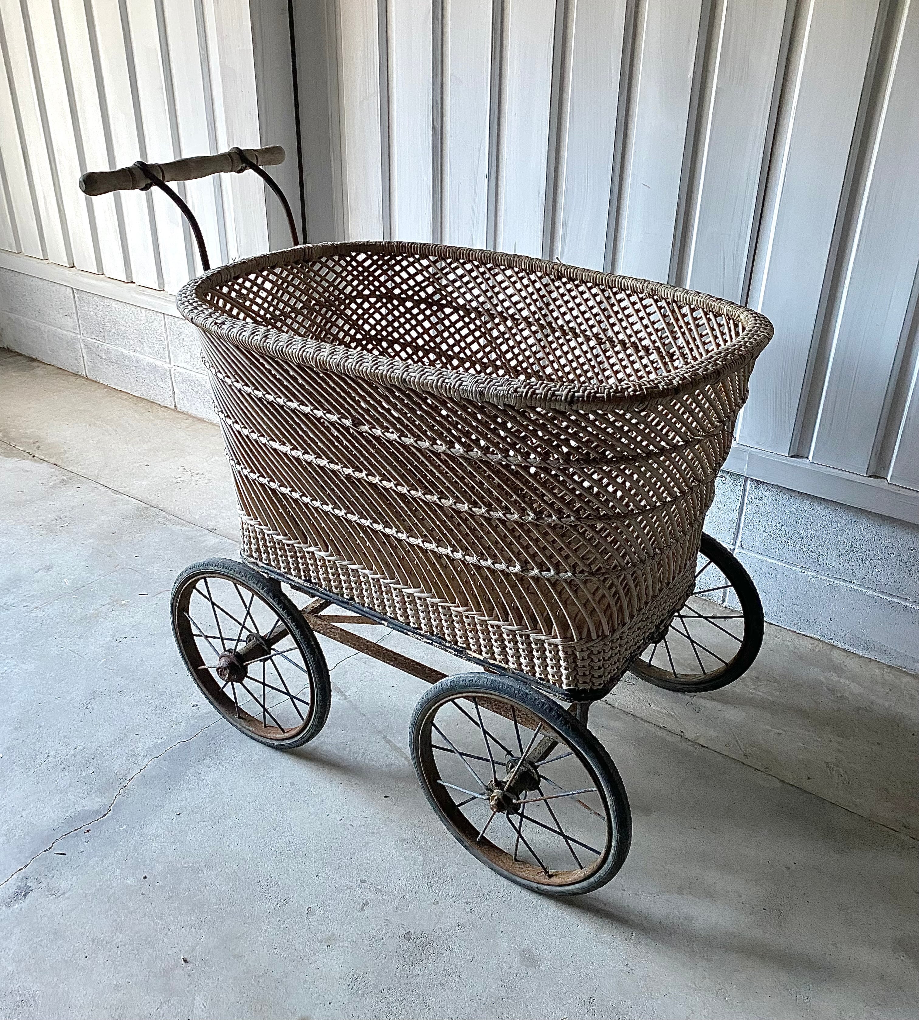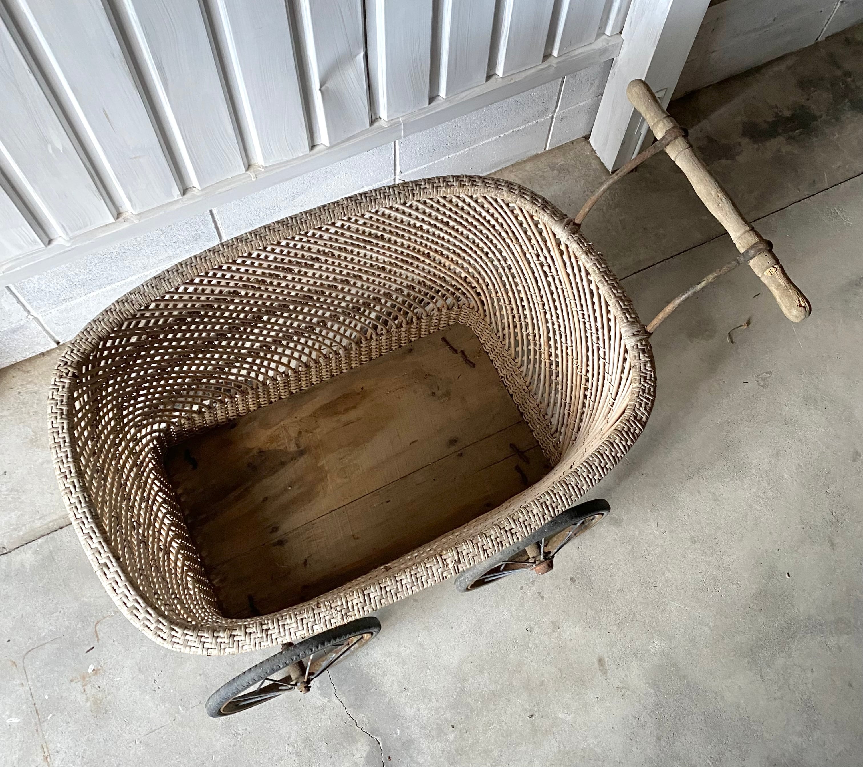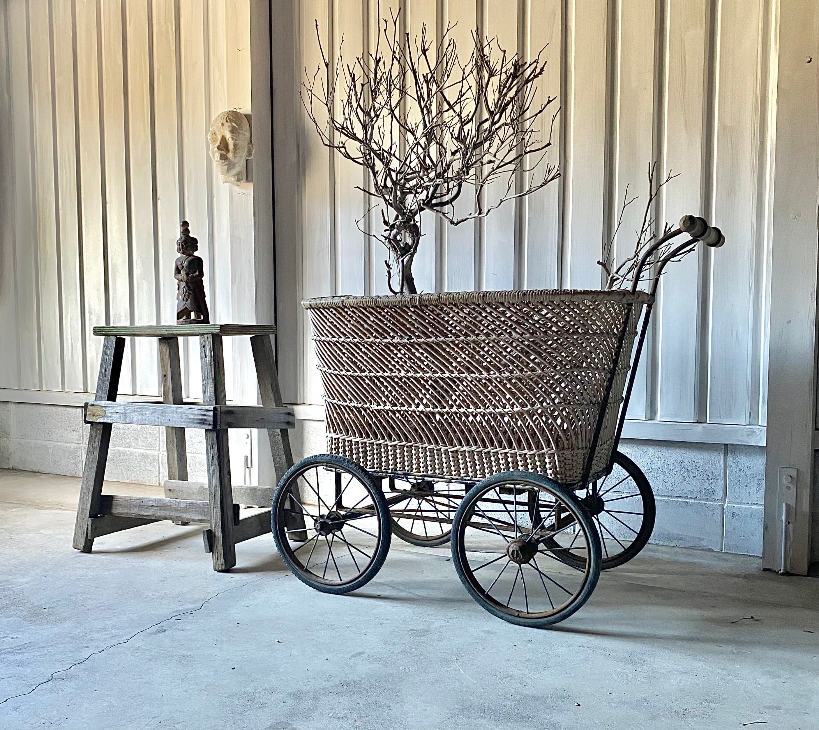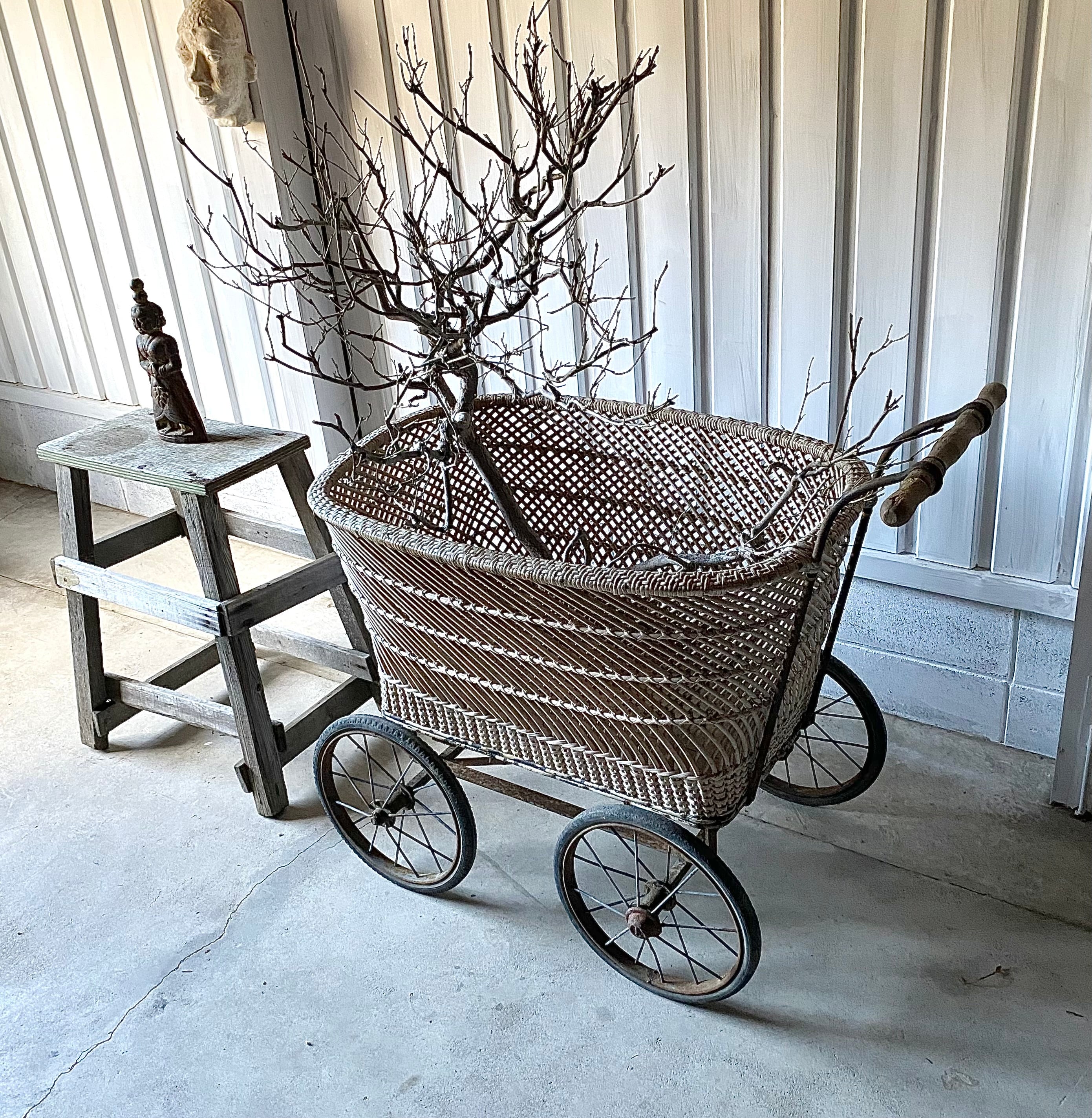 使い込まれた雰囲気良い姿、存在感のある佇まいが魅力的な乳母車。車輪の動作は比較的スムーズに行えます。リビングやガーデニングで植物を入れてディスプレイしたり、お店の店舗什器としてもおすすめです。