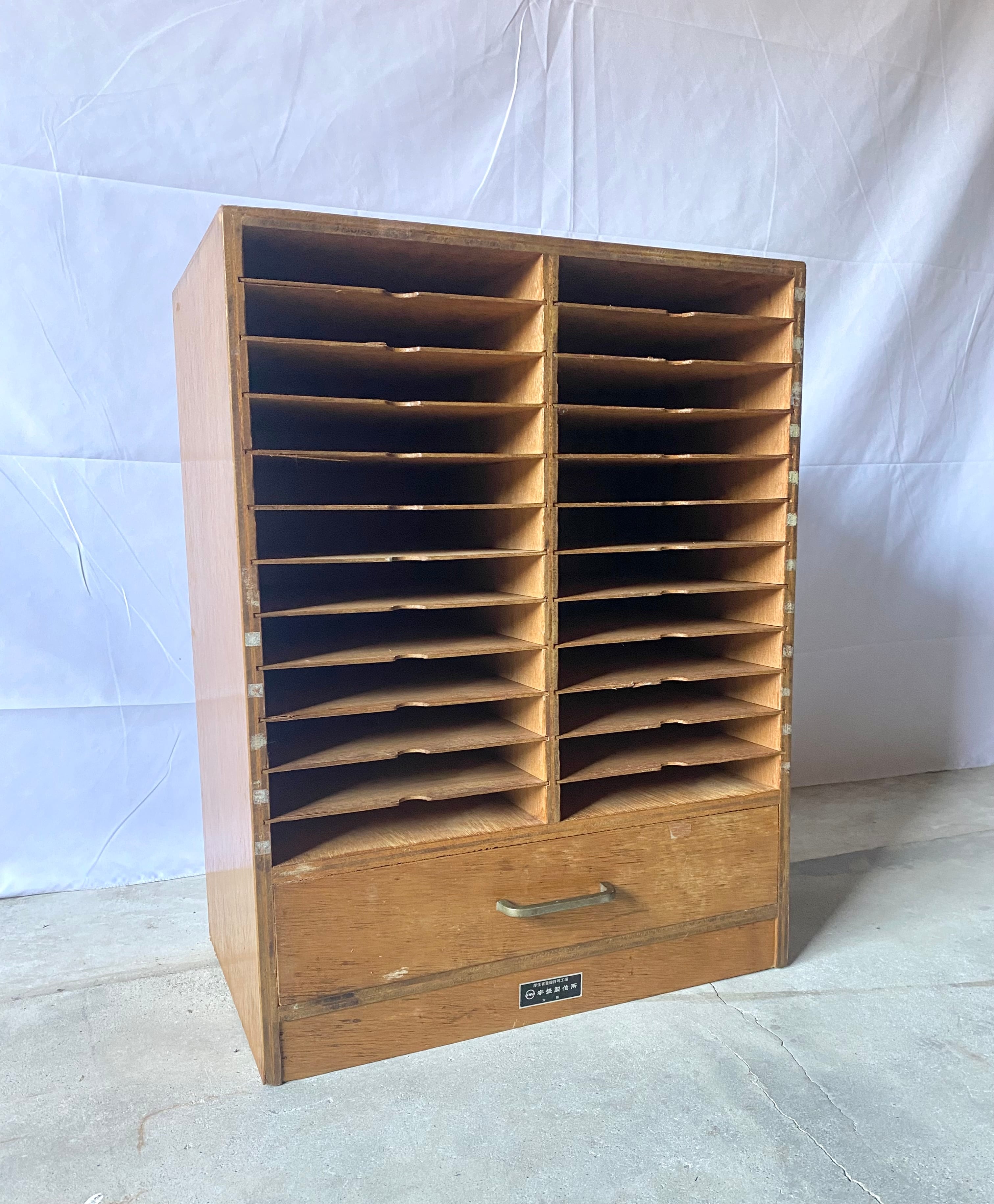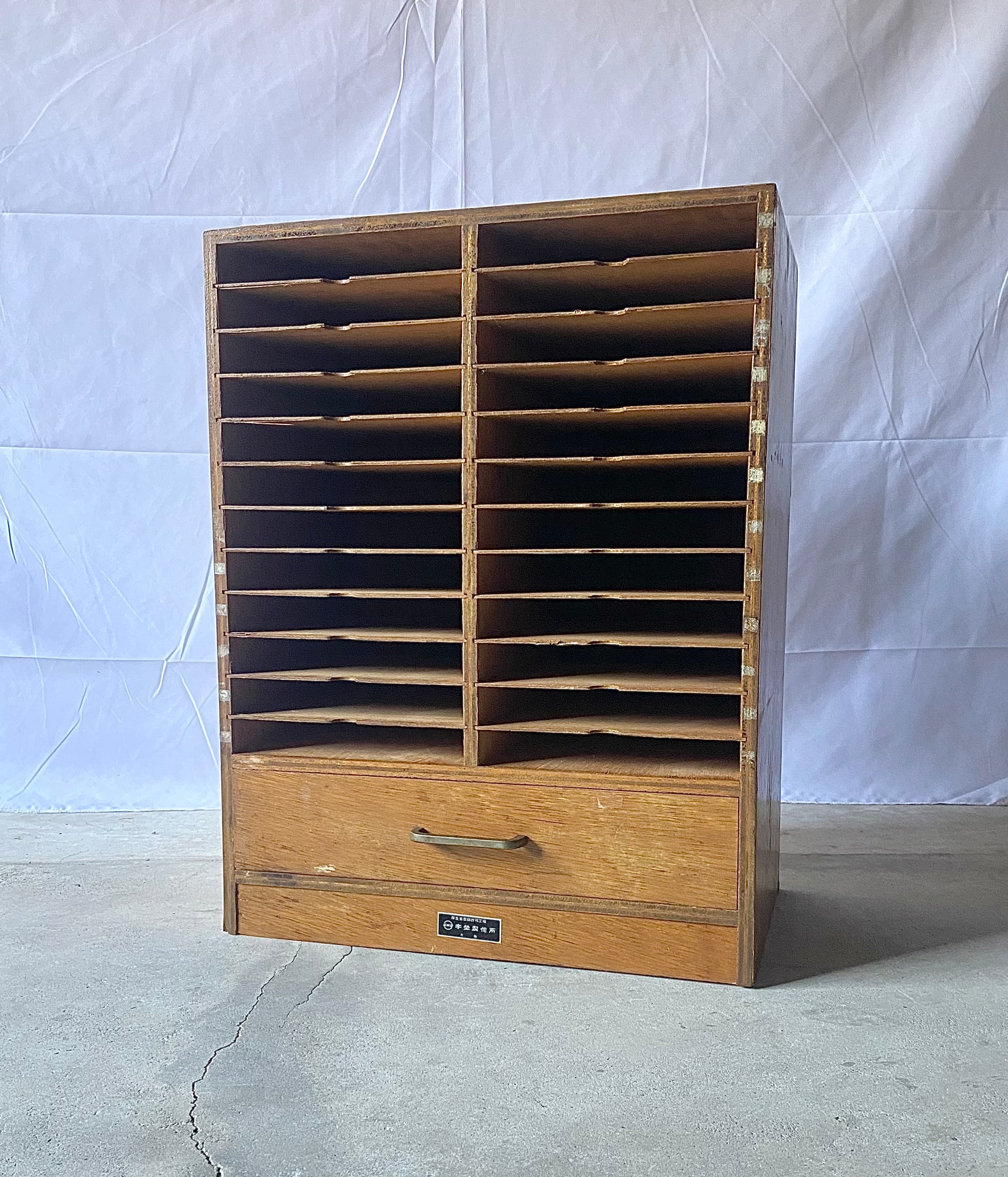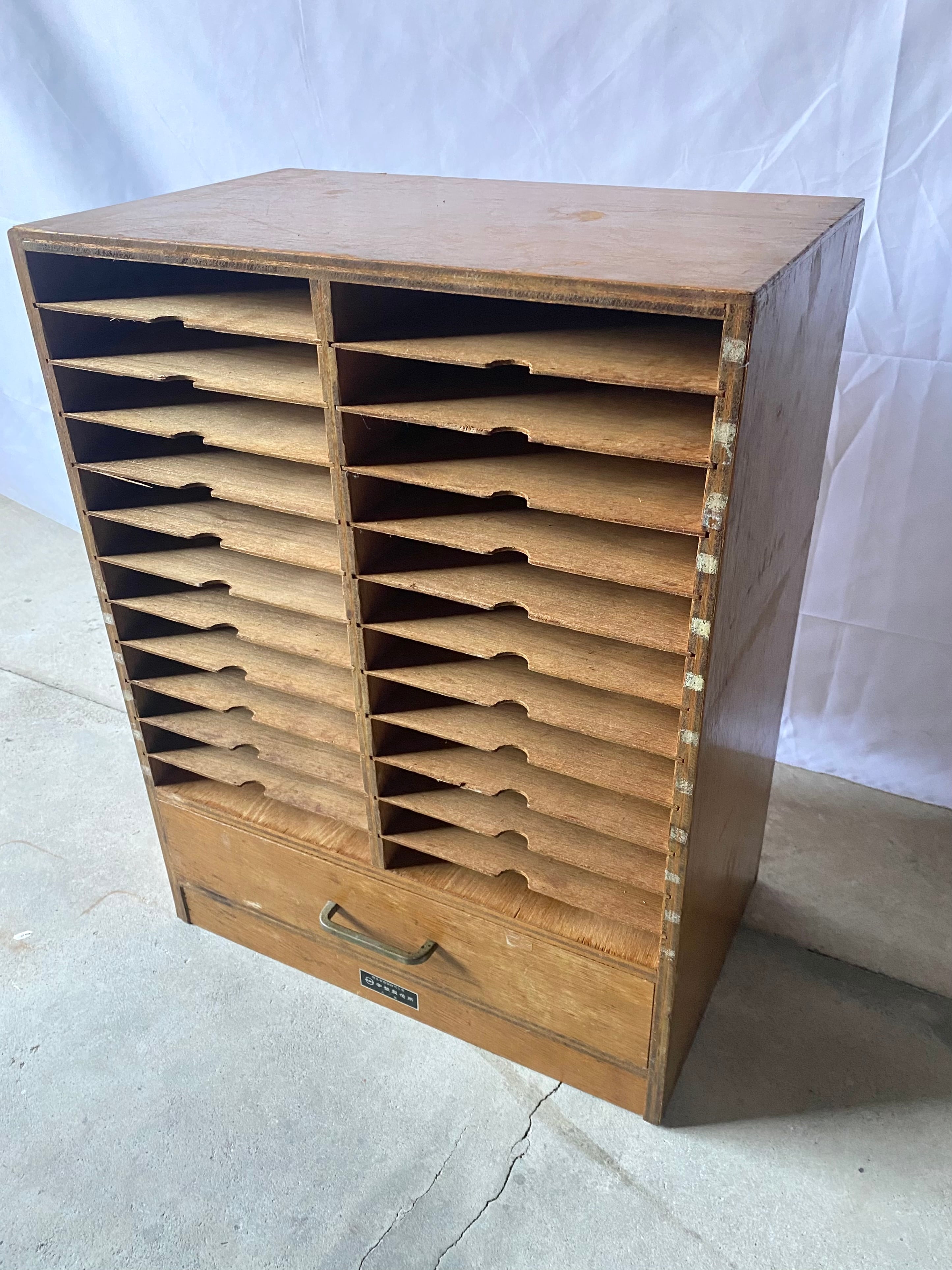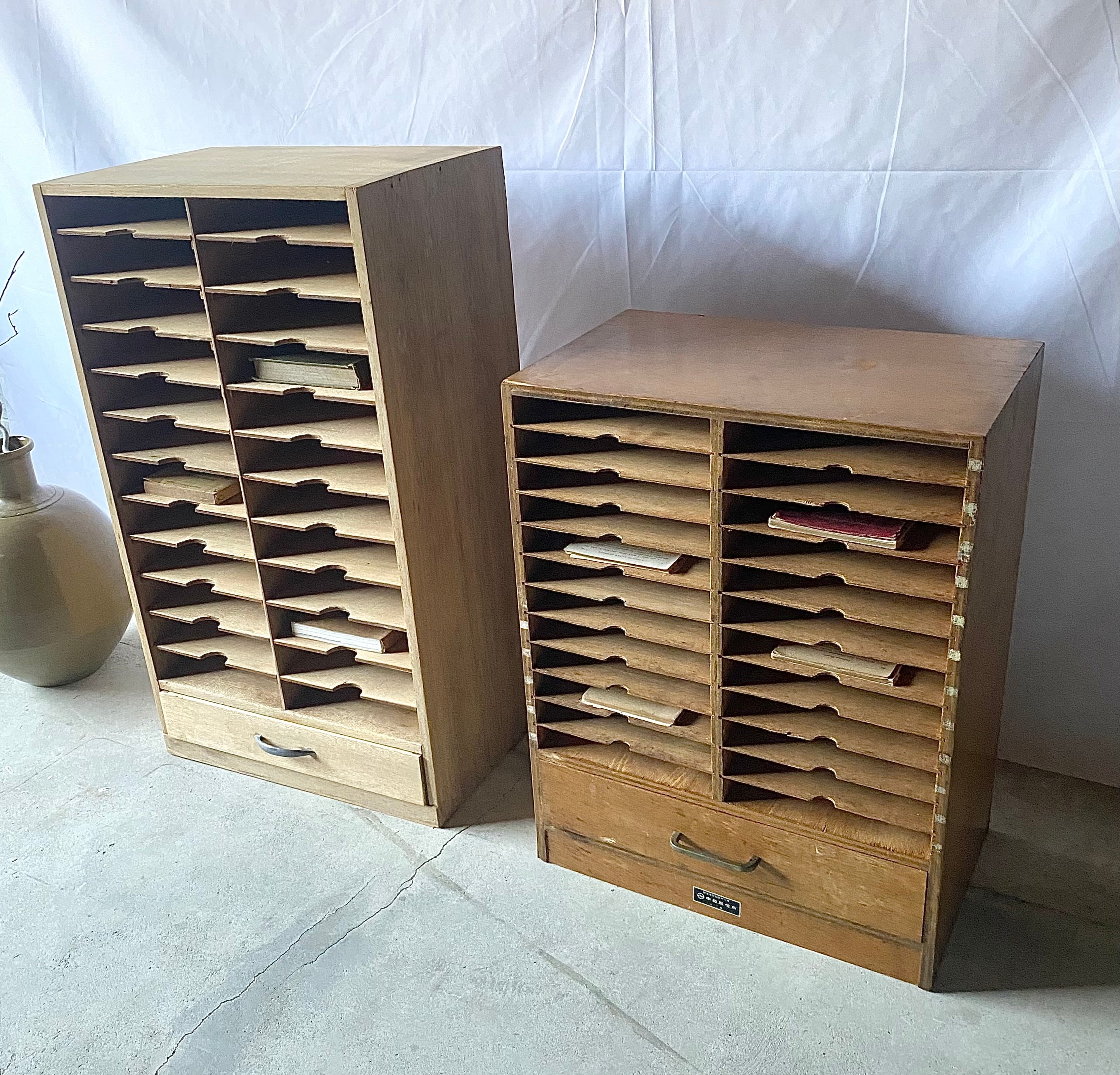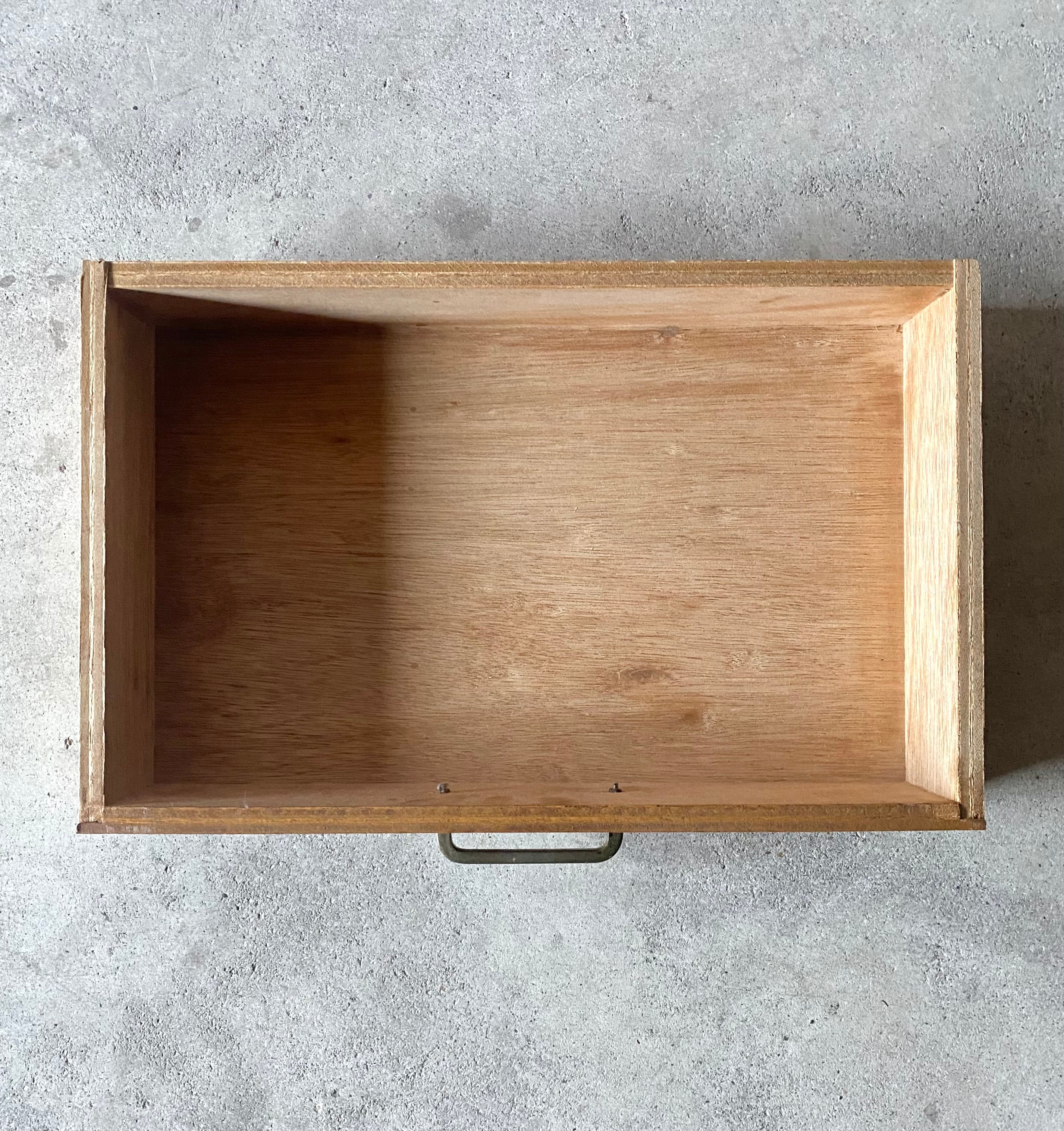 古いカルテケースになります。スレや欠け、当たりキズ、反り、禿げ、サビ、落としきれない汚れなどがあります。引出しの開閉は比較的スムーズに行え、中板は全て取り外し出来ます。全体的に状態も良いのでまだまだ実用的に活躍してくれます。