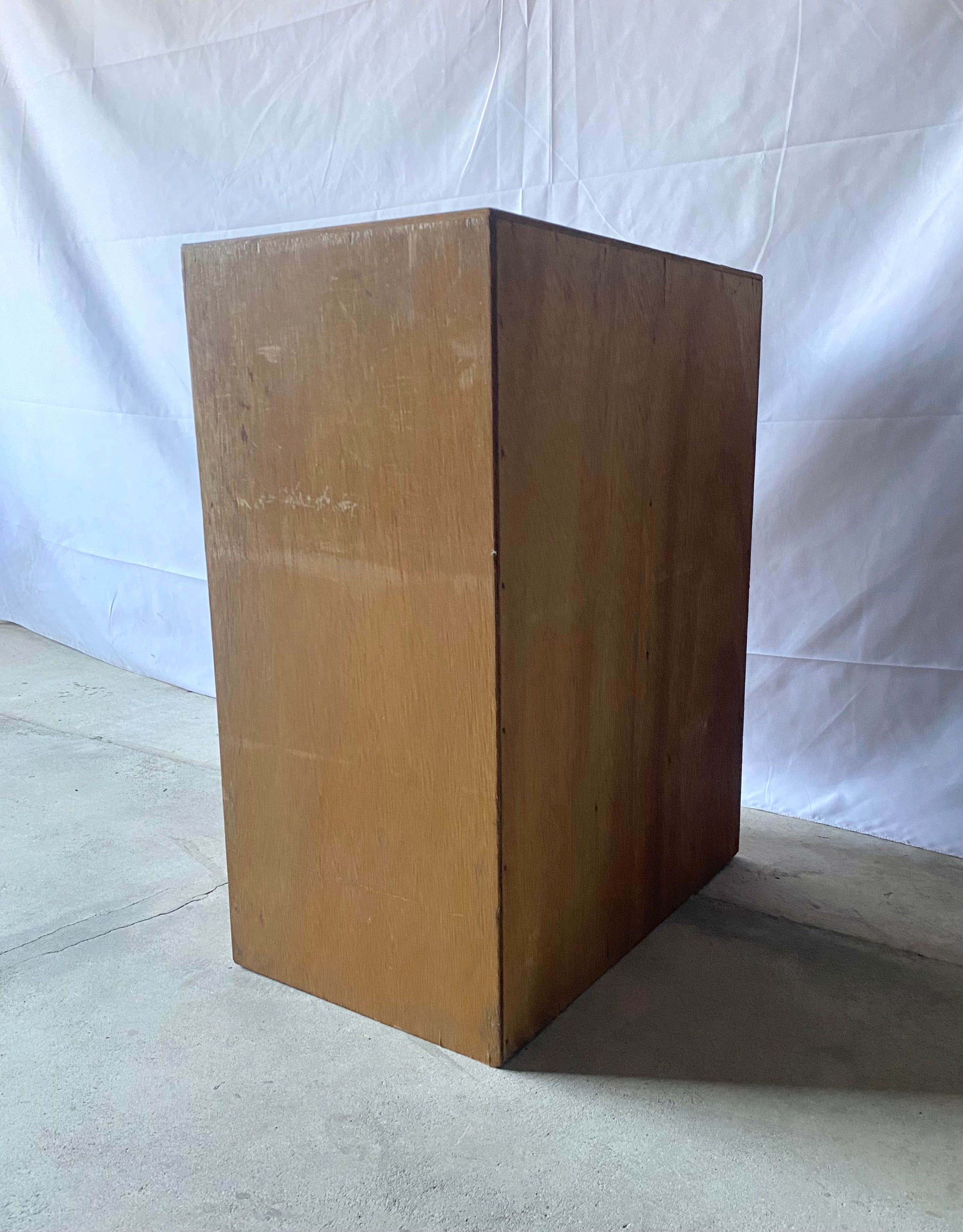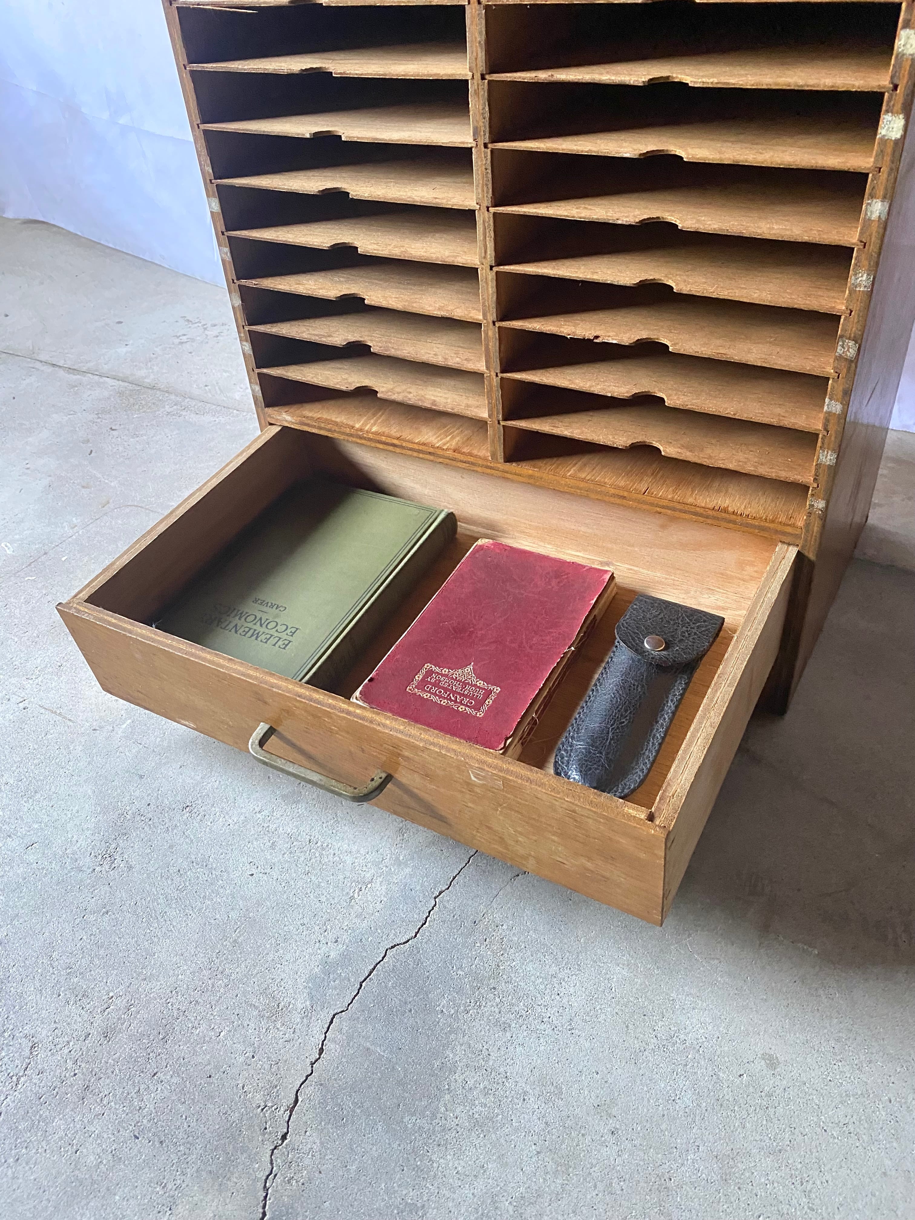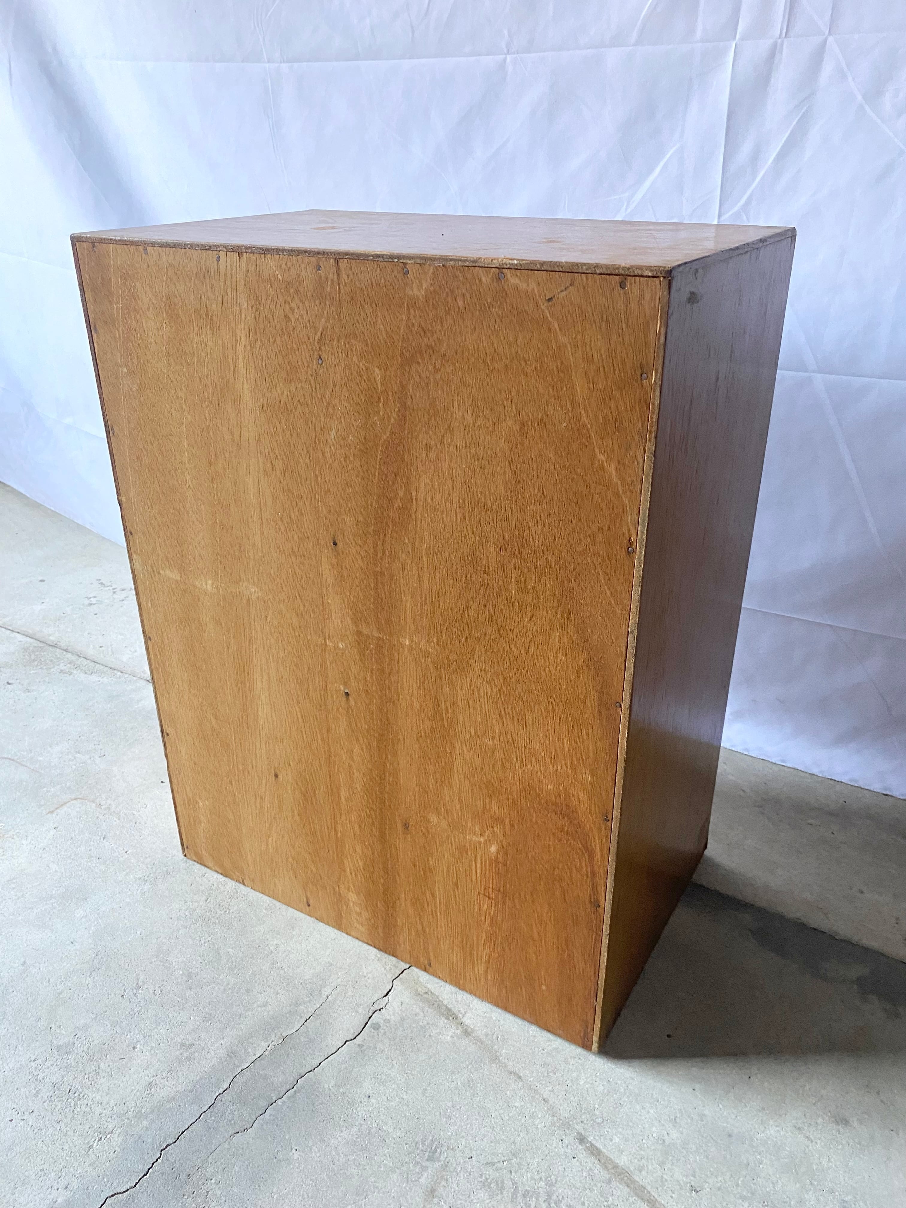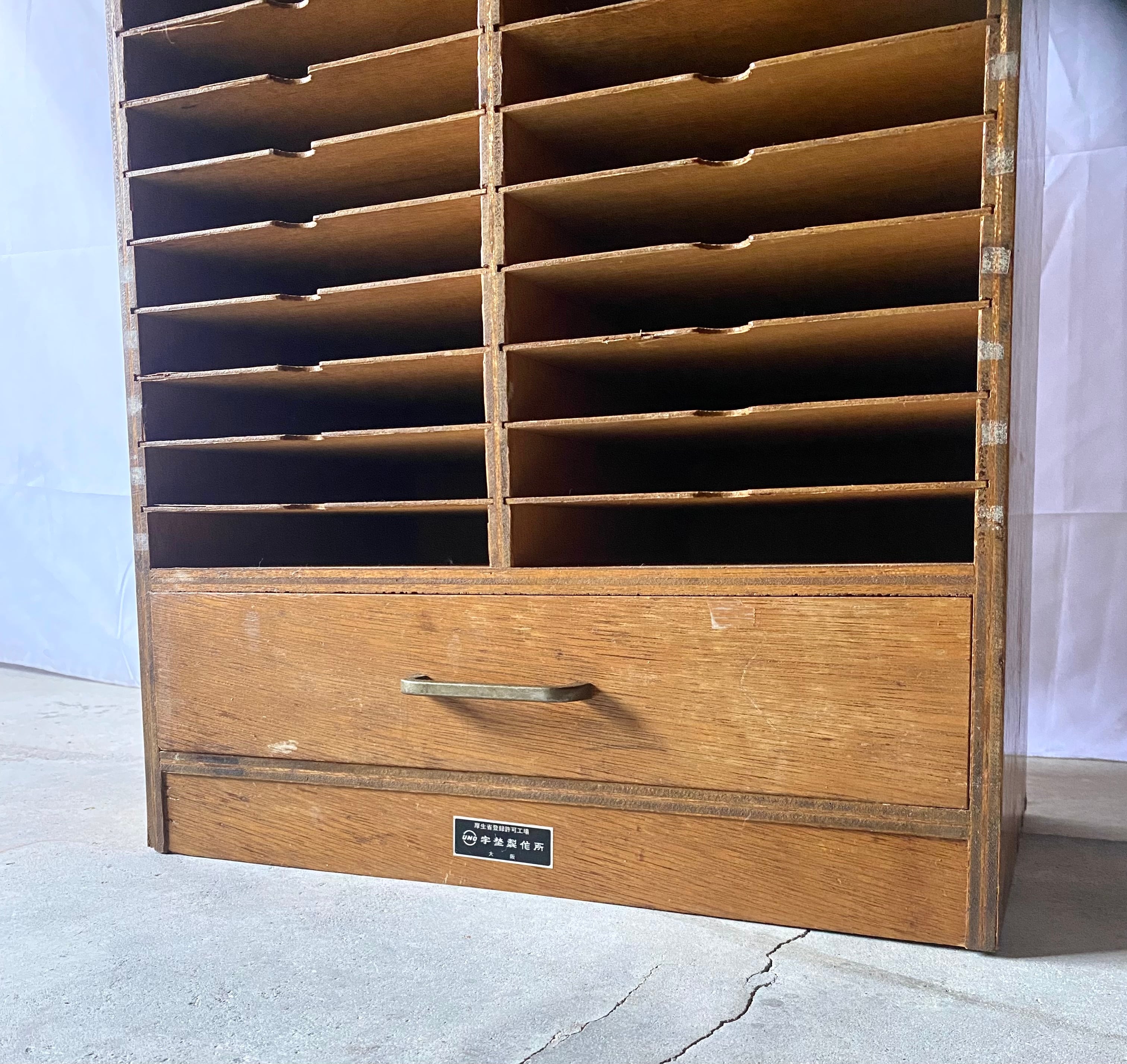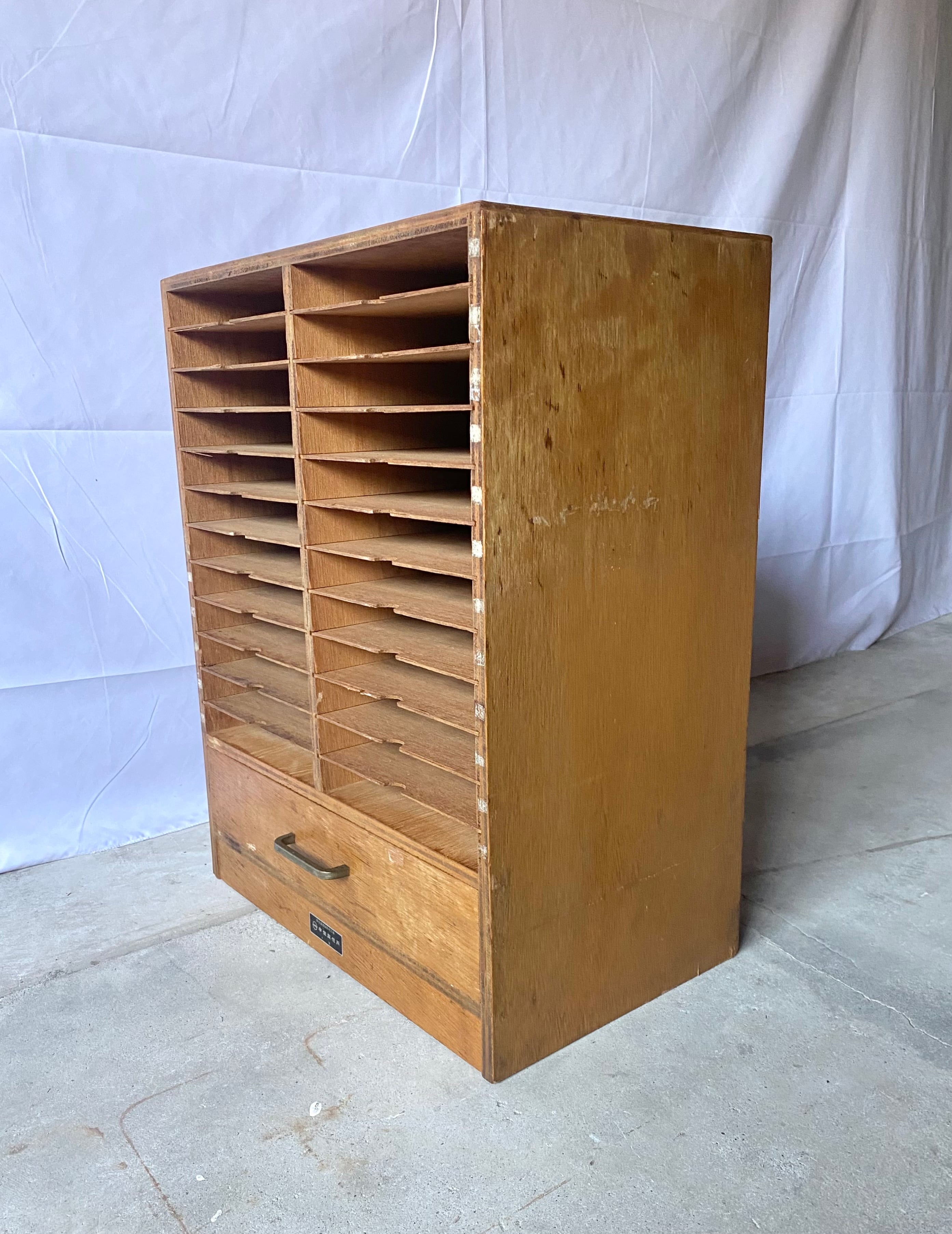 古いカルテケースになります。スレや欠け、当たりキズ、反り、禿げ、サビ、落としきれない汚れなどがあります。引出しの開閉は比較的スムーズに行え、中板は全て取り外し出来ます。全体的に状態も良いのでまだまだ実用的に活躍してくれます。